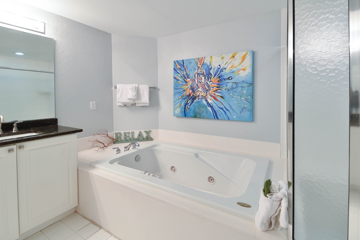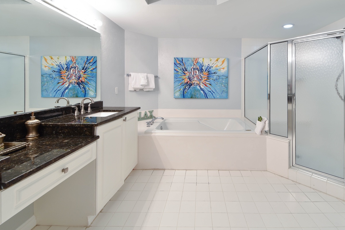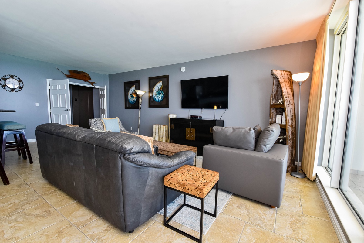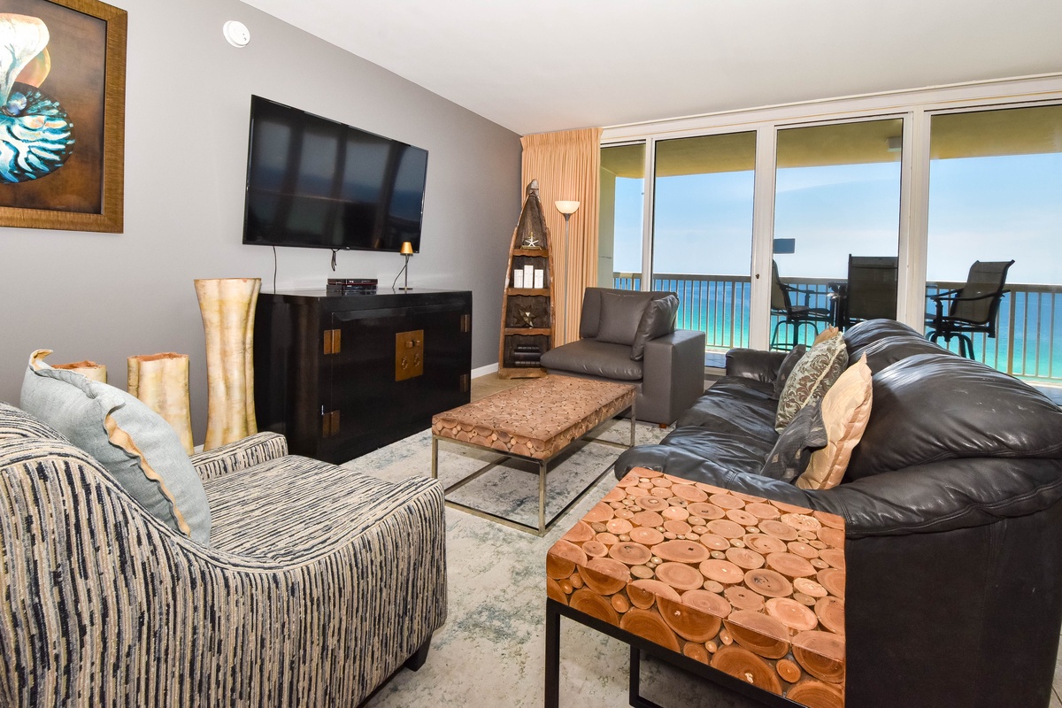 The master bedroom has incredible beach views and private access to the beach-facing balcony. Complete with a king bed, flat-screen TV, and private ensuite bathroom, the master bedroom was designed with relaxation in mind. The master bathroom features a luxurious jacuzzi tub, walk-in shower, and double vanity. Both guest bedrooms face the north side of the resort and offer unbeatable views of the resort grounds. The first guest bedroom has a king bed, a flat-screen TV, and private access to the north balcony. The second guest bedroom has two twin beds with twin trundle beds, a flat-screen TV, and private access to the north balcony. The second guest bedroom has a private bathroom with a tub/shower combination. Just steps from both the first guest bedroom and the living area is a full bathroom with a walk-in shower.