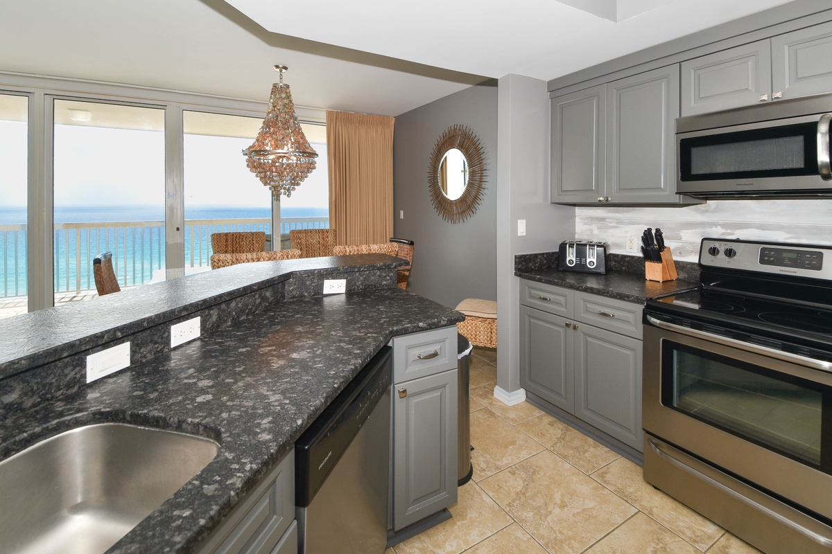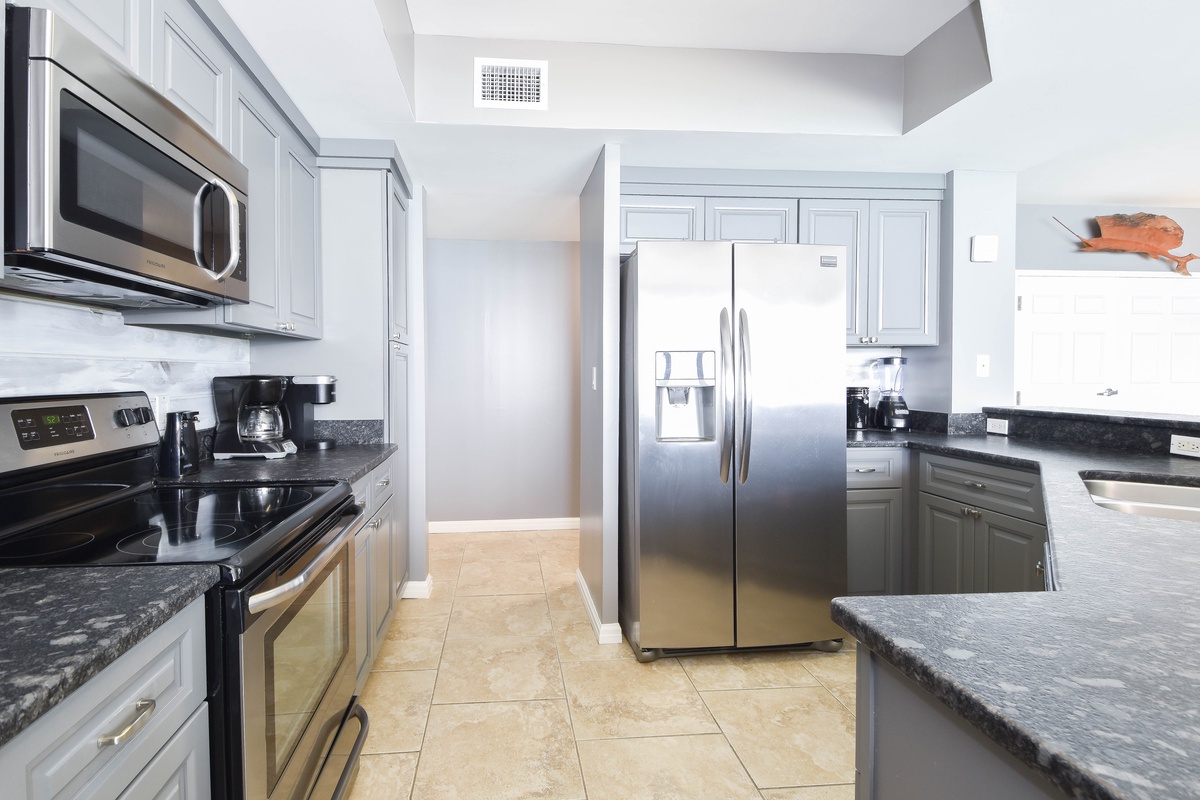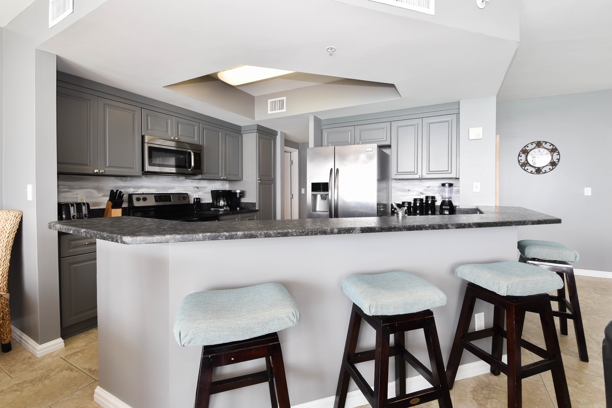 The interior spaces of Silver Shells St. Maarten 1404 have been tastefully decorated with a trendy beach theme. An open floor plan gives the whole family or group space to relax together. The living area is beach-facing, features floor-to-ceiling windows and sliding glass doors, and offers plenty of space to gather around the flat-screen TV. The couch even converts to a queen sleeper sofa for larger parties. The spacious beach-facing balcony is perfectly furnished to allow for entertaining or dining while taking in spectacular views of the white sand beach and emerald waters. The dining area has seating for five with four additional seats at the breakfast bar. The fully equipped kitchen includes full-size stainless steel appliances and all the cookware and dishware you could need for creating memorable meals. A laundry area is centrally located in the condo with a full-size washer and dryer.