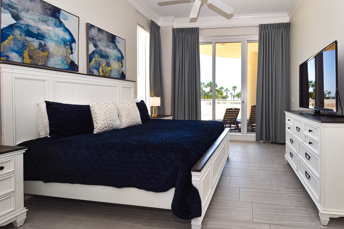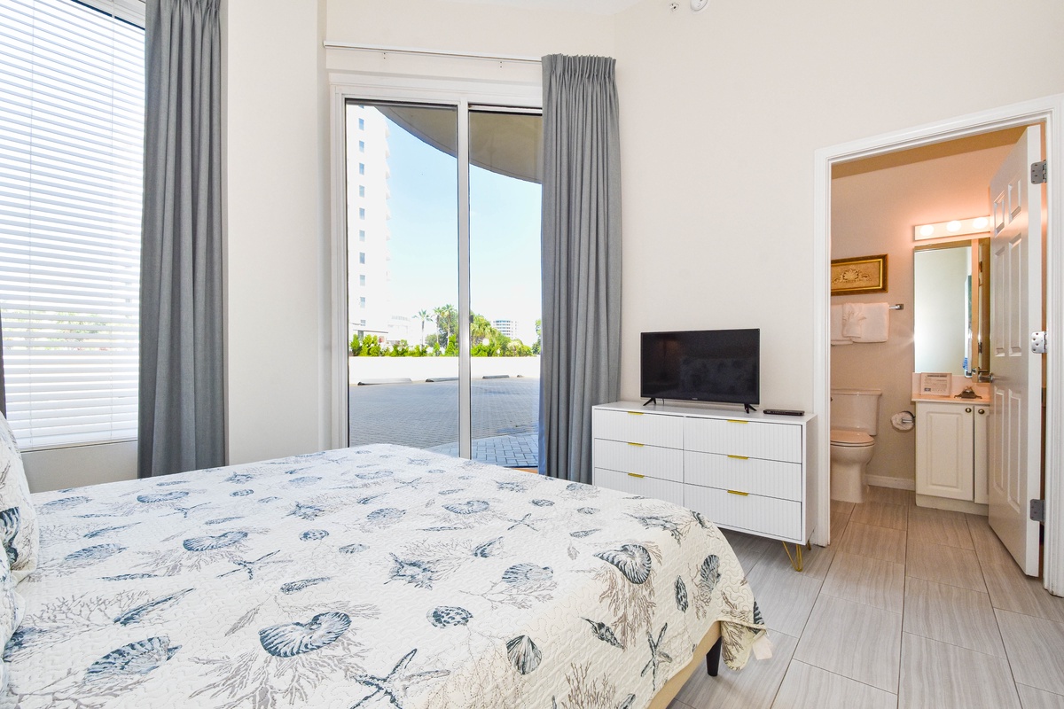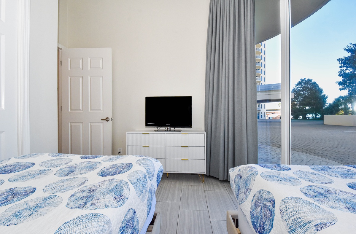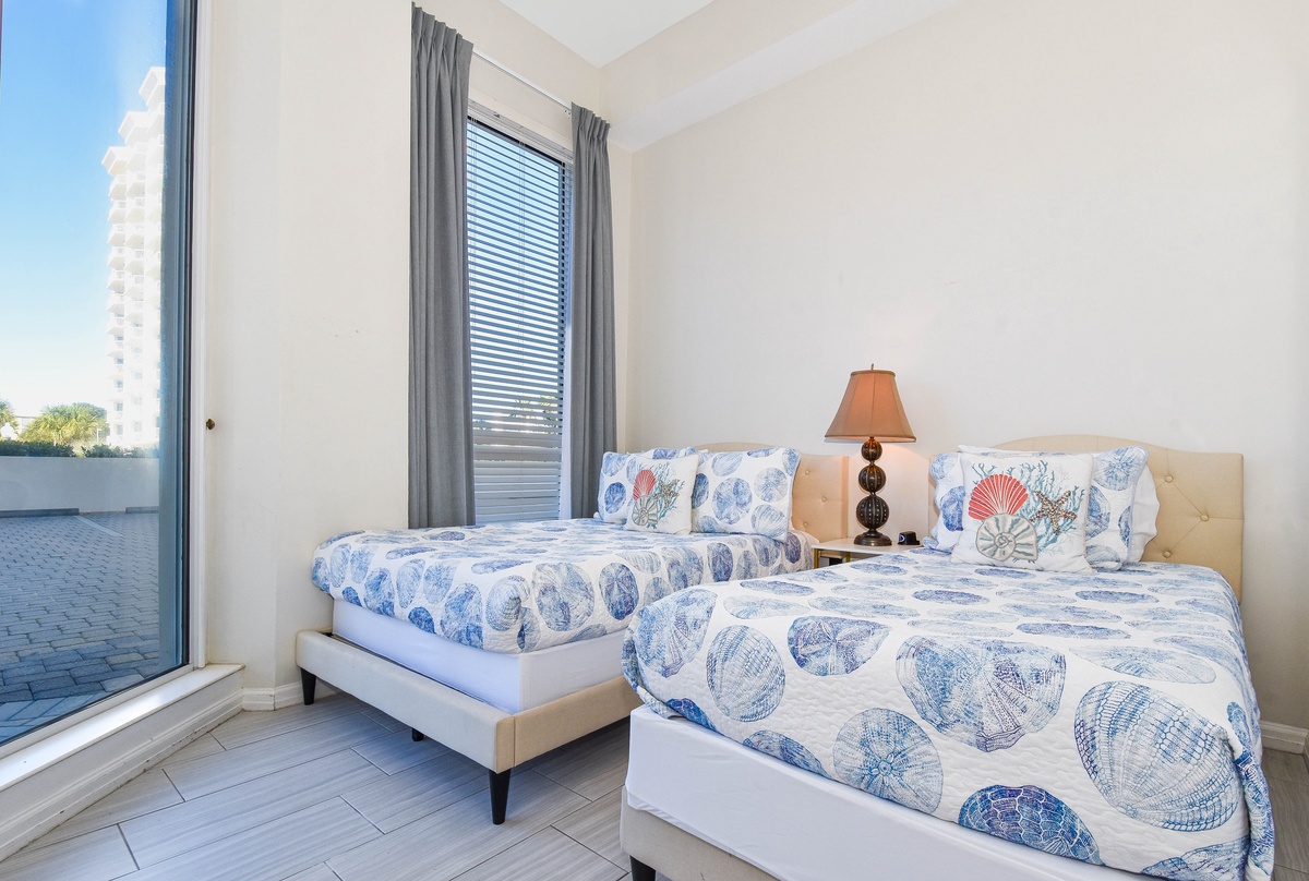 The master bedroom has incredible views and private access to the beach-facing patio. Complete with a king bed, flat-screen TV, and private ensuite bathroom, the master bedroom was designed with relaxation in mind. The master bathroom features a jacuzzi tub, walk-in shower, and double vanity. Both guest bedrooms face the north side of the resort and offer unbeatable views of the resort grounds. The first guest bedroom has a king bed, a flat-screen TV, and private access to the north patio. This guest bedroom has a private bathroom with a tub/shower combination. The second guest bedroom has a twin bed as well as a full bed, a flat-screen TV, and private access to the north patio. Just steps from both the guest bedroom and the living area is a full bathroom with a tub/shower combination.