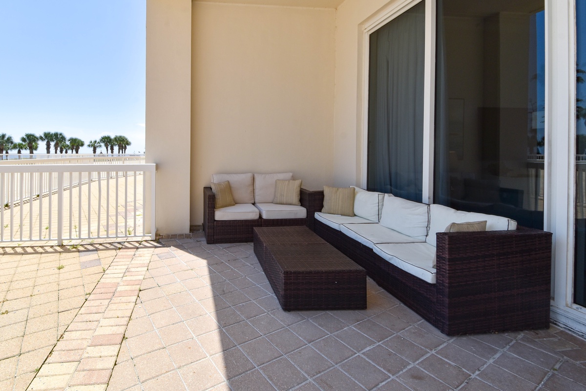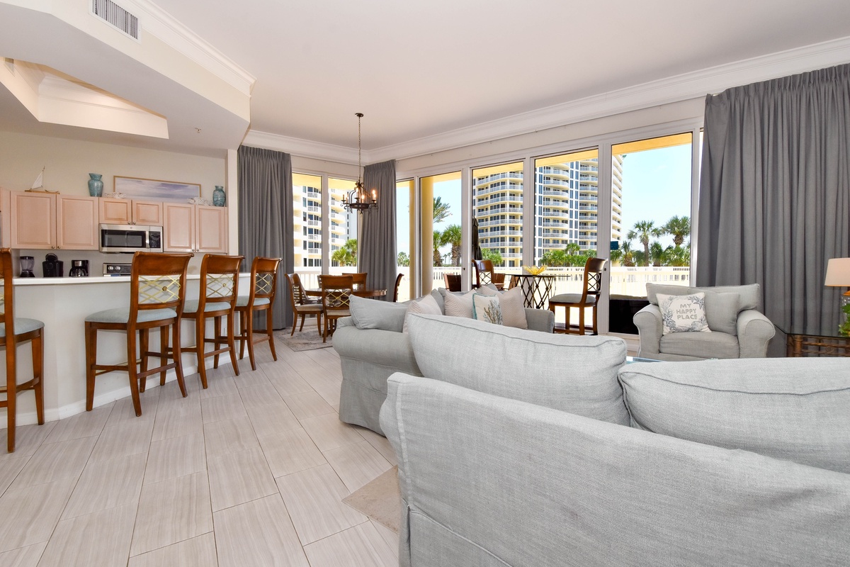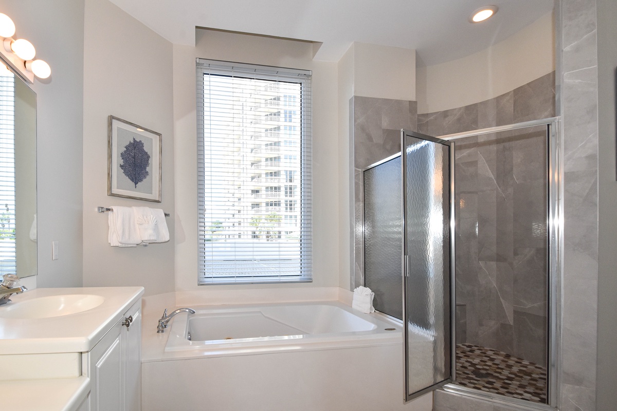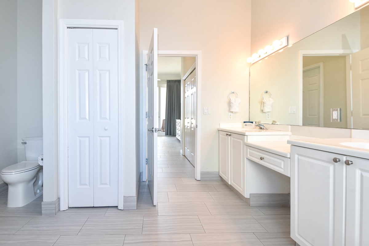 The master bedroom has incredible views and private access to the beach-facing patio. Complete with a king bed, flat-screen TV, and private ensuite bathroom, the master bedroom was designed with relaxation in mind. The master bathroom features a jacuzzi tub, walk-in shower, and double vanity. Both guest bedrooms face the north side of the resort and offer unbeatable views of the resort grounds. The first guest bedroom has a king bed, a flat-screen TV, and private access to the north patio. This guest bedroom has a private bathroom with a tub/shower combination. The second guest bedroom has a twin bed as well as a full bed, a flat-screen TV, and private access to the north patio. Just steps from both the guest bedroom and the living area is a full bathroom with a tub/shower combination.