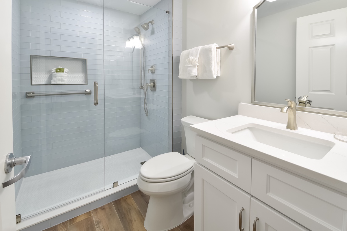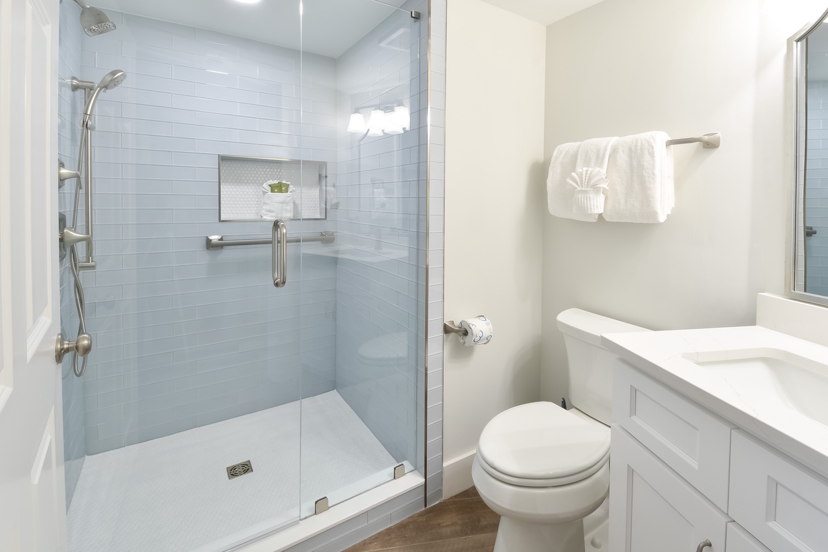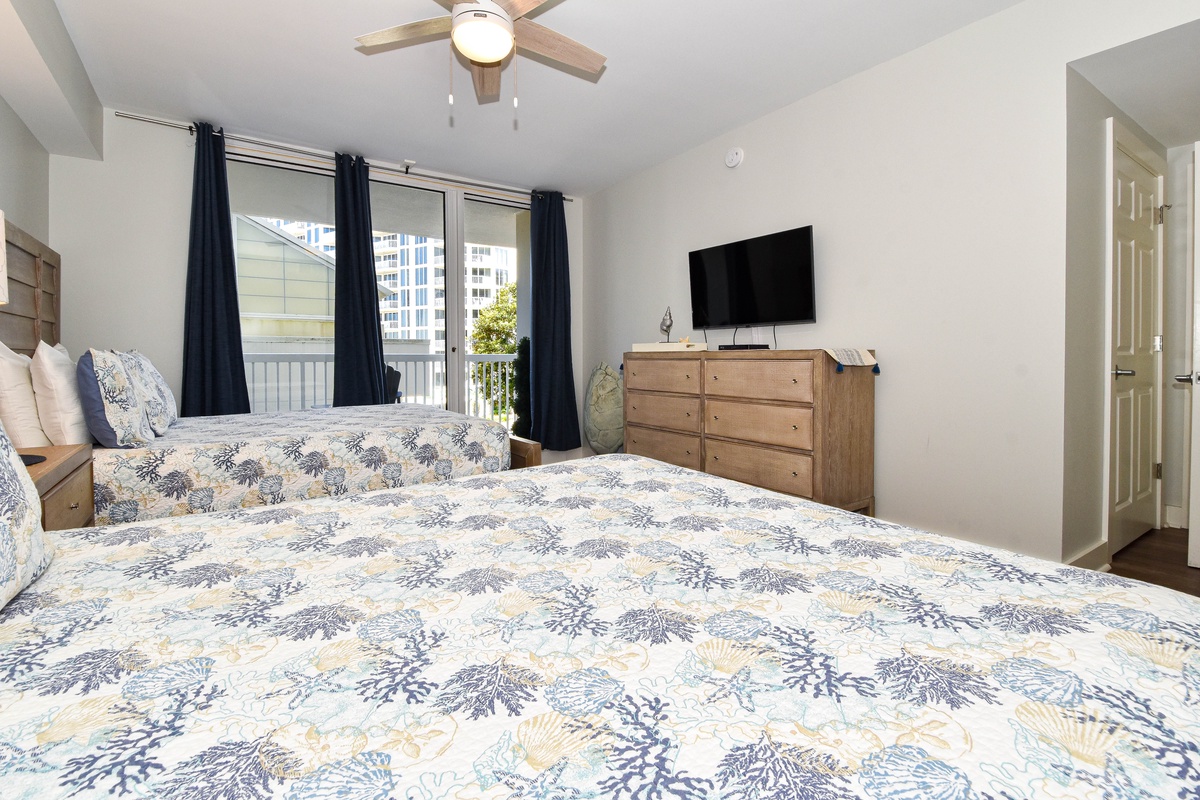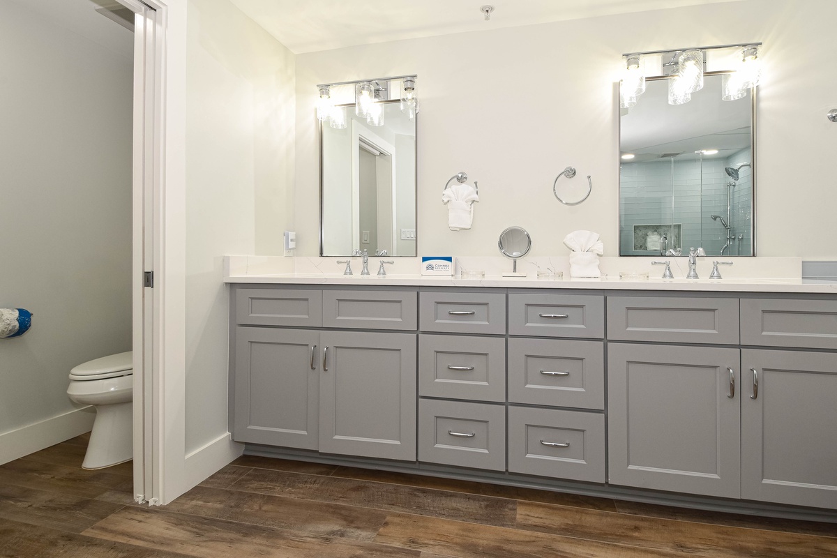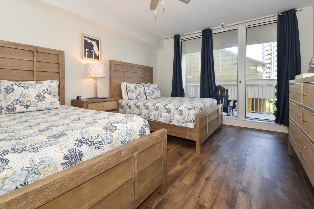 The primary suite contains a king bed in the main bedroom, a walk-in closet, and a primary bathroom with copious amounts of space to boast a double vanity, jetted tub, and tiled walk-in shower with a bench seat. The first guest bedroom contains a king bed. It is right next to the main guest bathroom which has a vanity and walk-in shower. The second guest bedroom is outfitted with two queen beds and has a large closet. This bedroom hosts a private bathroom with a vanity and tub/shower combination.