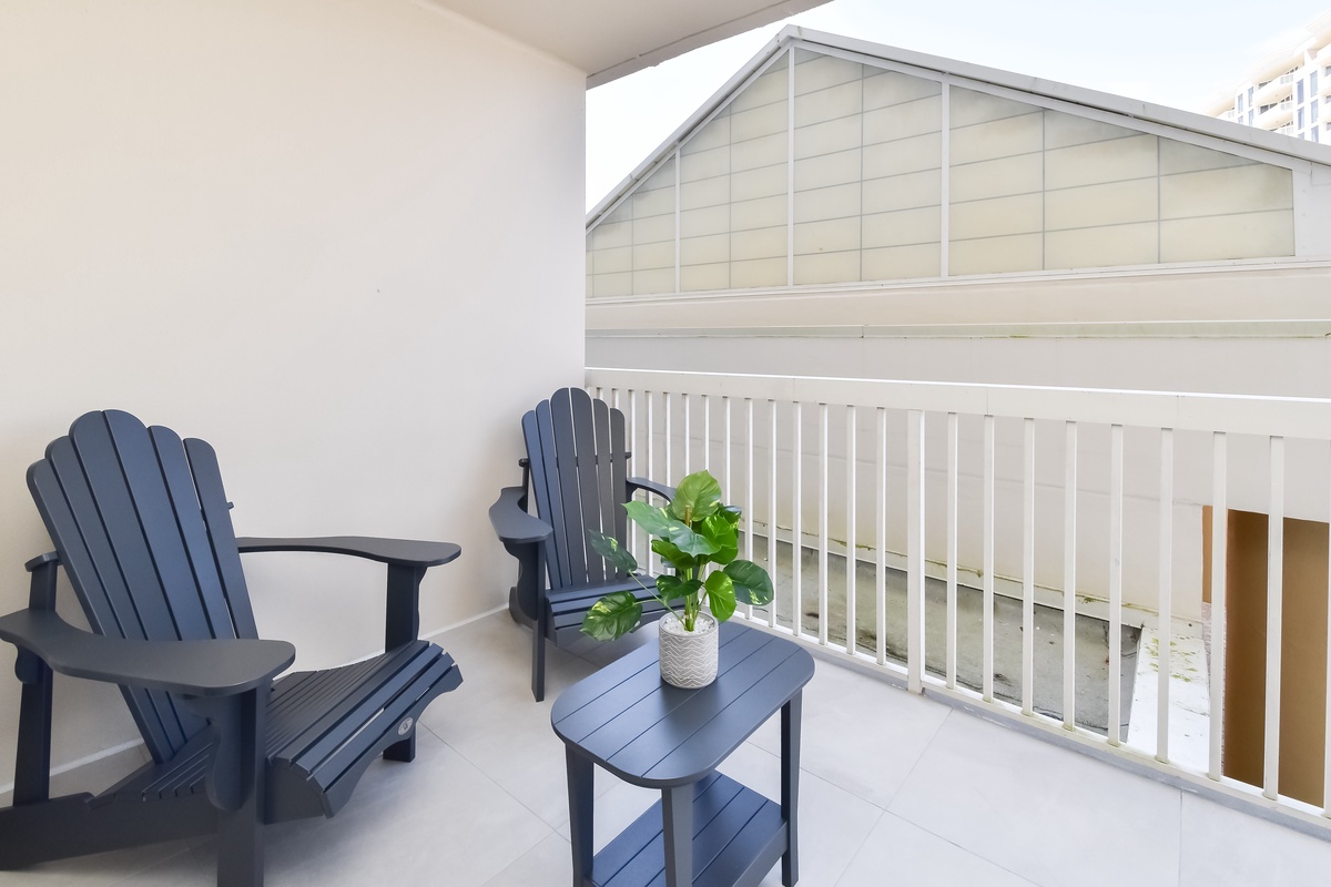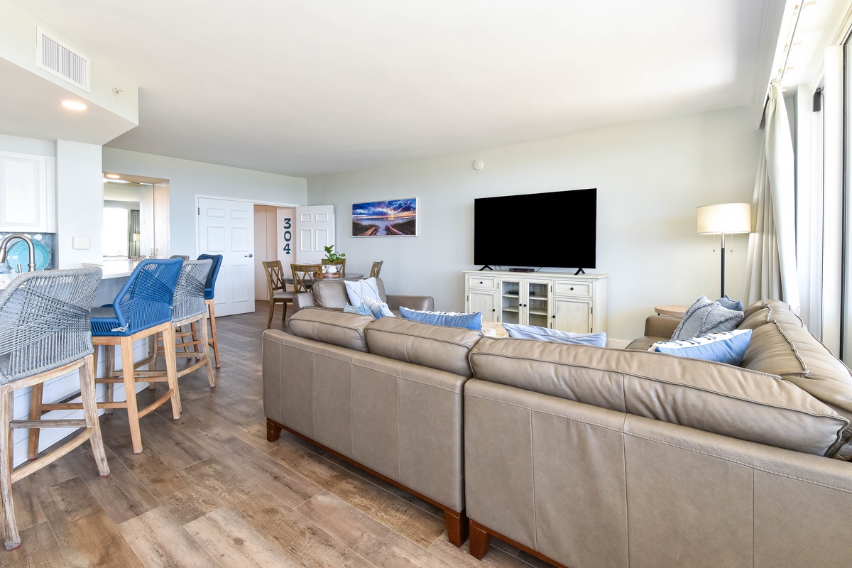 The open-concept living area of Silver Shells St. Maarten 304 includes a Living Room with plush, comfortable furnishings for all. The adjacent dining area and breakfast bar are equipped to seat your entire party, and there is room on the balcony for dining as well. The kitchen is fully equipped with dishware and cookware, and the laundry closet is in the main hallway behind the kitchen.