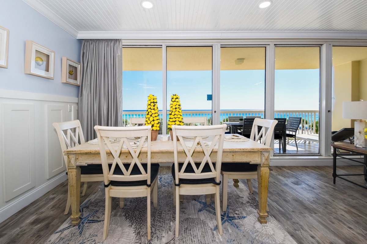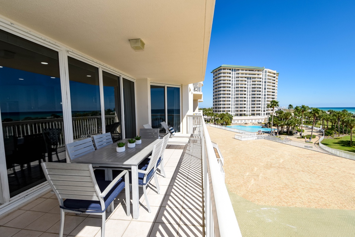 Welcome to Silver Shells St. Maarten 405, a beautifully appointed three-bedroom, three-bathroom beachfront condo located on the fourth floor of the highly sought-after Silver Shells Beach Resort in Destin, Florida. This spacious Gulf-front retreat offers breathtaking views of the Emerald Coast, private beach access, and complimentary seasonal beach service. Step out onto the beach-facing balcony, thoughtfully furnished with an outdoor dining table featuring seating for six, along with additional lounge chairs, perfect for relaxing or dining while taking in sweeping views of the sugar-white sand and emerald waters. Inside, the open-concept living, dining, and kitchen area is designed for gathering and unwinding. The beach-facing living room features floor-to-ceiling windows, sliding glass doors, comfortable seating, and a flat-screen TV. The dining area offers seating for six, with additional seating available at the breakfast bar. The newly redesigned, fully equipped kitchen includes stainless steel appliances and everything you need to prepare and enjoy meals during your stay. The serene primary suite offers incredible Gulf views, private balcony access, a king bed, a flat-screen TV, and a private en-suite bathroom. The spa-inspired primary bathroom features a freestanding soaking tub, a walk-in shower with multiple shower heads and a built-in bench, double vanity, and water closet. The first guest bedroom includes a king bed, flat-screen TV, private access to the north-facing balcony, and a private bathroom with a tiled walk-in shower. The second guest bedroom features two full beds and a flat-screen TV, with a full bathroom with a tiled walk-in shower located just steps from the bedroom and living area. For added convenience, this condo includes complimentary WiFi and an in-unit washer and dryer. Book your stay today and experience luxury beachfront living at Silver Shells St. Maarten 405.
