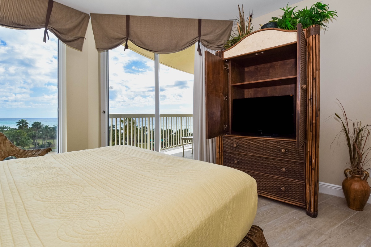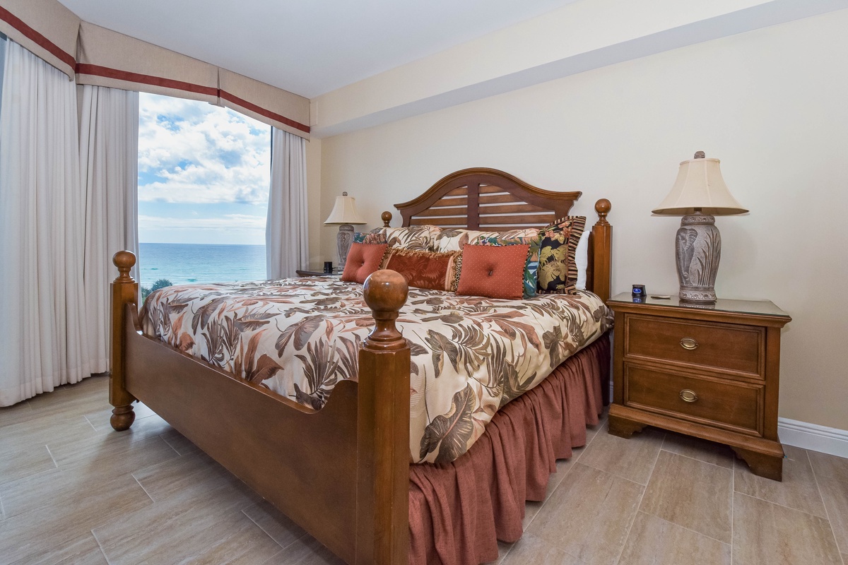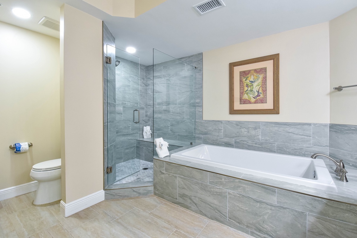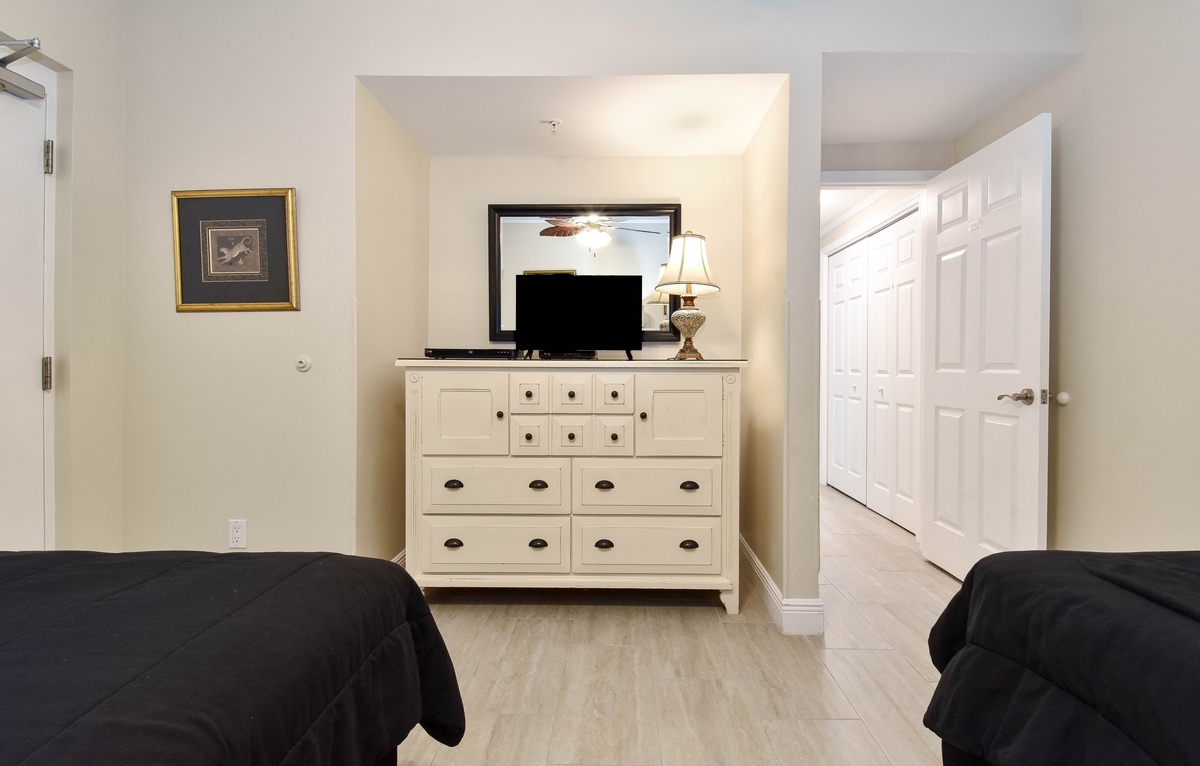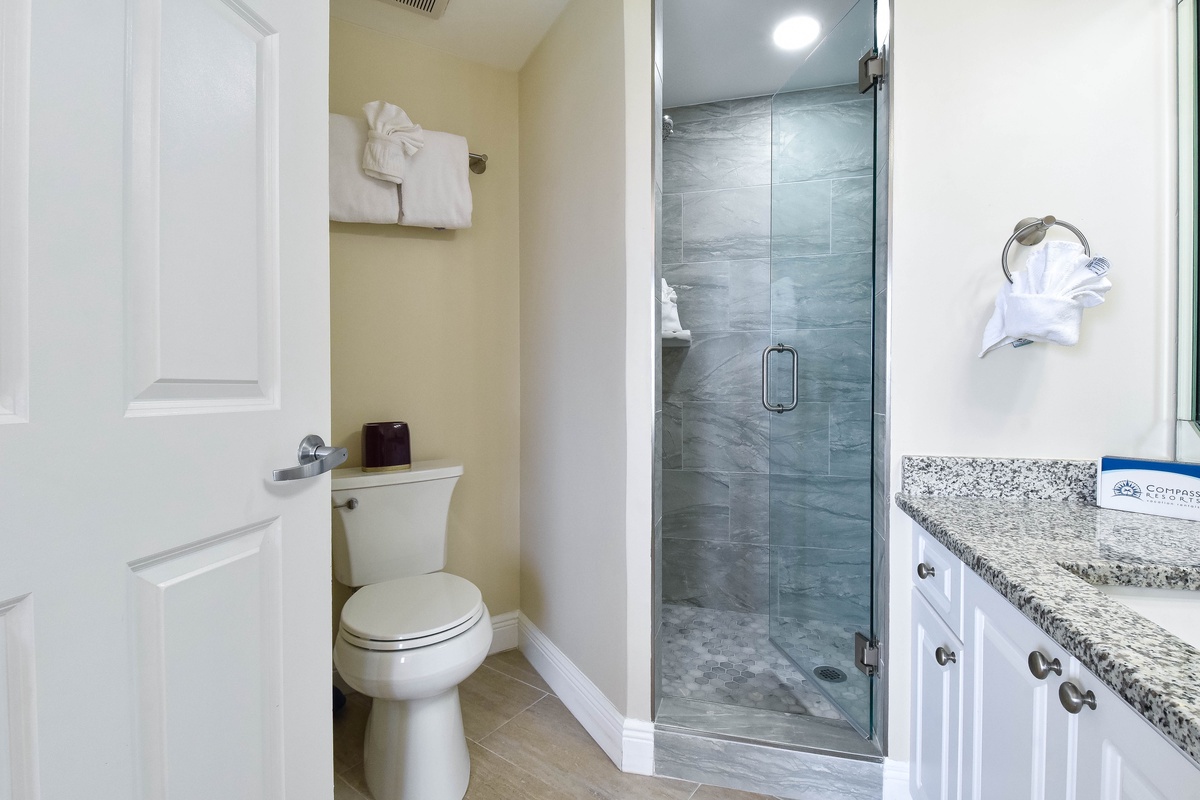 The primary bedroom has incredible beach views and private access to the beach-facing balcony. Complete with a king bed, flat-screen TV, and private ensuite bathroom, the primary bedroom was designed with relaxation in mind. The primary bathroom features a jetted tub, walk-in shower, and double vanity. The first guest bedroom has a queen bed, flat-screen TV, and private access to the beach-facing balcony. The first guest bedroom has a private bathroom with a walk-in shower. The second guest bedroom has two twin beds and a TV. Just steps from both the second guest bedroom and the living area is a full bathroom with a walk-in shower.
