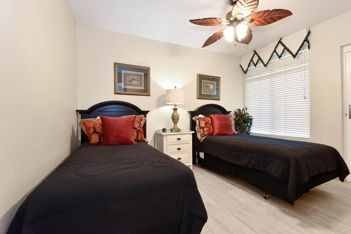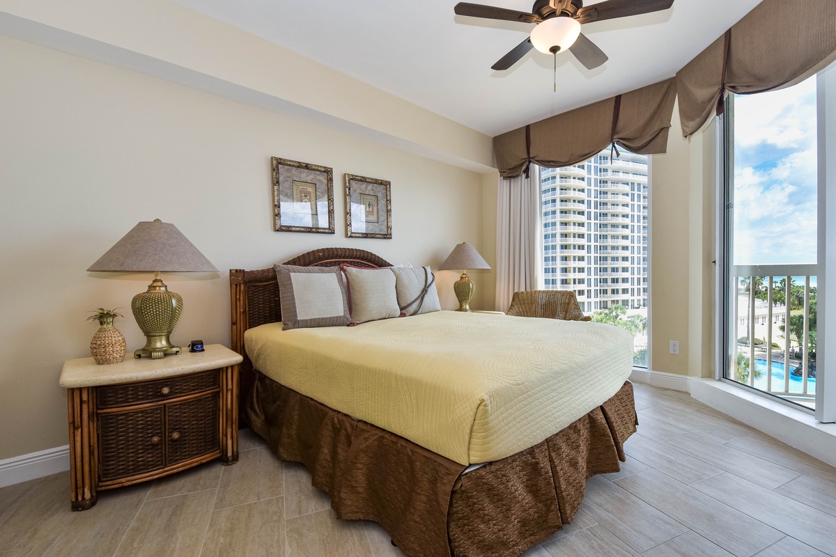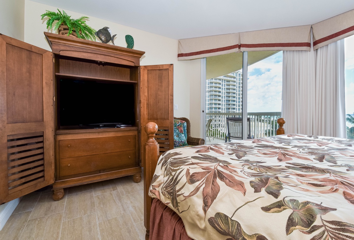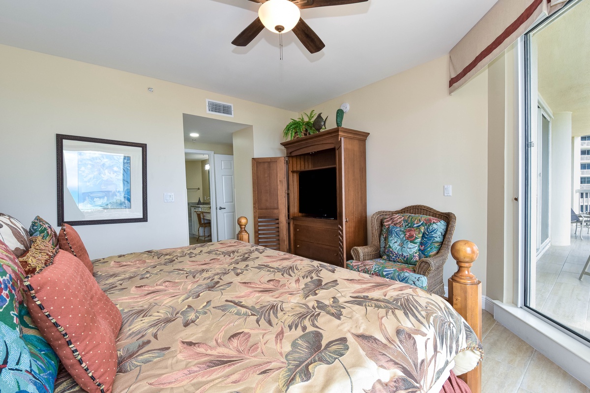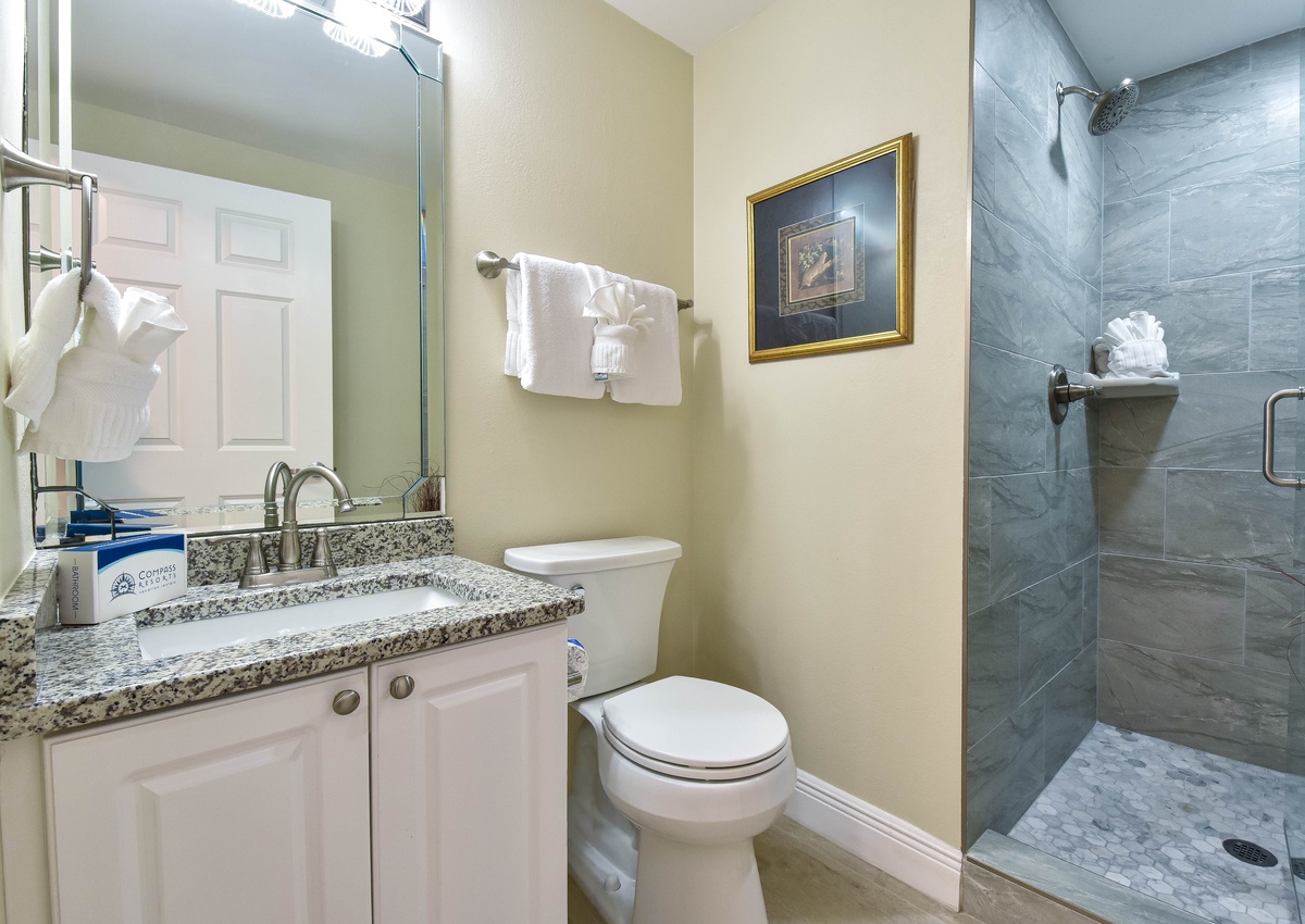 The primary bedroom has incredible beach views and private access to the beach-facing balcony. Complete with a king bed, flat-screen TV, and private ensuite bathroom, the primary bedroom was designed with relaxation in mind. The primary bathroom features a jetted tub, walk-in shower, and double vanity. The first guest bedroom has a queen bed, flat-screen TV, and private access to the beach-facing balcony. The first guest bedroom has a private bathroom with a walk-in shower. The second guest bedroom has two twin beds and a TV. Just steps from both the second guest bedroom and the living area is a full bathroom with a walk-in shower.