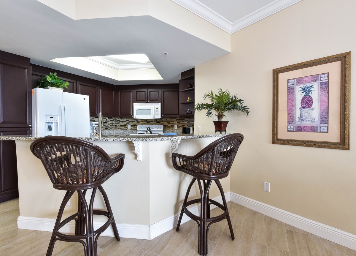 The interior spaces of Silver Shells St. Maarten 502 have been tastefully decorated with a tropical theme. An open floor plan gives the whole family or group space to relax together. The living area is beach-facing, features floor-to-ceiling windows and sliding glass doors, and offers plenty of seating for everyone to gather around the flat-screen TV. The couch even converts to a queen sleeper sofa for larger parties. The spacious beach-facing balcony is perfectly furnished to allow for entertaining or dining while taking in spectacular views of the white sand beach and emerald waters. The dining area has seating for six with additional seating for two at the breakfast bar. The fully equipped kitchen includes full-size appliances and all the cookware and dishware you could need for creating memorable meals.