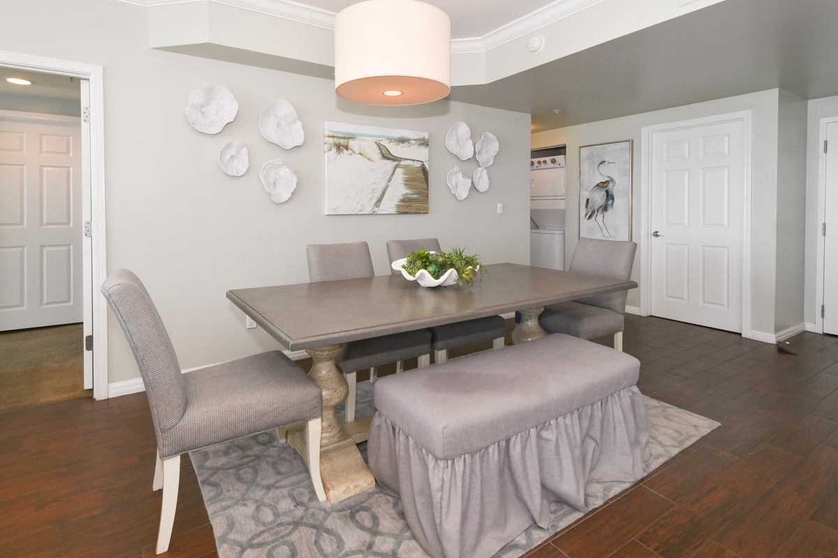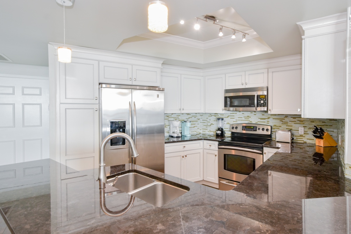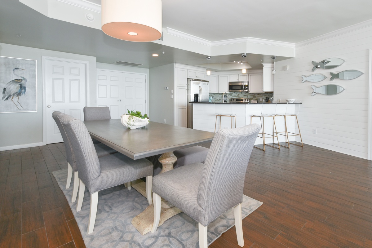 The interior spaces of Silver Shells St. Maarten 606 have been tastefully decorated with a modern, coastal theme. An open floor plan gives the whole family or group space to relax together. The living area is beach-facing, features floor-to-ceiling windows and sliding glass doors, and provides plenty of seating for everyone to gather around the 65-inch mounted TV, soundbar, and sub-woofer. You can also watch many channels/shows with the all-inclusive Dish Network and Netflix. The couch even converts to a queen sleeper sofa for larger parties. The spacious beach-facing balcony is perfectly furnished to allow for entertaining or dining while taking in spectacular views of the white sand beach and emerald waters. The dining area has seating for six with additional seating for three at the breakfast bar. The fully equipped kitchen includes full-size stainless steel appliances, marble countertops, a mosaic backsplash, and all the cookware and dishware you could need for creating memorable meals.