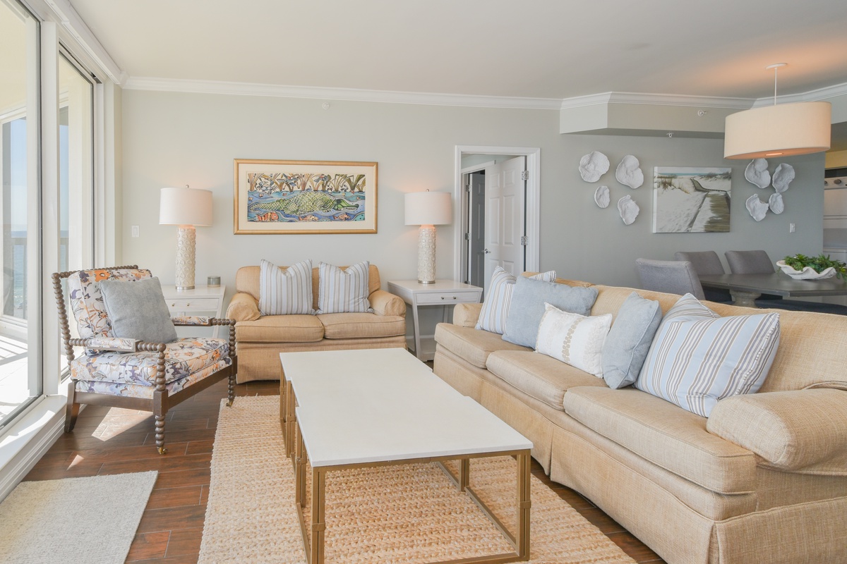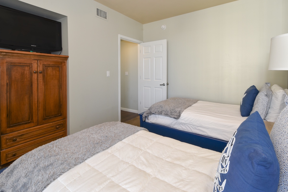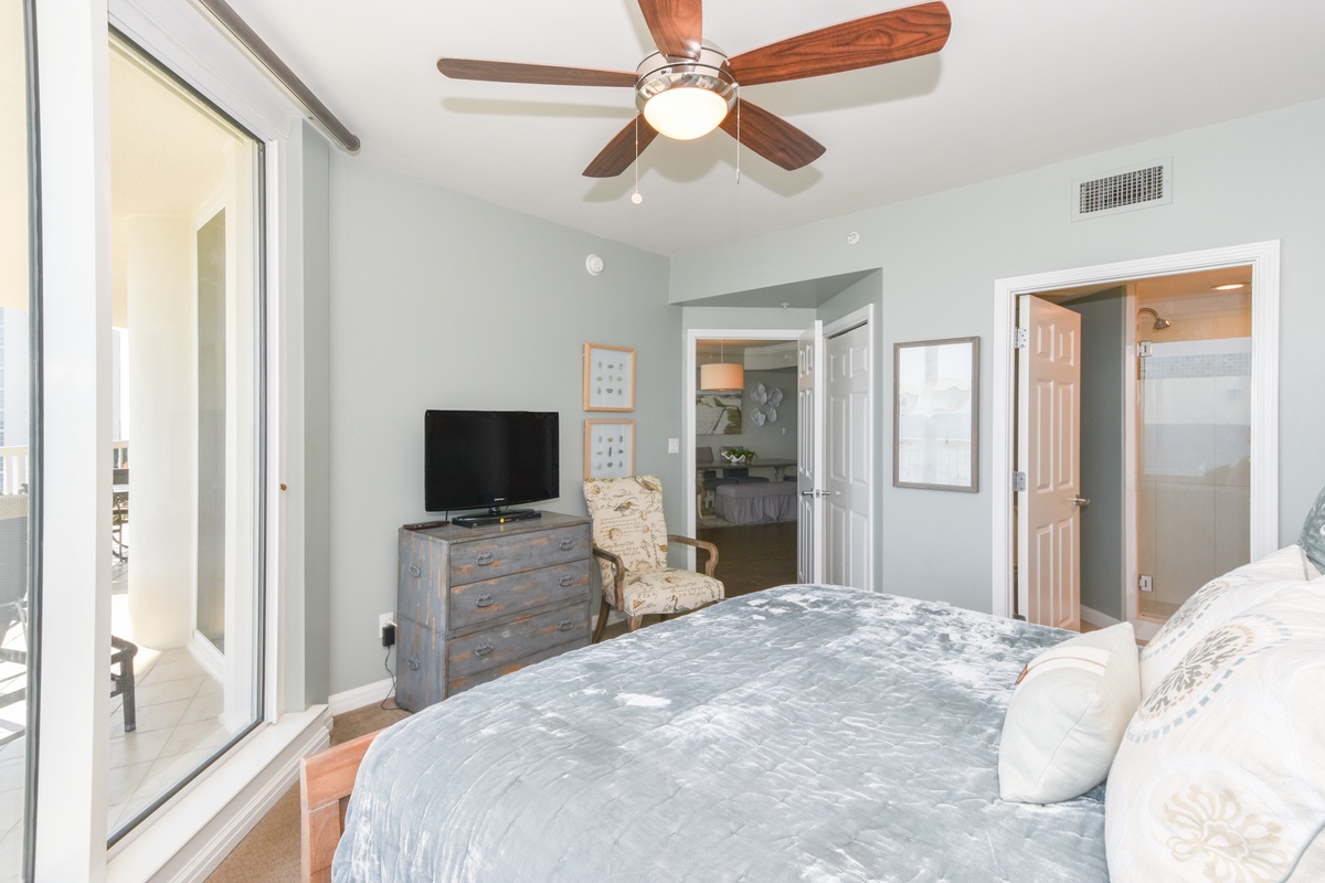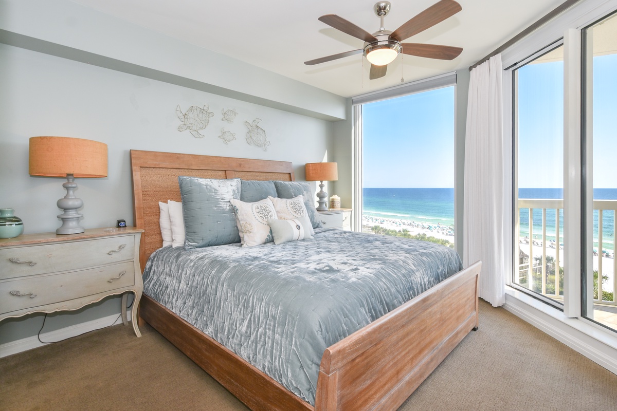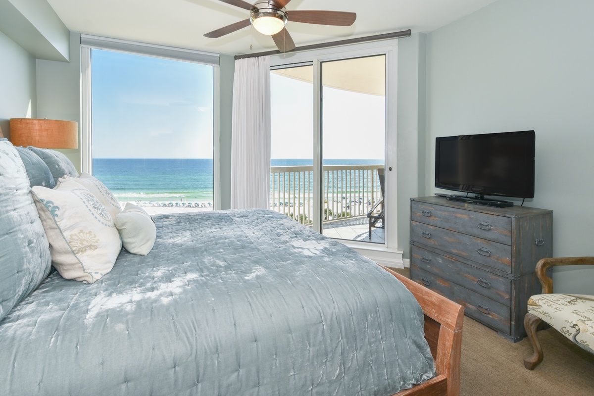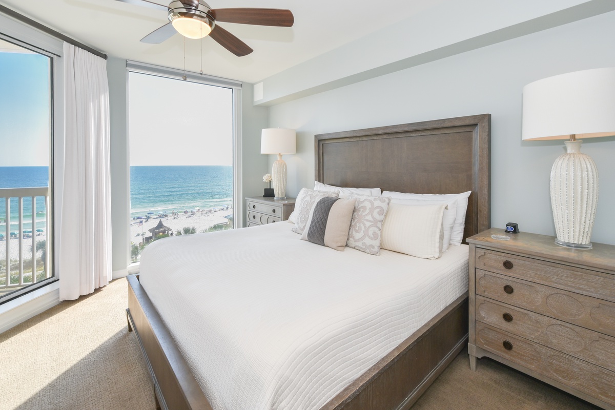 The master bedroom has incredible beach views and private access to the beach-facing balcony. Complete with a king bed, flat-screen TV, walk-in closet, and private ensuite bathroom, the master bedroom was designed with relaxation in mind. The master bathroom features a jetted tub, walk-in shower, and double vanity. The first guest bedroom has a king bed, a flat-screen TV, and private access to the beach-facing balcony. The first guest bedroom has a private bathroom with a walk-in shower. The second guest bedroom has two twin beds and a flat-screen TV. Just steps from both the second guest bedroom and the living area is a full bathroom with a walk-in shower.