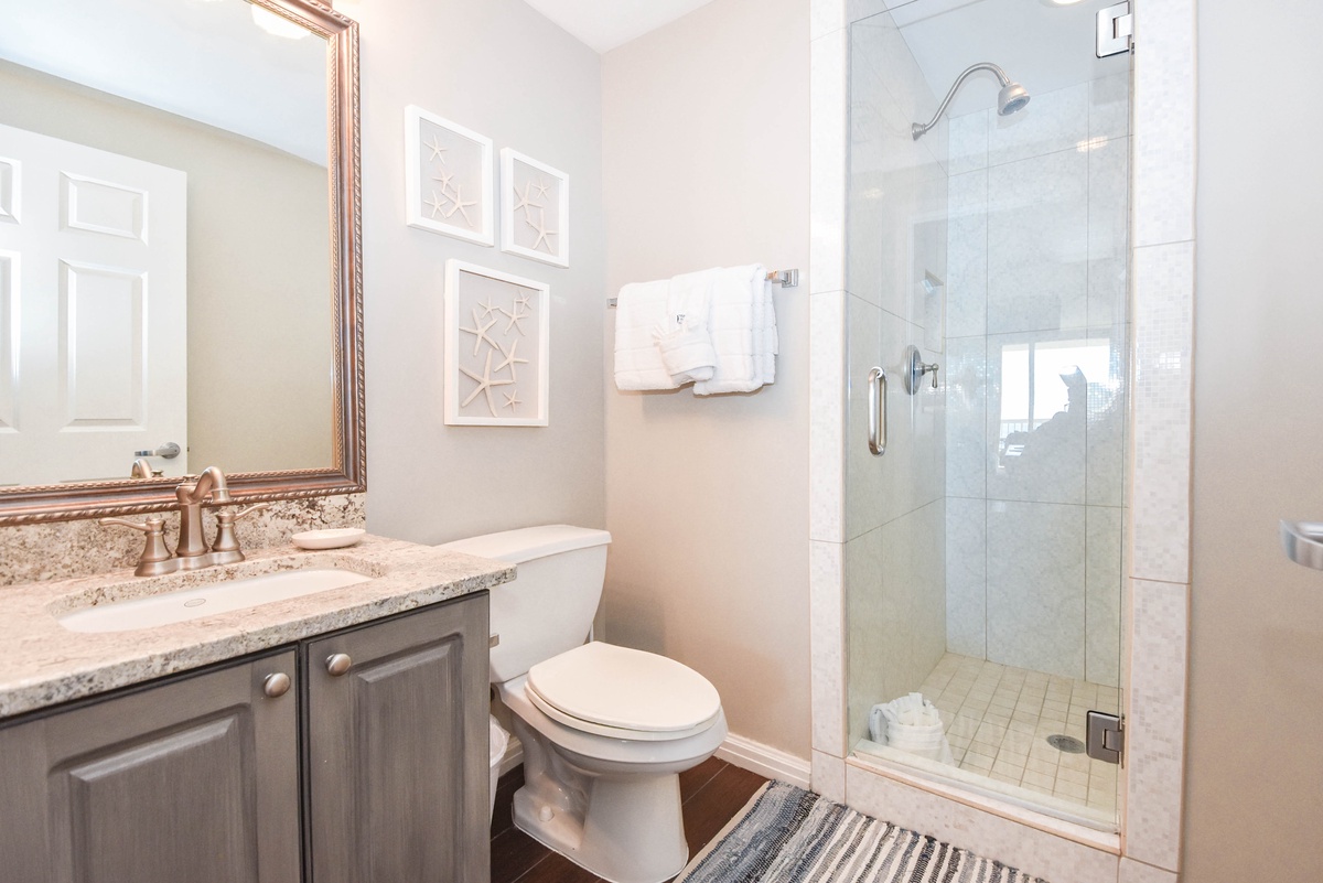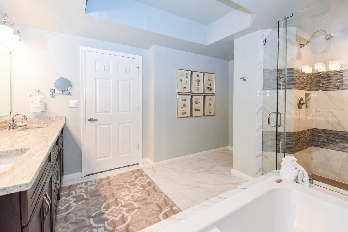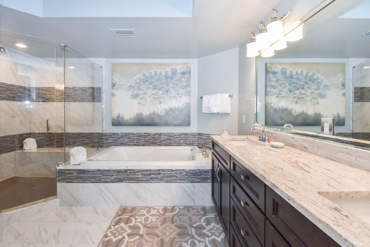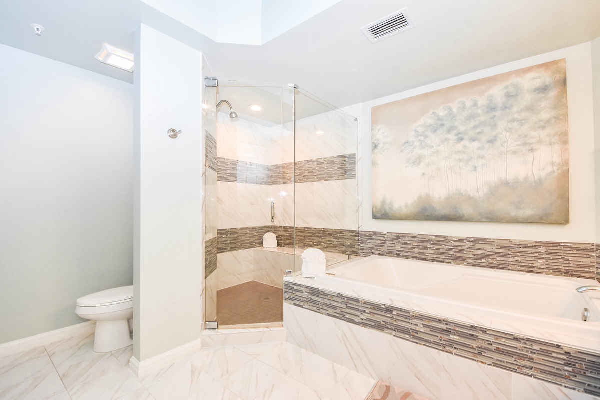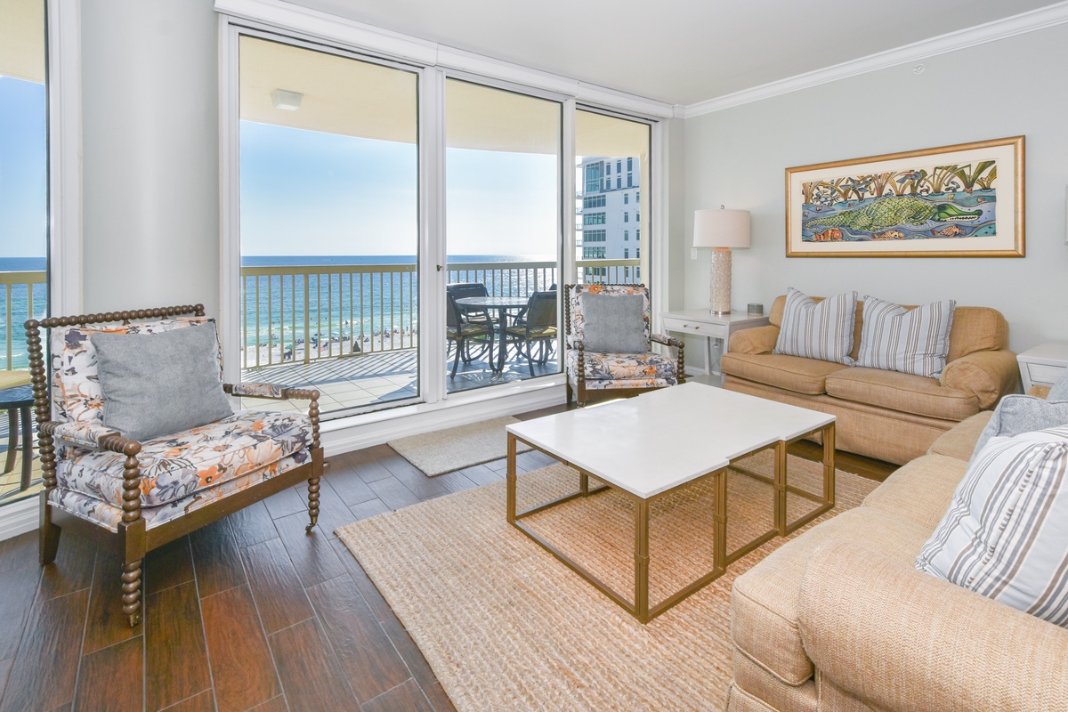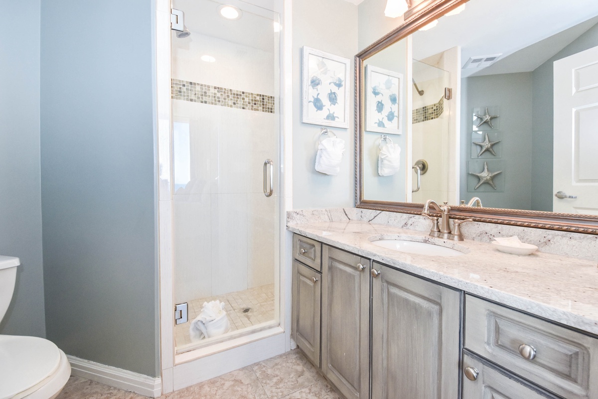 The master bedroom has incredible beach views and private access to the beach-facing balcony. Complete with a king bed, flat-screen TV, walk-in closet, and private ensuite bathroom, the master bedroom was designed with relaxation in mind. The master bathroom features a jetted tub, walk-in shower, and double vanity. The first guest bedroom has a king bed, a flat-screen TV, and private access to the beach-facing balcony. The first guest bedroom has a private bathroom with a walk-in shower. The second guest bedroom has two twin beds and a flat-screen TV. Just steps from both the second guest bedroom and the living area is a full bathroom with a walk-in shower.