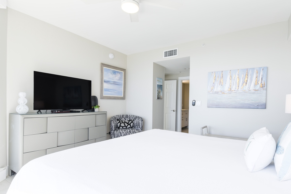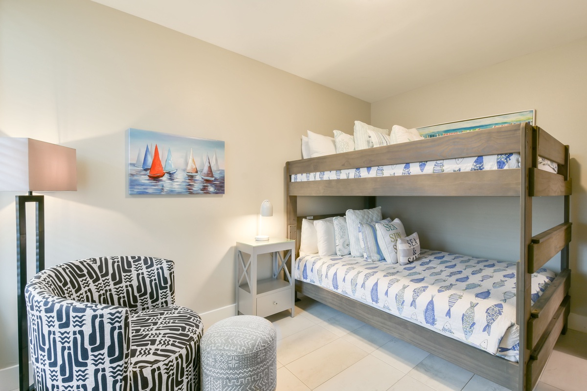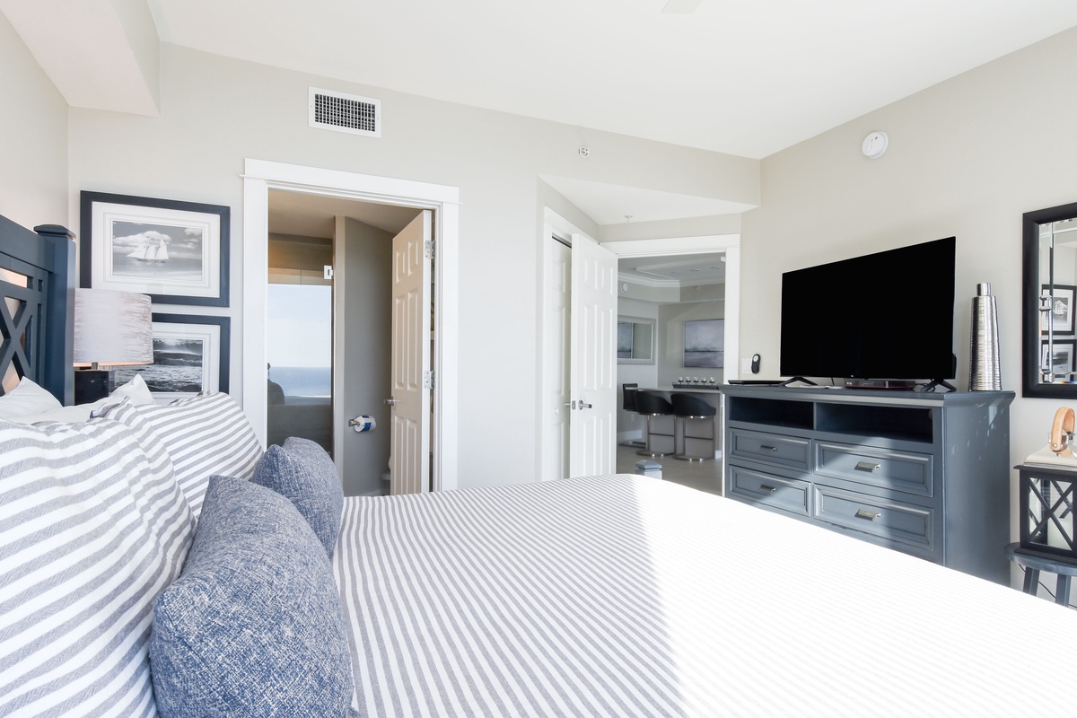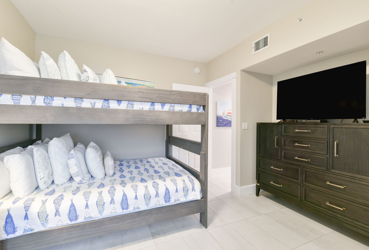 The master bedroom has incredible beach views and private access to the beach-facing balcony. Complete with a king bed, flat-screen TV, walk-in closet, and private ensuite bathroom, the master bedroom was designed with relaxation in mind. The master bathroom features a jetted tub, walk-in shower, and double vanity. The first guest bedroom has a king bed, a flat-screen TV, and private access to the beach-facing balcony. The first guest bedroom has a private bathroom with a walk-in shower. The second guest bedroom has a Queen-over-Queen bunk bed and a flat-screen TV. Just steps from both the second guest bedroom and the living area is a full bathroom with a walk-in shower.