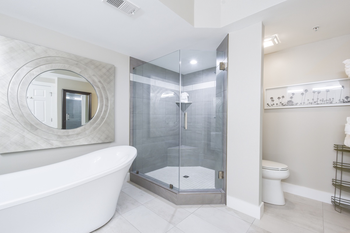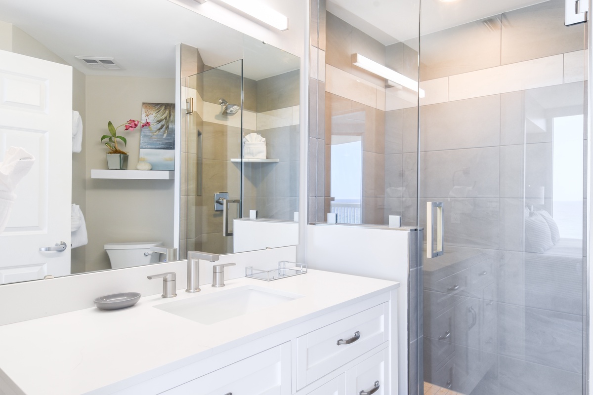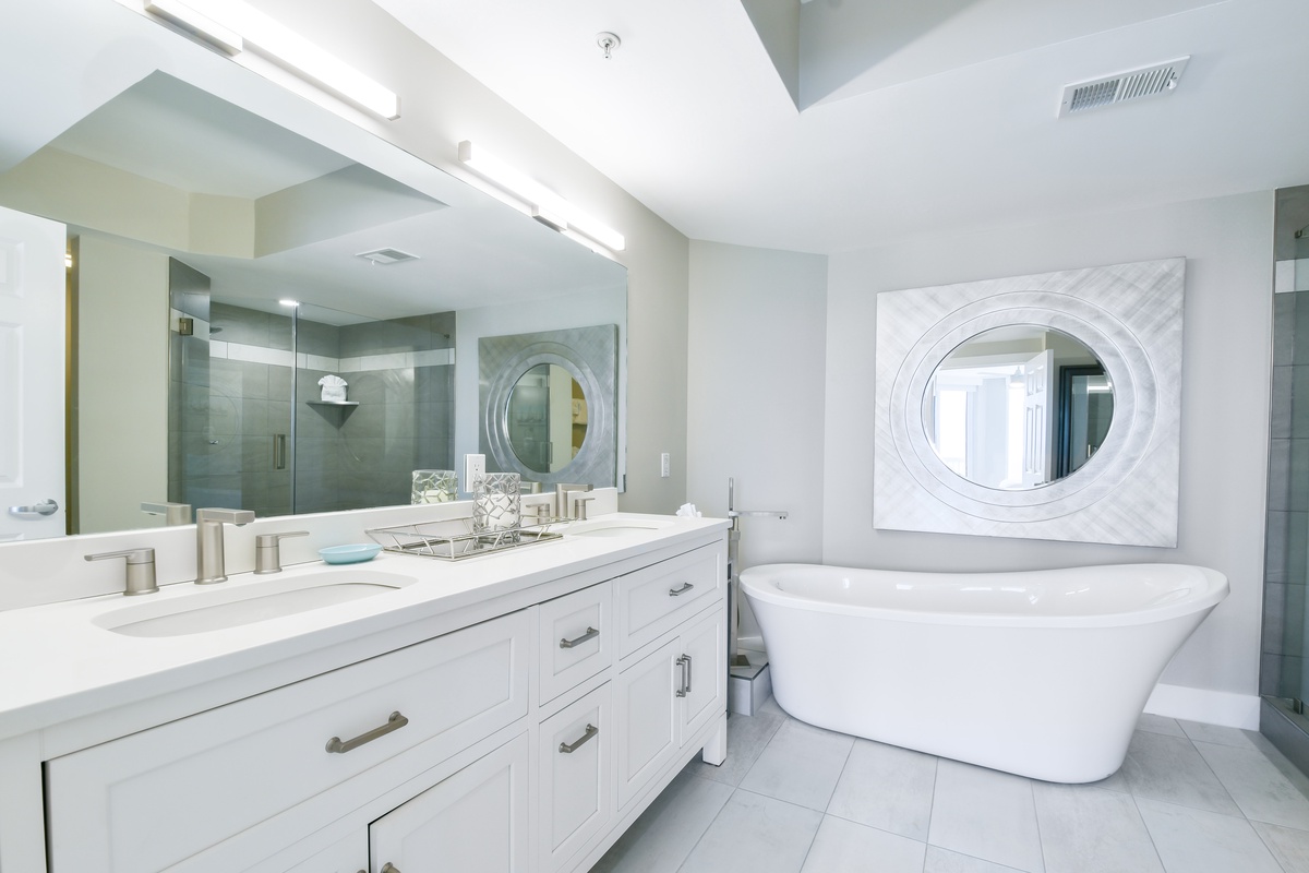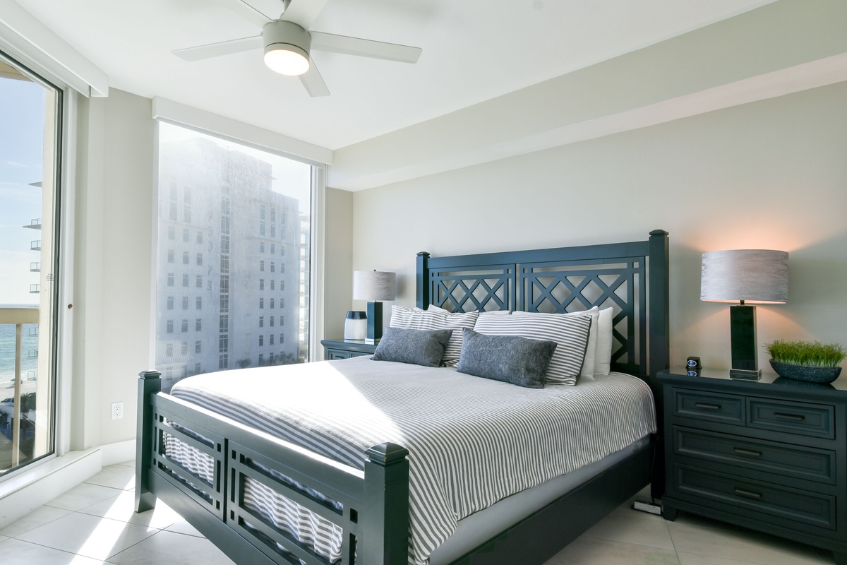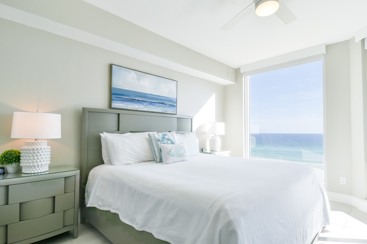The master bedroom has incredible beach views and private access to the beach-facing balcony. Complete with a king bed, flat-screen TV, walk-in closet, and private ensuite bathroom, the master bedroom was designed with relaxation in mind. The master bathroom features a jetted tub, walk-in shower, and double vanity. The first guest bedroom has a king bed, a flat-screen TV, and private access to the beach-facing balcony. The first guest bedroom has a private bathroom with a walk-in shower. The second guest bedroom has a Queen-over-Queen bunk bed and a flat-screen TV. Just steps from both the second guest bedroom and the living area is a full bathroom with a walk-in shower.