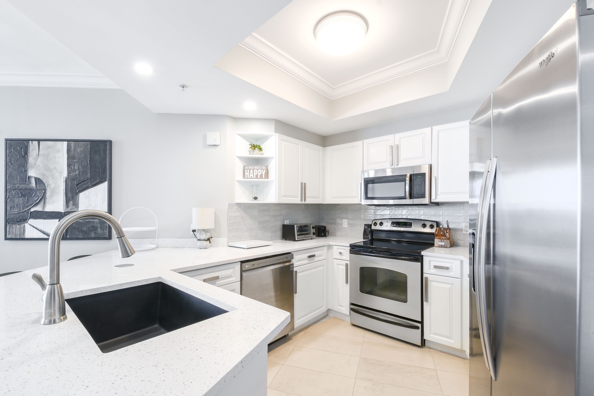 The interior spaces of Silver Shells St. Maarten 607 have been tastefully decorated with an upscale coastal theme. An open floor plan gives the whole family or group space to relax together. The living area is beach-facing, features floor-to-ceiling windows and sliding glass doors, and provides plenty of seating for everyone to gather around the flat-screen TV. The spacious beach-facing balcony is perfectly furnished to allow for entertaining or dining while taking in spectacular views of the white sand beach and emerald waters. The dining area has seating for six with additional seating for four at the breakfast bar. The fully equipped kitchen includes full-size stainless steel appliances and all the cookware and dishware you could need for creating memorable meals.