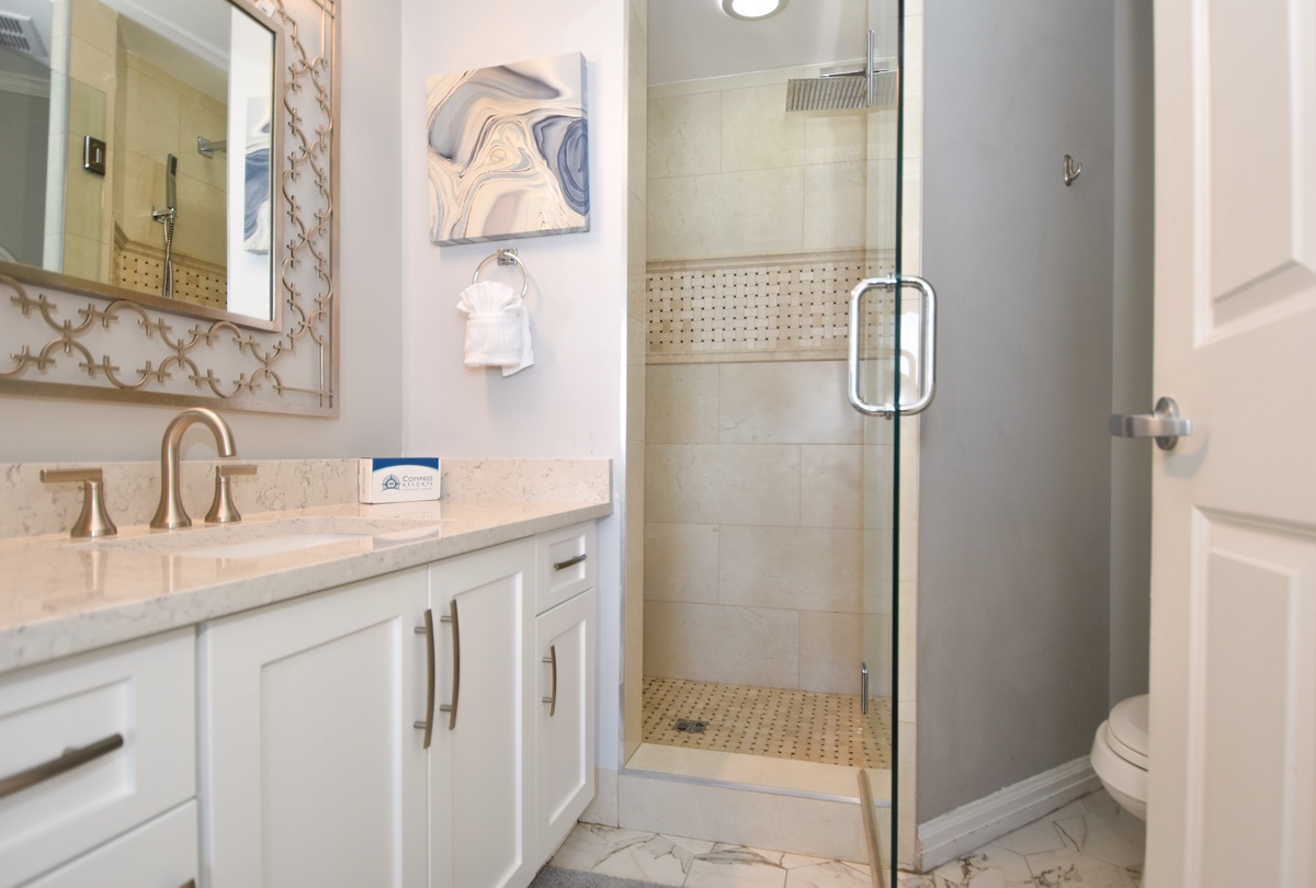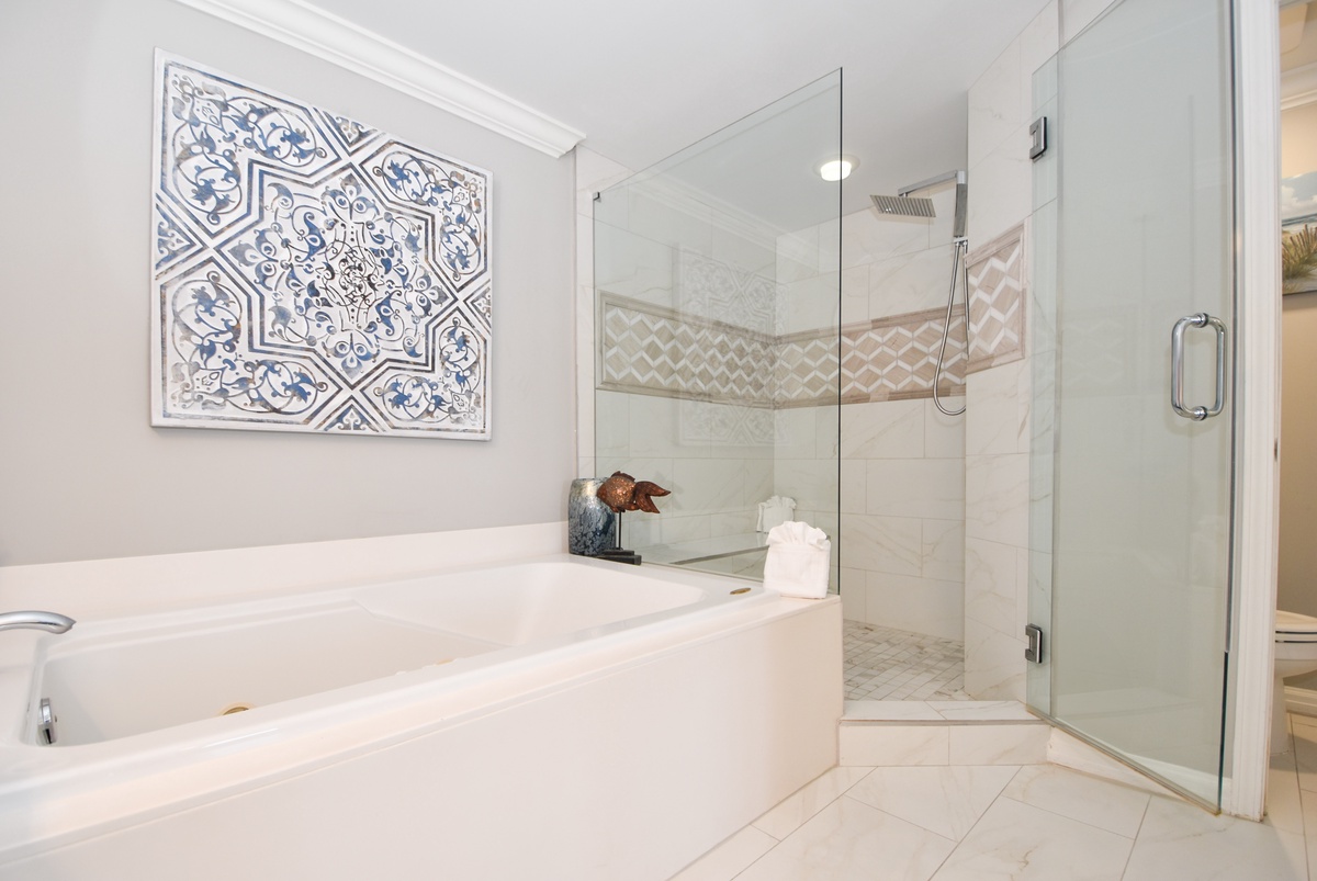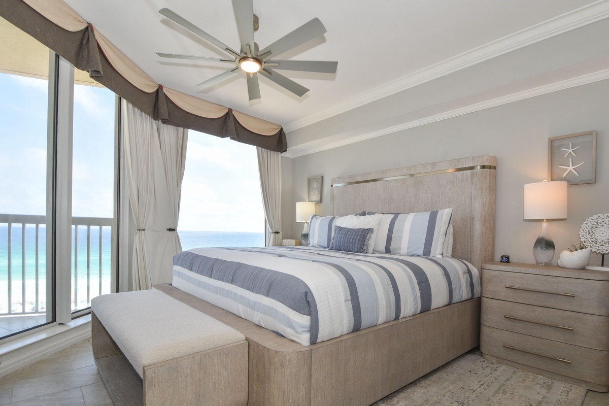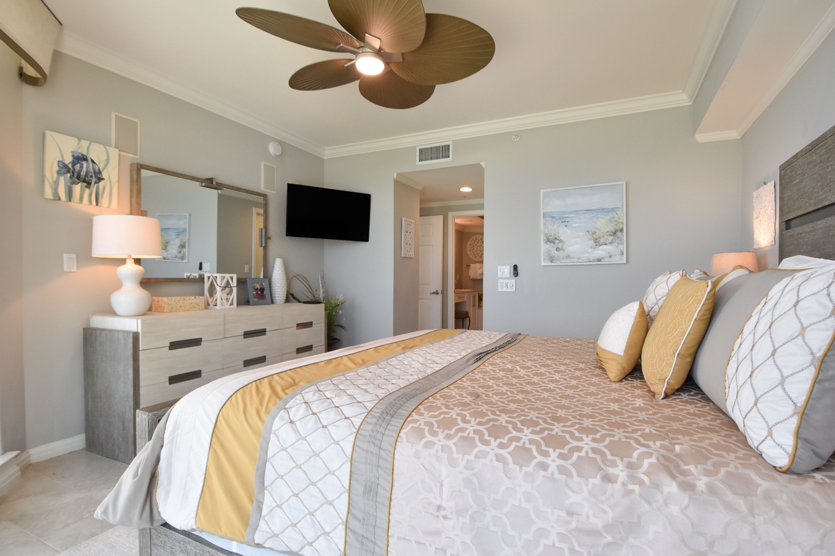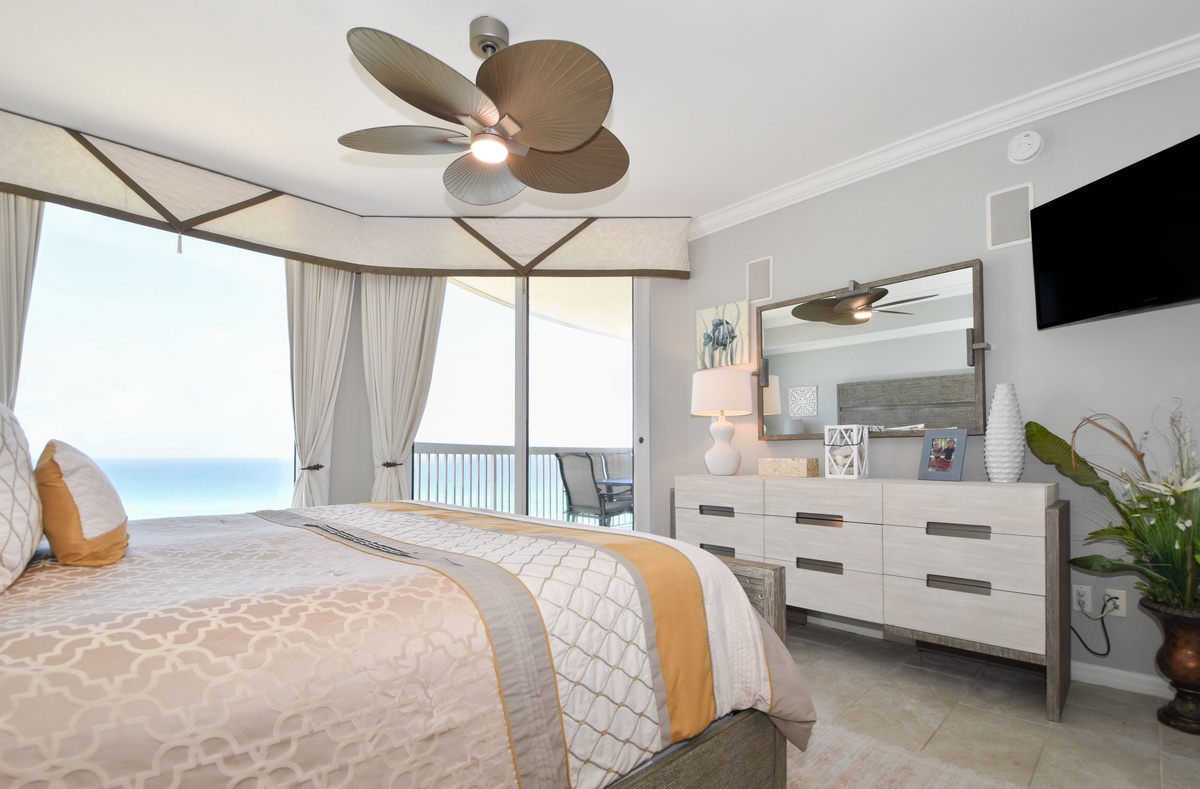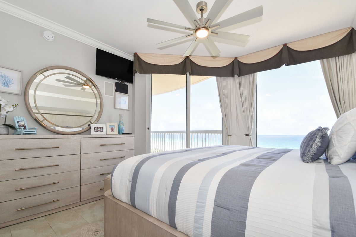 The master bedroom has incredible beach views and private access to the beach-facing balcony. Complete with a king bed, flat-screen TV, and private ensuite bathroom, the master bedroom was designed with relaxation in mind. The master bathroom features a luxurious tub, walk-in shower, and double vanity. The first guest bedroom has a king bed, a flat-screen TV, and private access to the beach-facing balcony. The first guest bedroom also has a private bathroom with a walk-in shower. The second guest bedroom has a twin over a twin bunk bed, a twin over a full bunk bed, and a flat-screen TV. Just steps from both the second guest bedroom and the living area is a full bathroom with a walk-in shower.