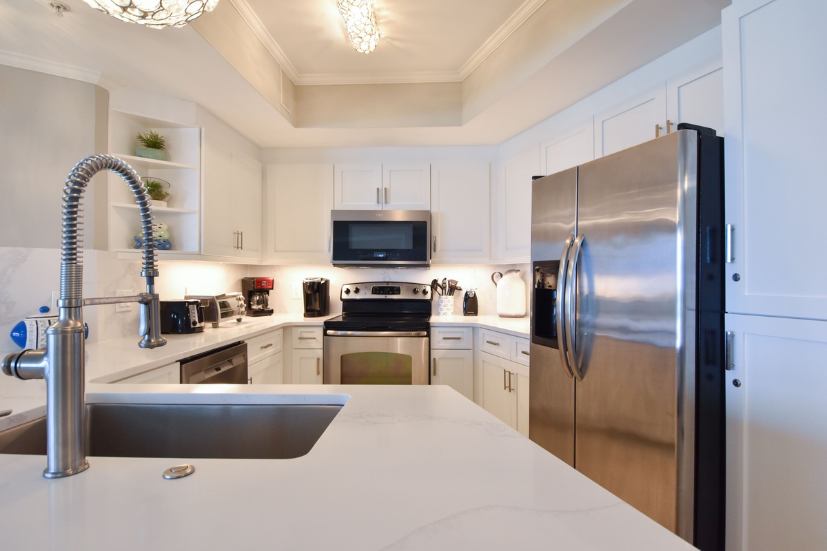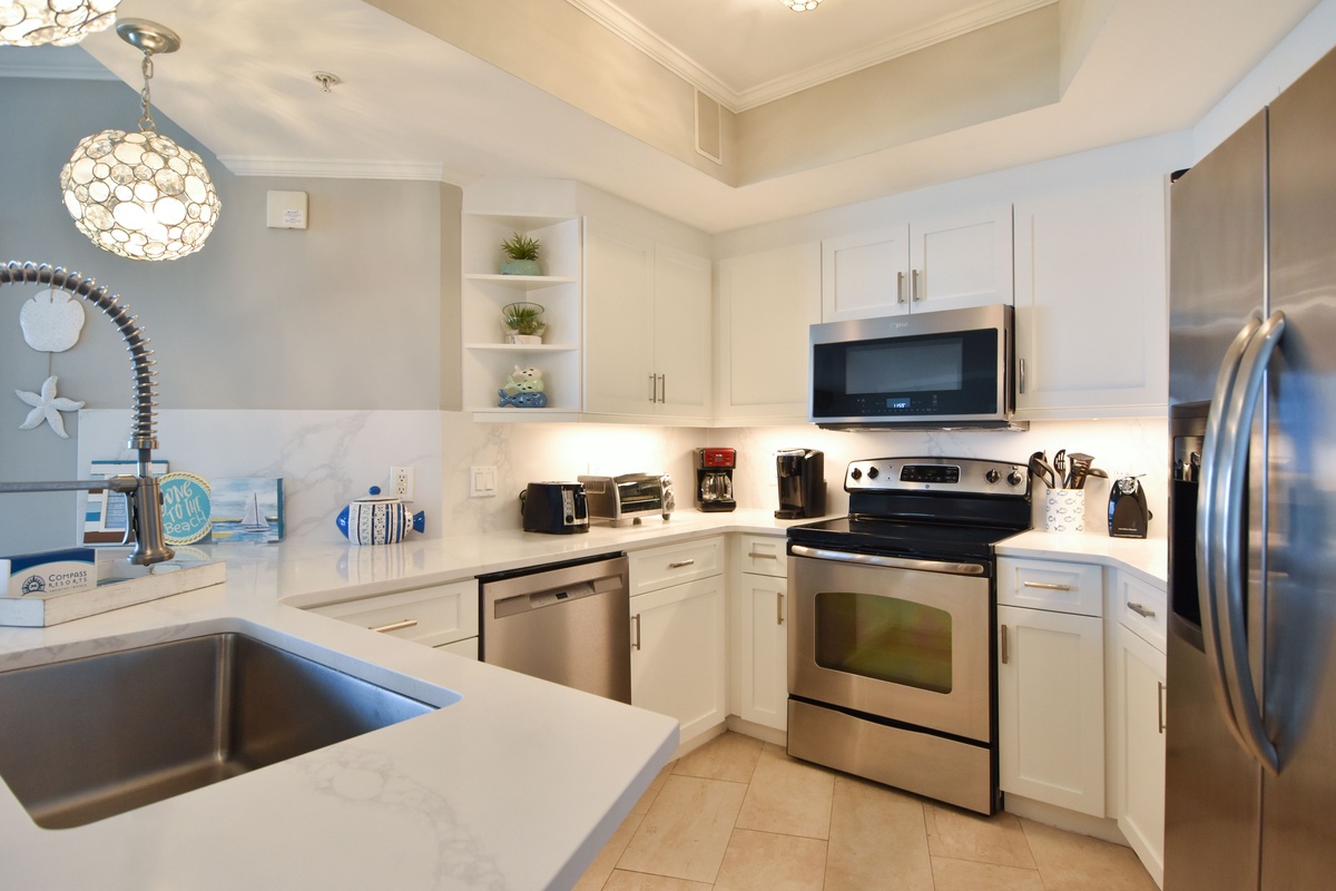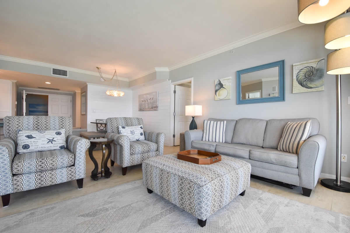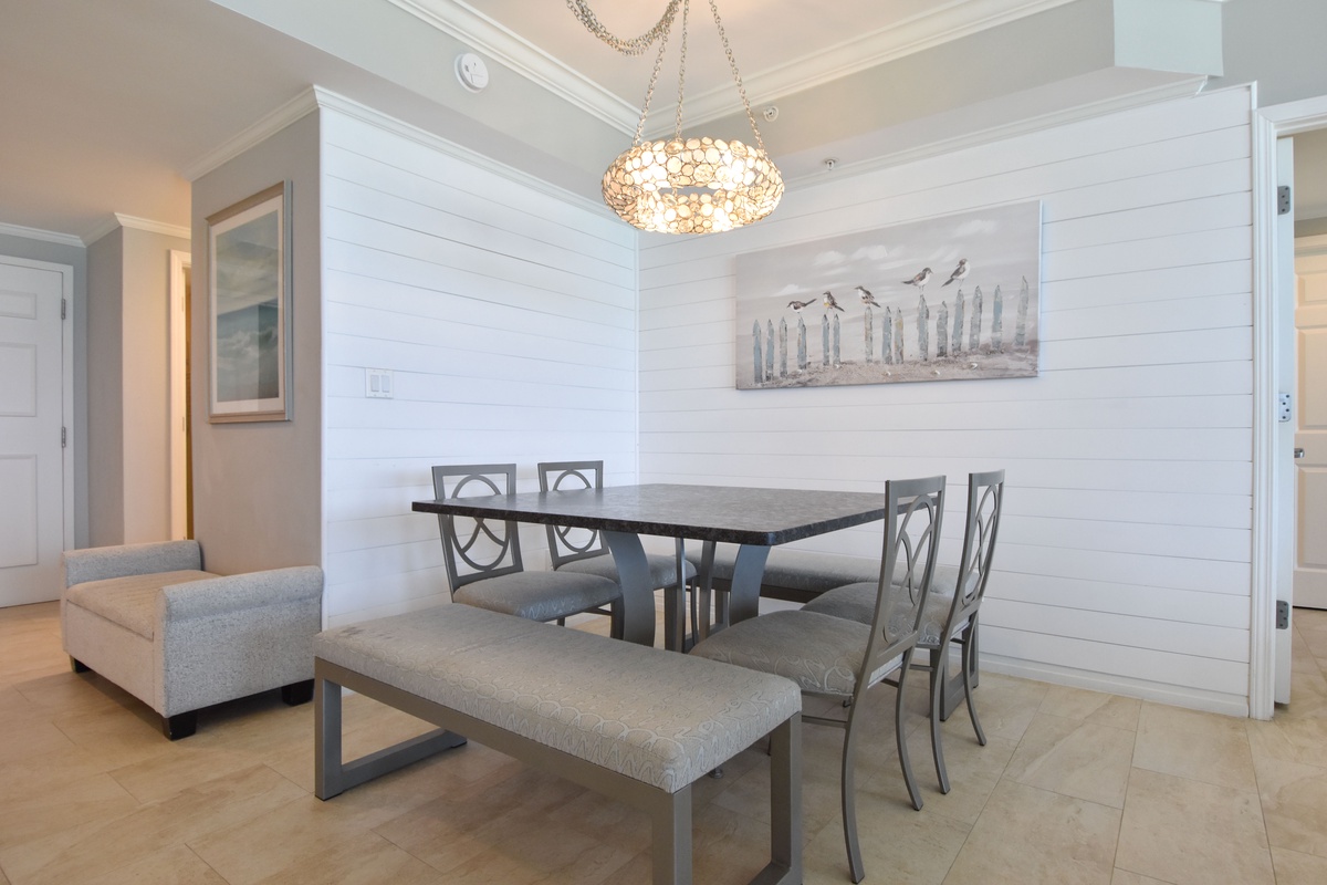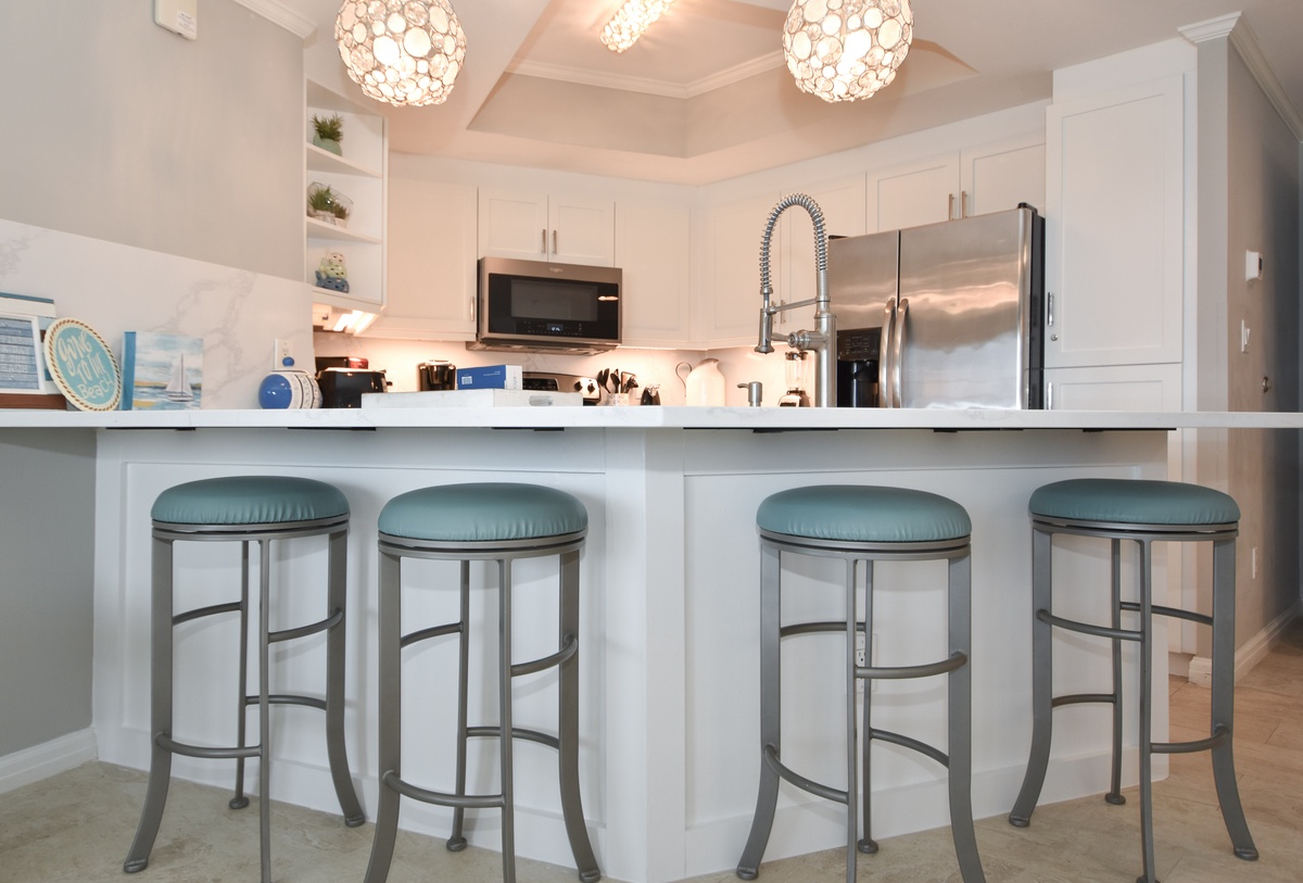 The interior spaces of Silver Shells St. Maarten 803 have been tastefully decorated with a trendy beach theme. An open floor plan gives the whole family or group space to relax together. The living area is beach-facing, features floor-to-ceiling windows and sliding glass doors, and offers plenty of seating for everyone around the flat-screen TV. The couch even converts to a queen sleeper sofa for larger parties. The spacious beach-facing balcony is perfectly furnished to allow for entertaining or dining while taking in spectacular views of the white sand beach and emerald waters. The dining room has seating for six with four additional seats at the breakfast bar. The fully equipped kitchen includes full-size stainless steel appliances and all the cookware and dishware you could need for creating memorable meals.