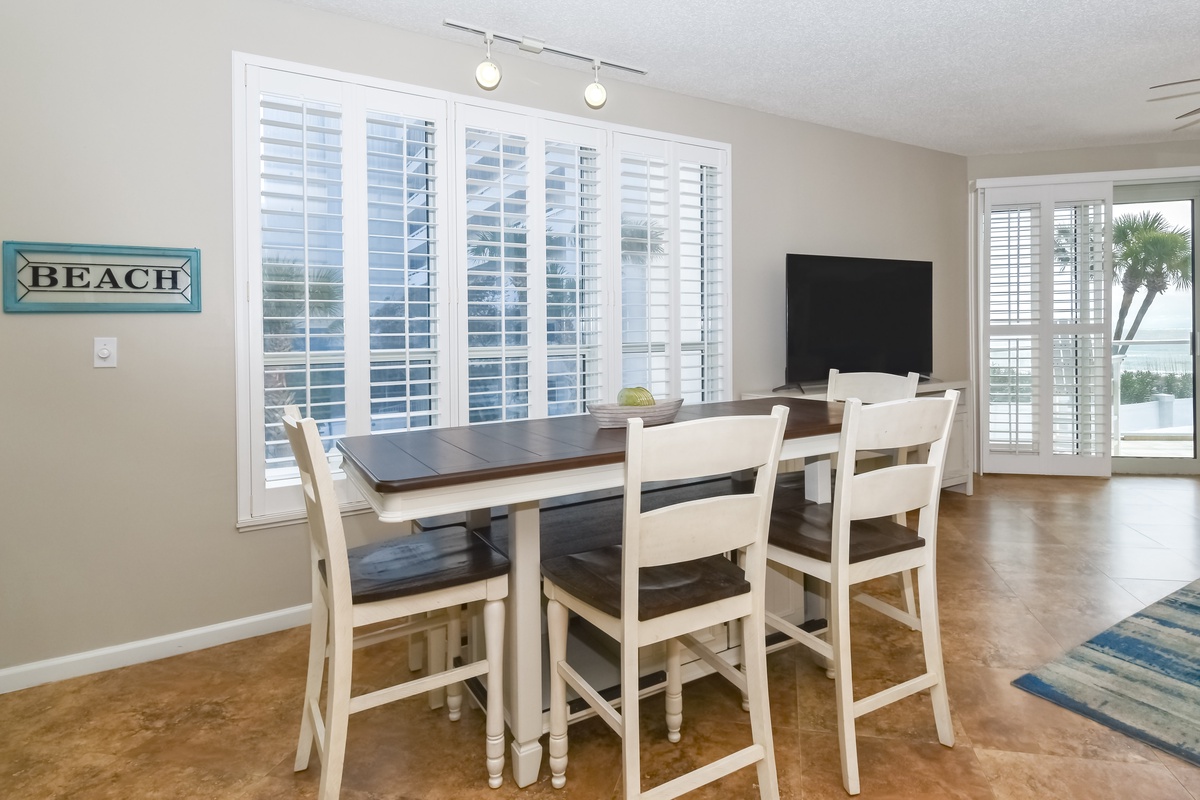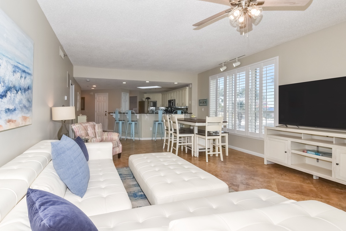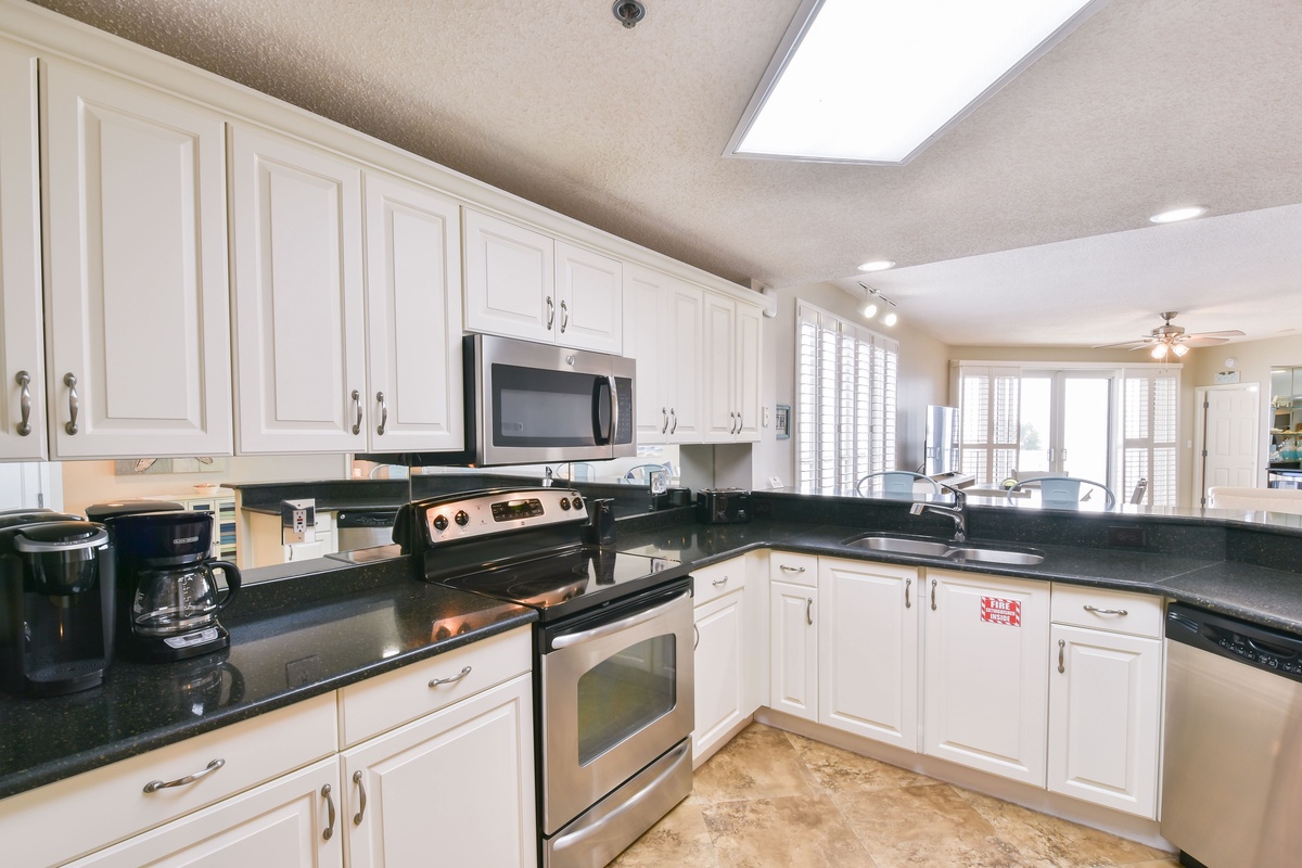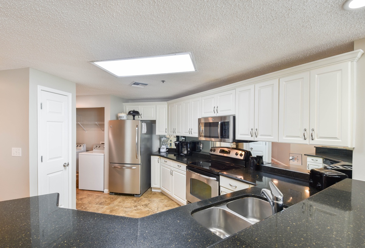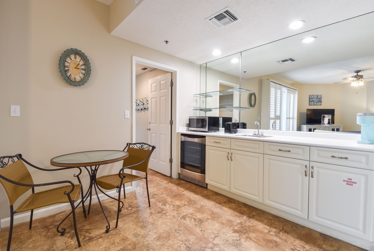 The open-concept living area of Sterling Sands 101 contains a main living area, dining area, and kitchen, with views of the beach from all. The living area has a comfortable sectional sofa perfect for relaxing after a long day at the beach, and a nice wet bar and mini fridge just a few steps away. The kitchen is equipped with all of the dishware and cookware you will need to create your own family recipes, and the dining area also includes a breakfast bar which, together, provide seating for your entire group. There is a laundry closet in the main hallway that contains a full-sized washer and dryer set.