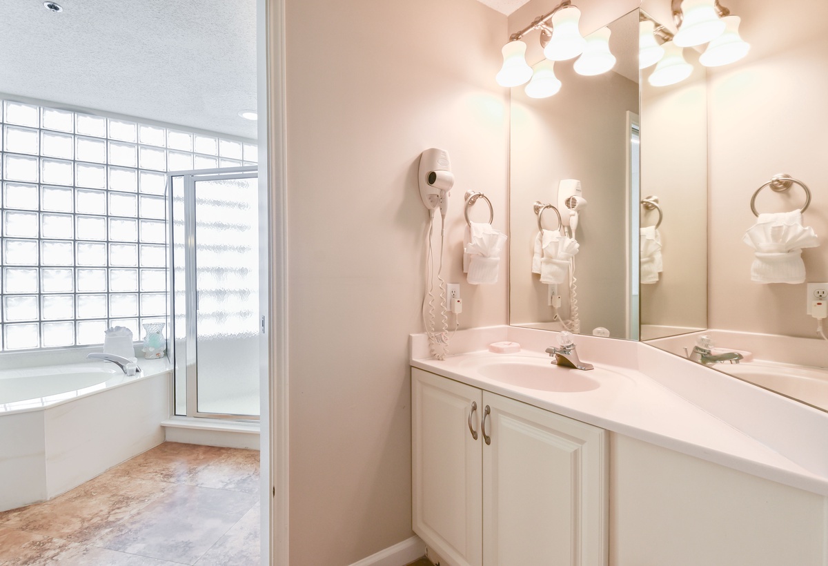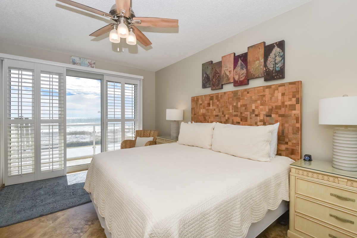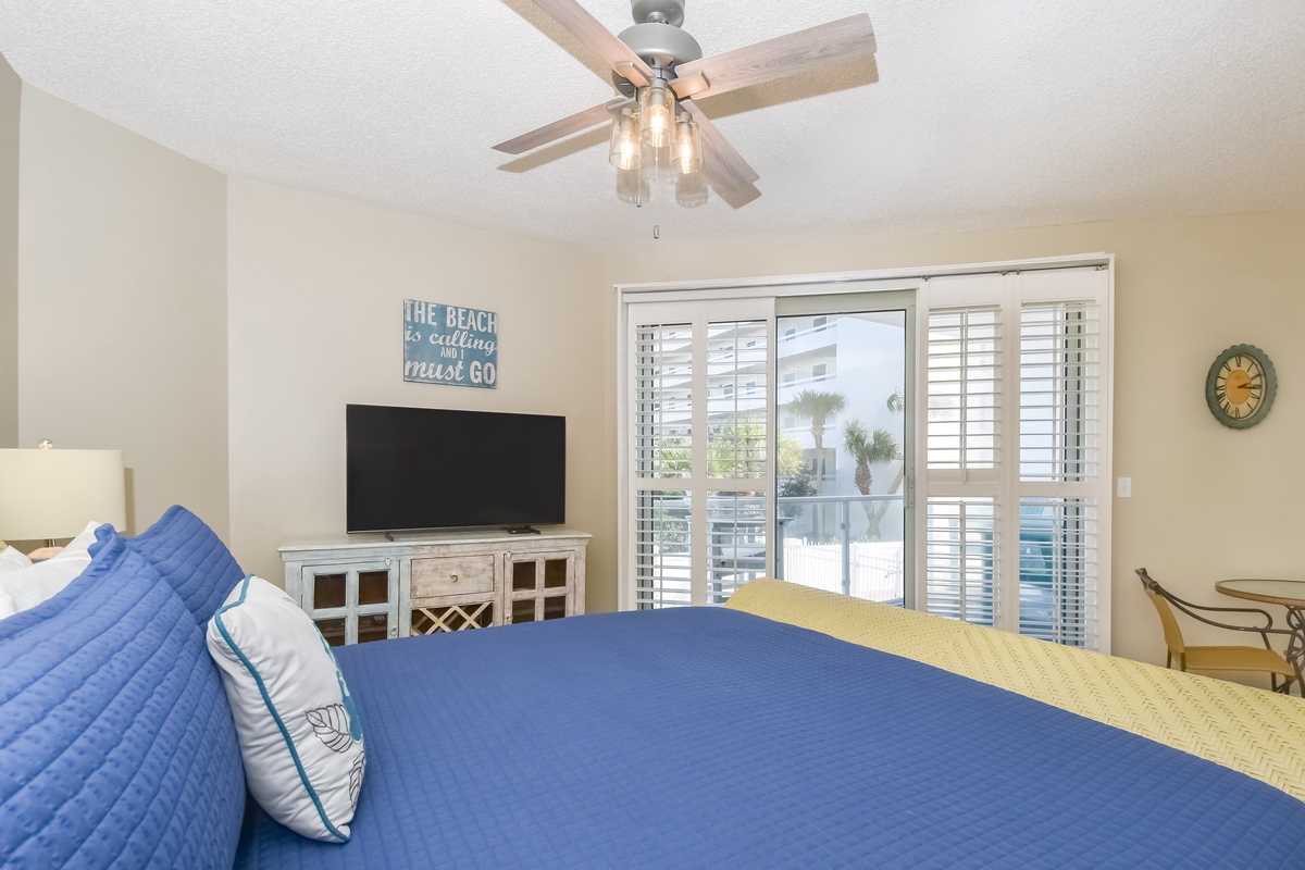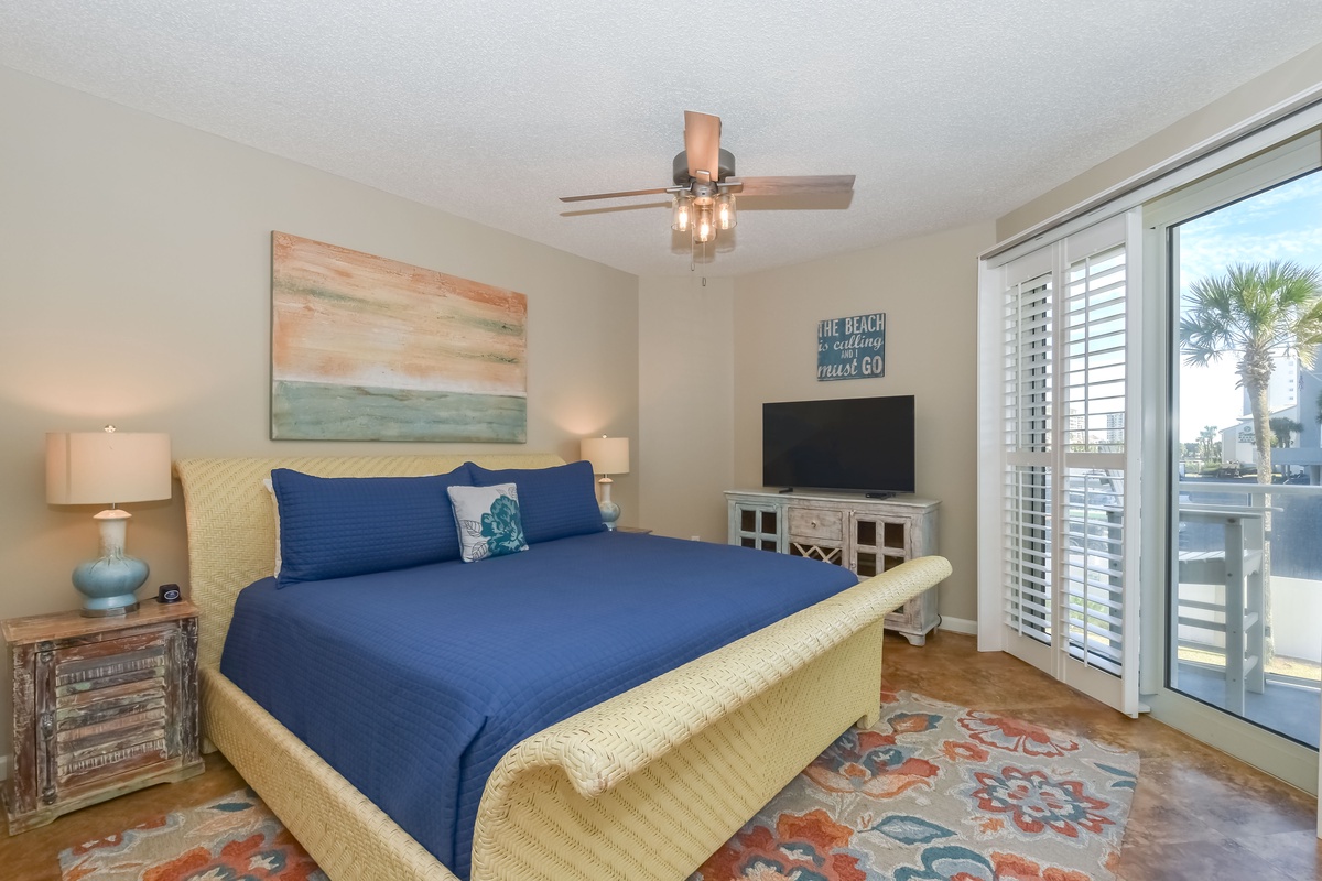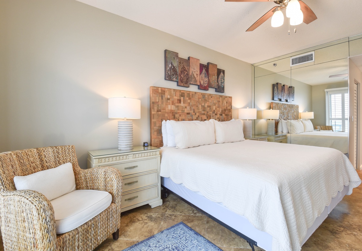 The additional master bedroom has a king bed, flat-screen TV and a private entrance to the beachfront balcony. The master bathroom has two vanities, a jetted tub, and a tiled walk-in shower. You're able to enjoy the white sands and sparkling emerald waters from the large balcony!