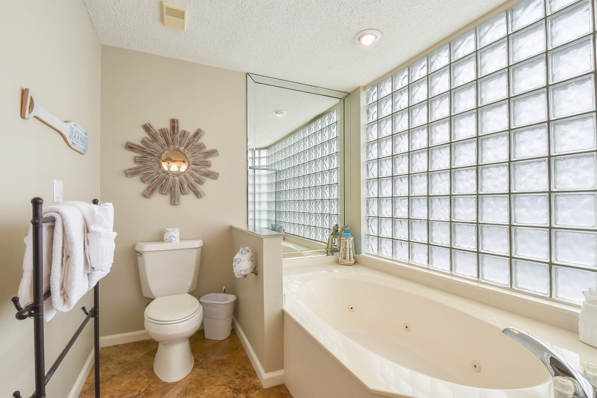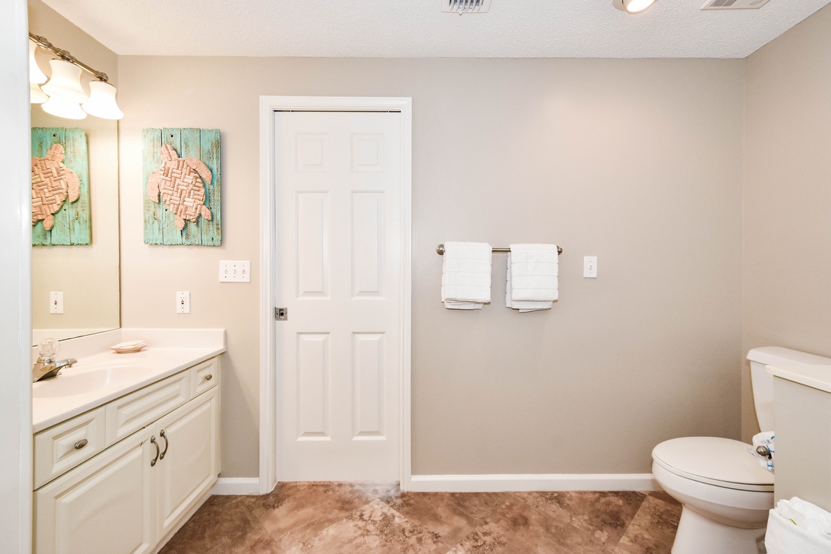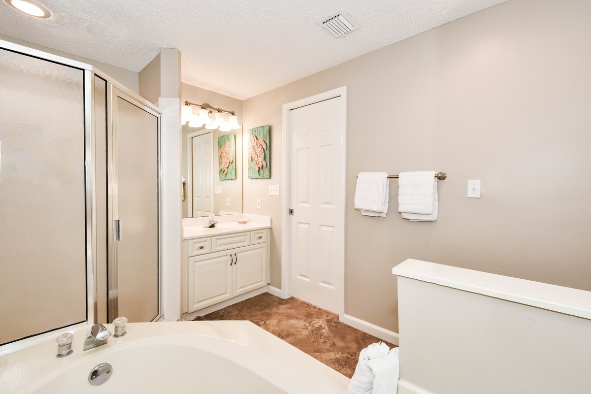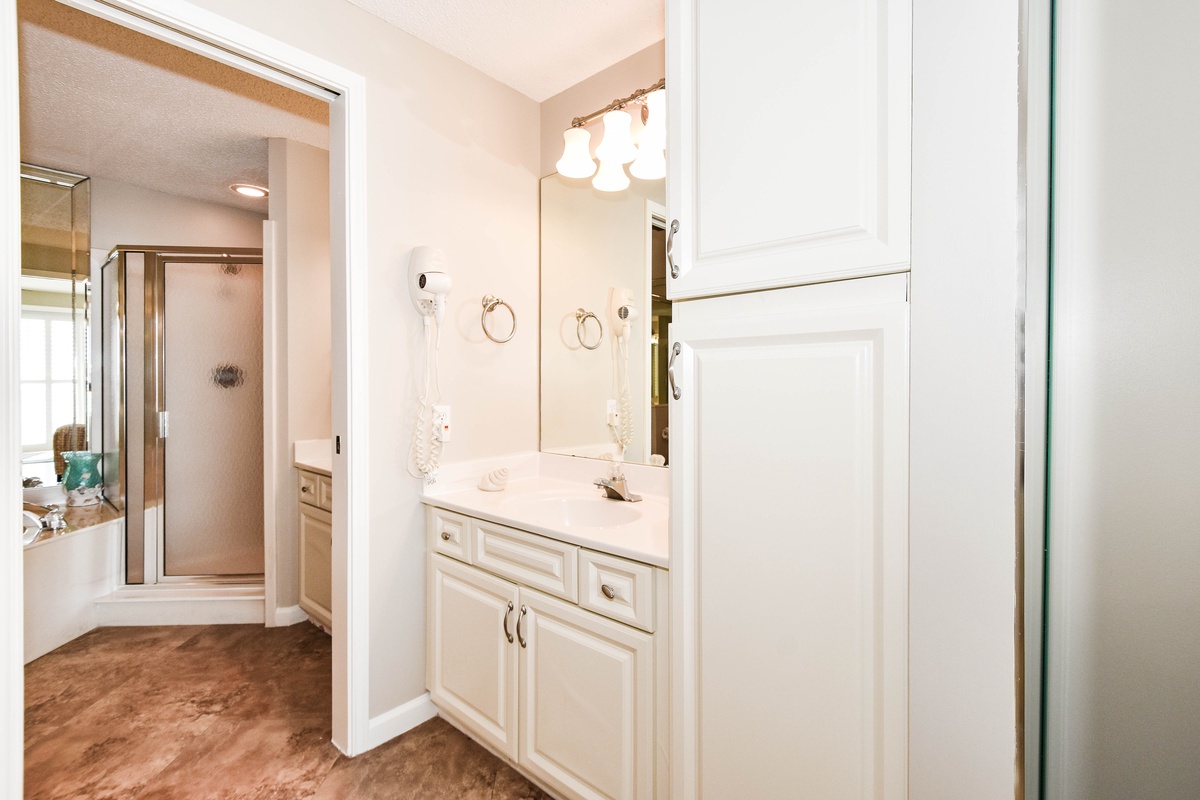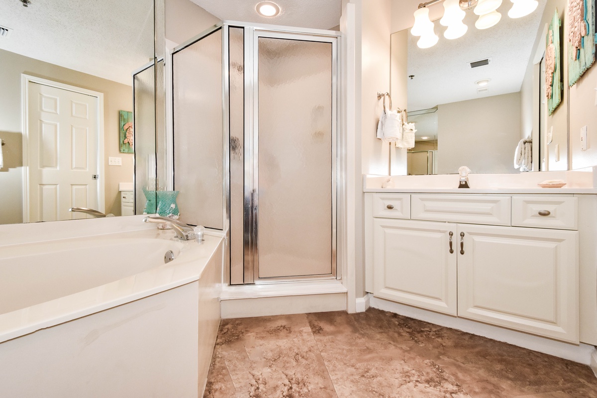 The additional master bedroom has a king bed, flat-screen TV and a private entrance to the beachfront balcony. The master bathroom has two vanities, a jetted tub, and a tiled walk-in shower. You're able to enjoy the white sands and sparkling emerald waters from the large balcony!
