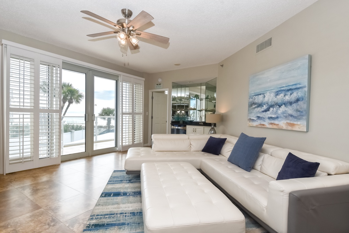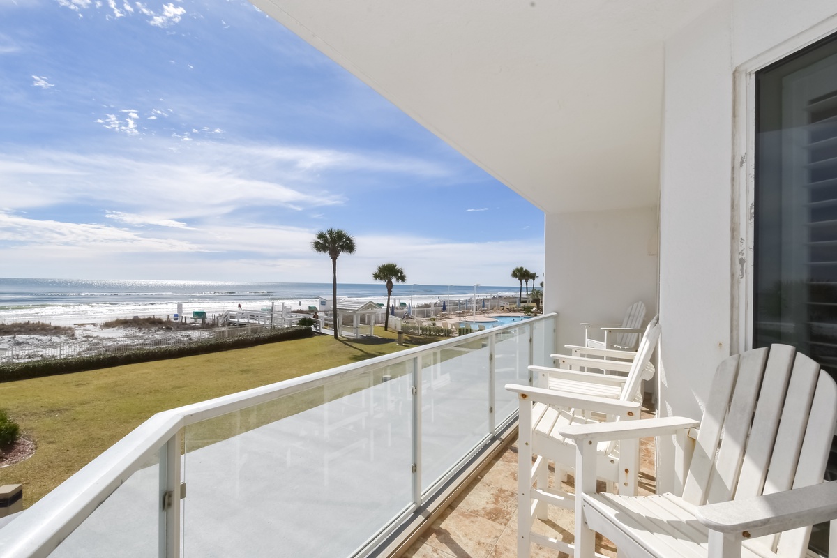 Sterling Sands 101 is a three-bedroom, three-bathroom, Gulf-front Condominium situated right on the sugary, white sand beaches of the Gulf of Mexico. Sterling Sands 101 has a private Gulf-front balcony that is accessed through the Living Area and master bedroom through floor-to-ceiling windows and sliding glass doors. The living area and both bedrooms are equipped with flat-screen TVs.
