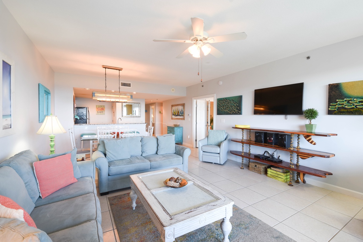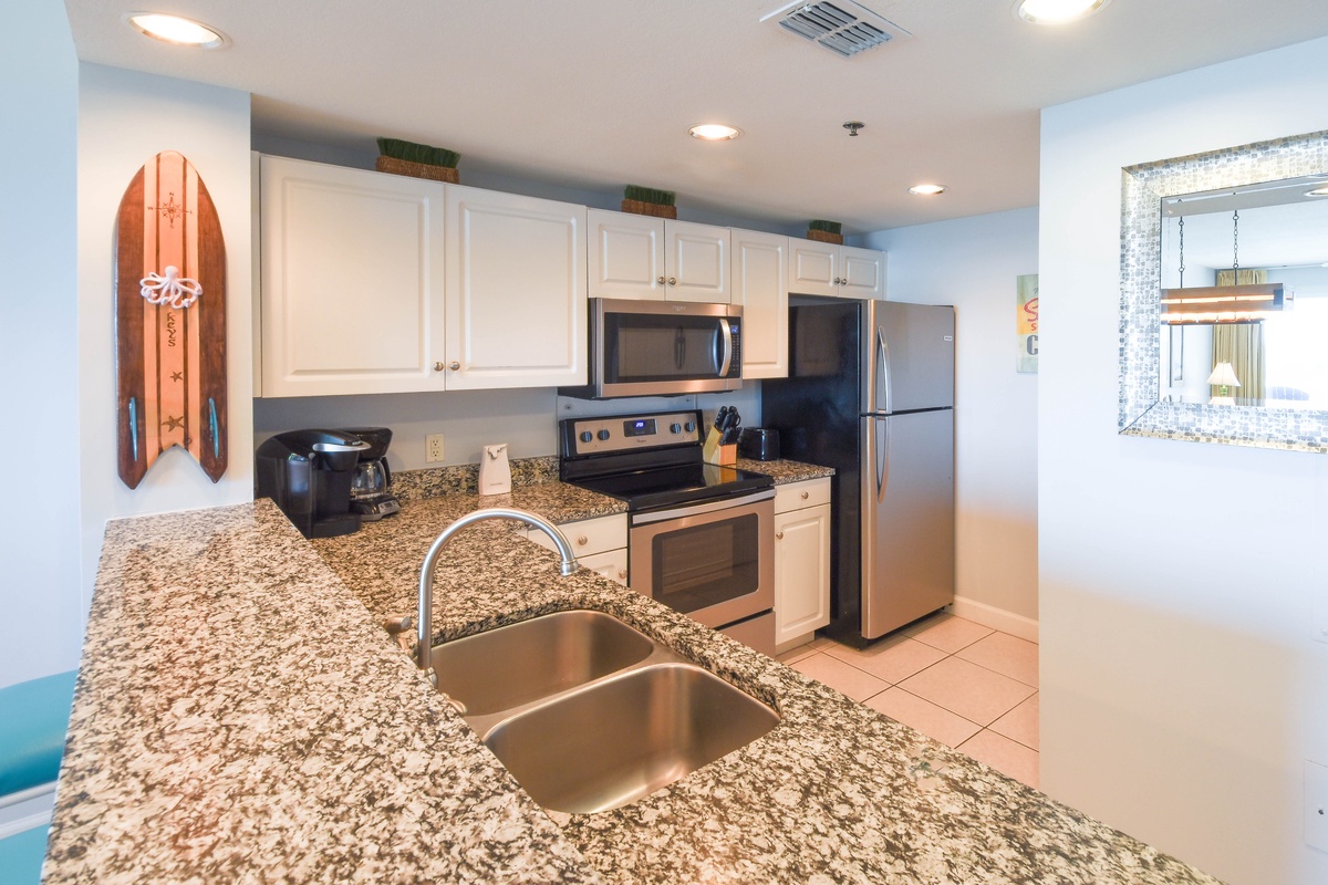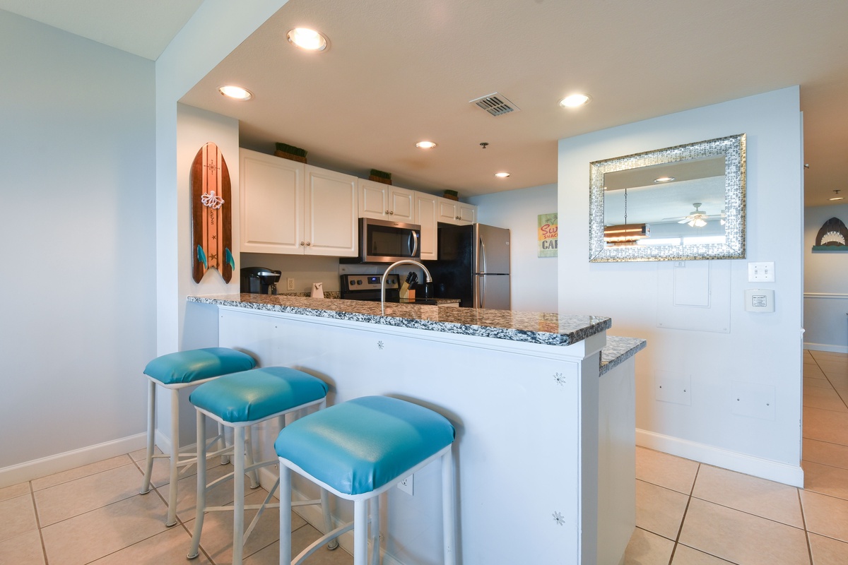 The open-concept floorplan provides the space for you to spend time with your loved ones and still be able to spread out and relax. The living area features plenty of seating for large parties, a queen sleeper sofa for additional accommodations, and a flat-screen TV for everyone to gather around. The living room leads to the private balcony, which offers some of the most beautiful views in this part of the beach community. The wall-to-wall floor-to-ceiling windows also allow you to take in those views from multiple locations throughout the home. The dining area has seating for six with additional seating for three at the breakfast bar. The kitchen is fully equipped with all the cookware and dinnerware for you and your family to make memorable meals from the comfort of your vacation home.