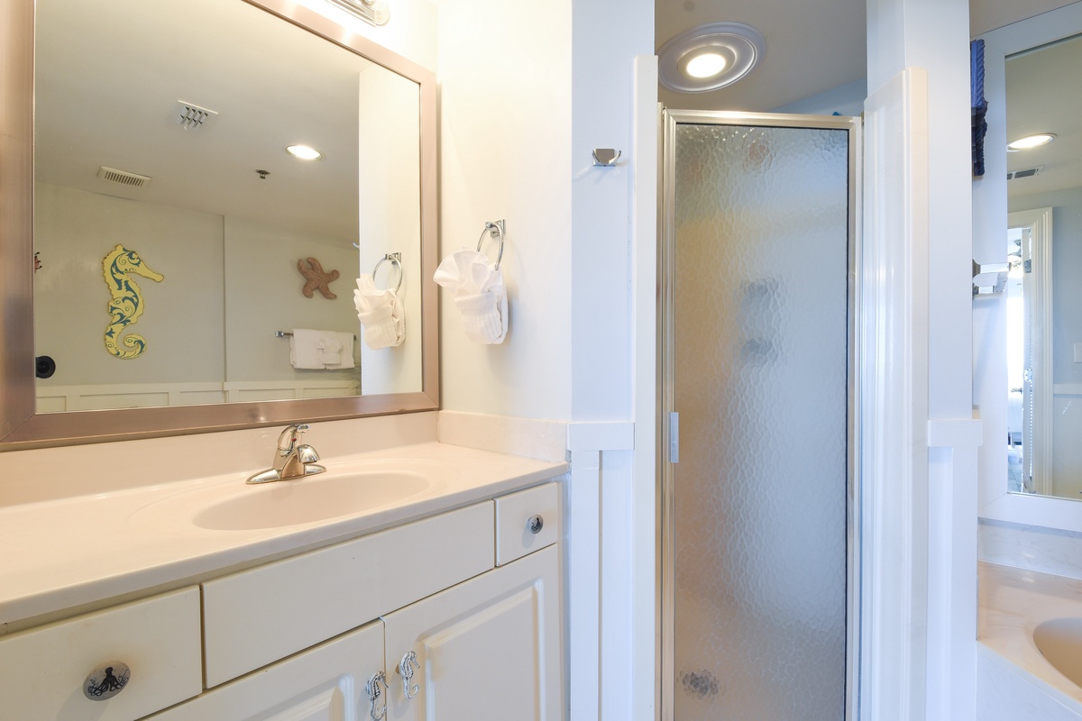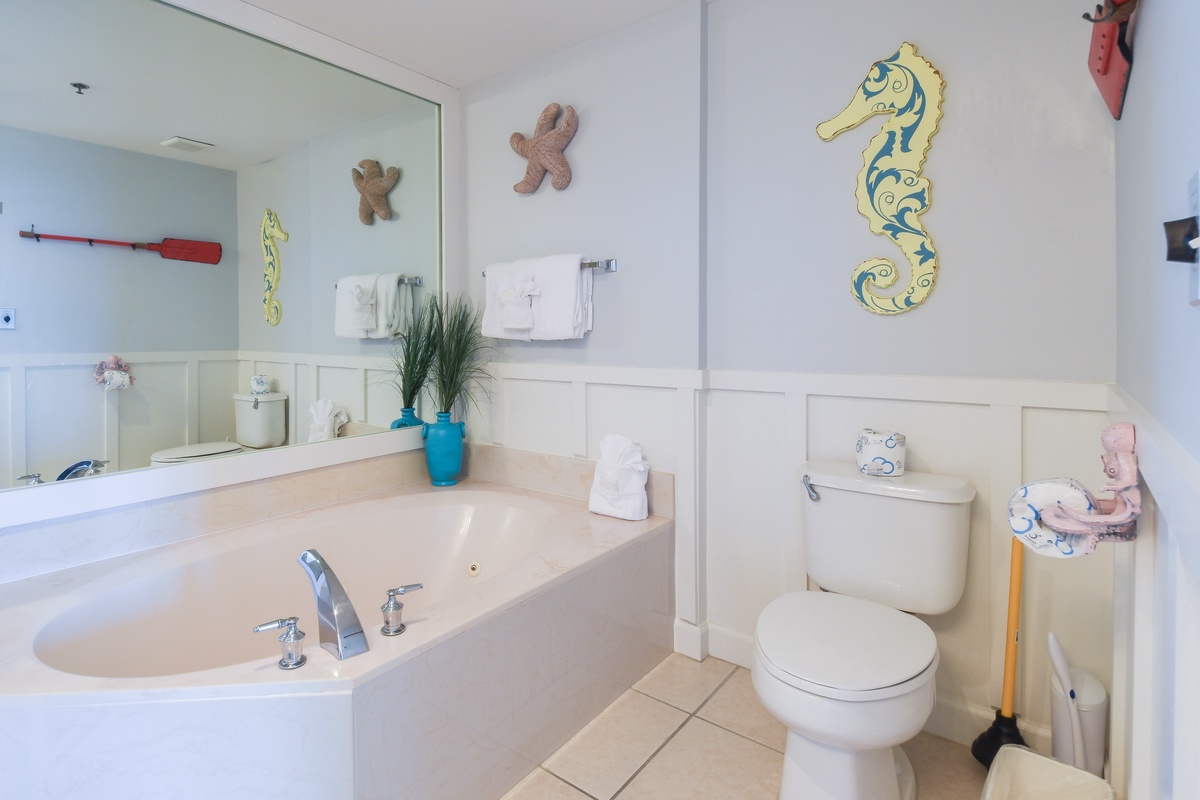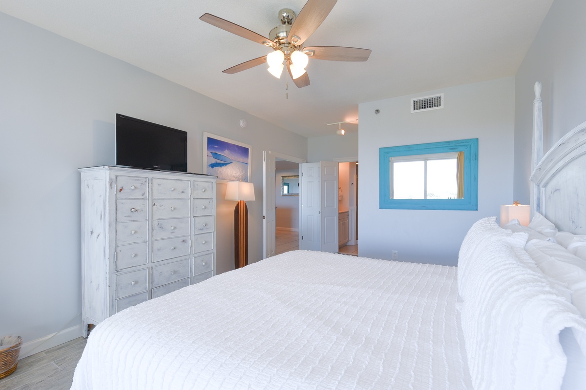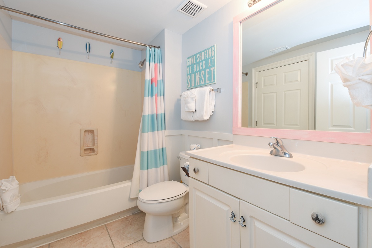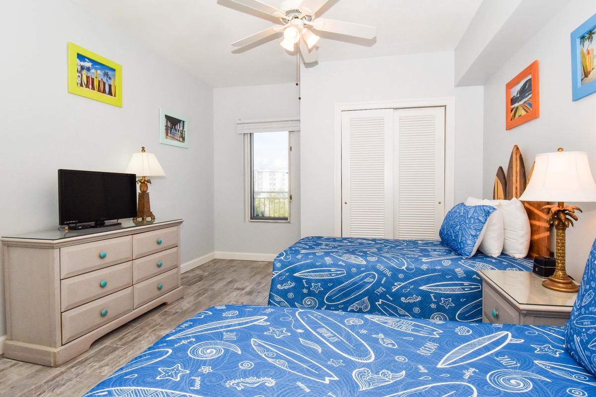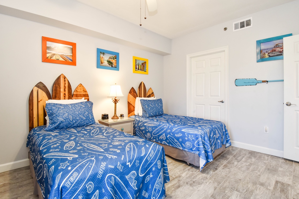 The spacious primary bedroom has a king bed, flat-screen TV, walk-in closet, and a private balcony entrance. The private primary bathroom has a jetted tub, walk-in shower, and vanity. The guest bedroom is coolly outfitted in surfing decor, and it features two twin beds and a flat-screen TV. Just steps from the guest bedroom are the centrally located guest bathroom with a tub/shower combination and a vanity.