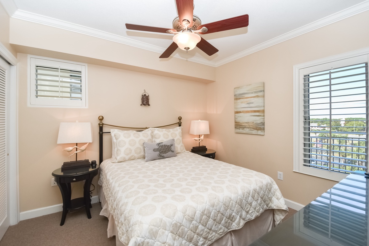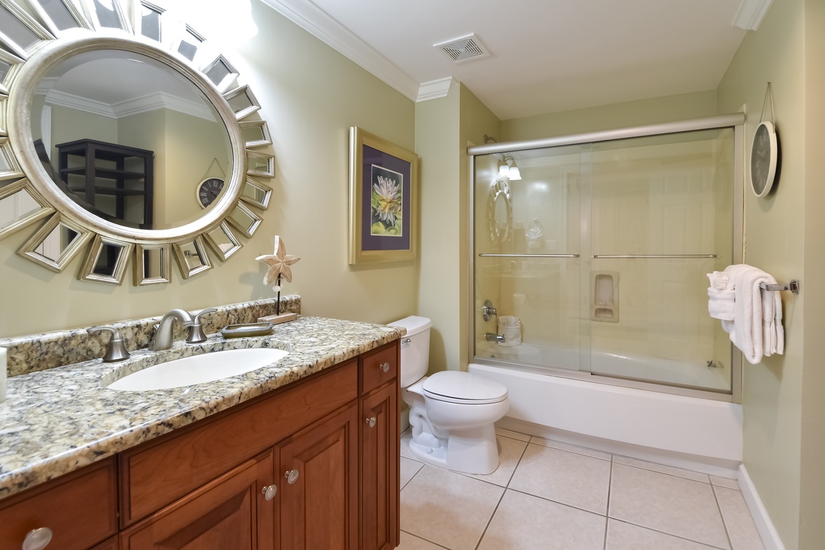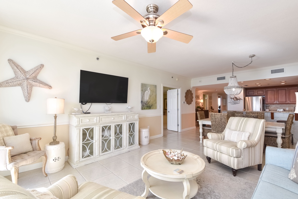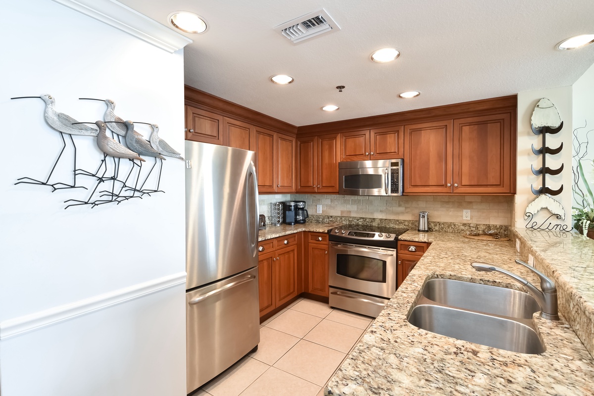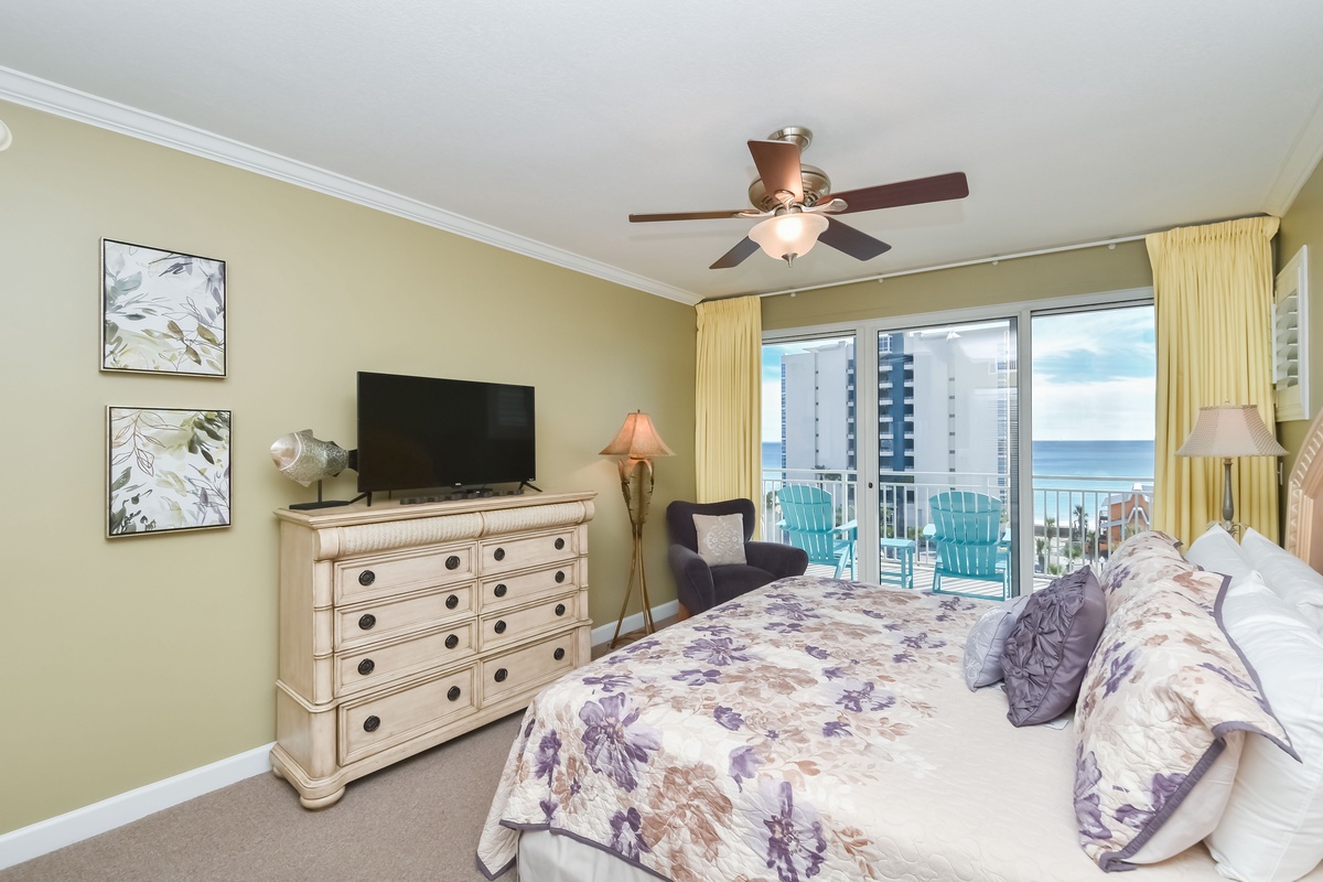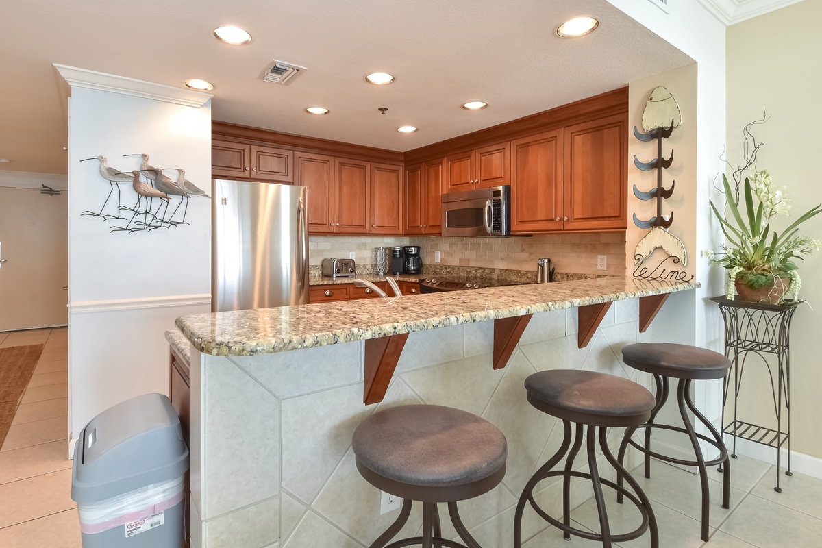 The open-concept floor plan allows plenty of space for your family to enjoy without having to sacrifice comfort. The living area is tastefully decorated with plenty of seating options for your party to gather around the large flat-screen TV. A queen sleeper sofa accommodates larger parties and large picturesque windows open directly to the furnished private balcony with plenty of seating for the whole family to enjoy the sunset. Adjacent to the living area, a large dining table seats up to six, with additional seating at the breakfast bar. A fully equipped kitchen ensures that you don’t have to skip out on family dinners!