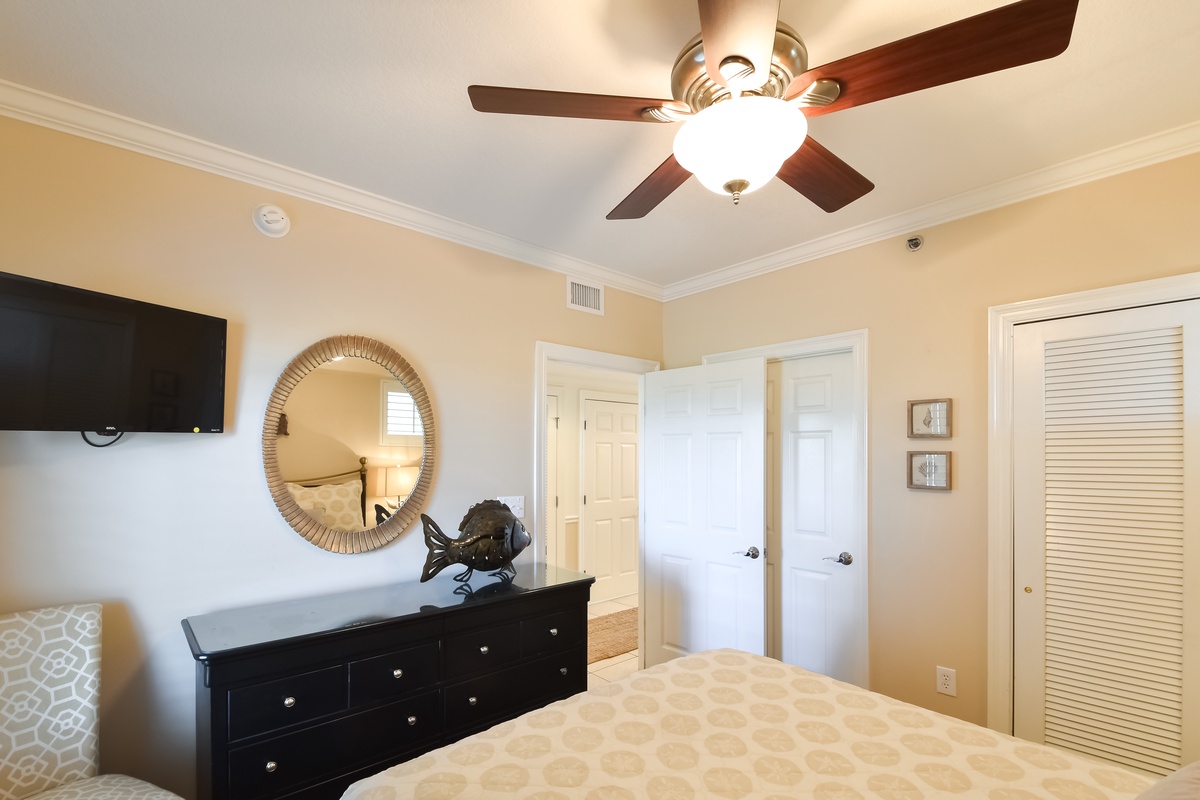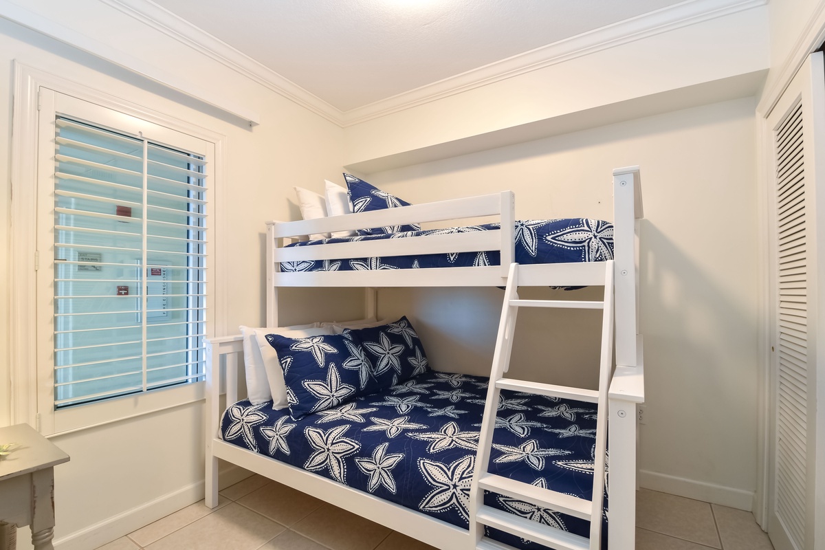 The first guest bedroom features a full-sized bed, a large closet, and a flat-screen TV, as well as direct access to the shared guest bathroom. Across the hall, the second guest bedroom features a twin-over-full bunk bed, a flat-screen TV, and a large closet.