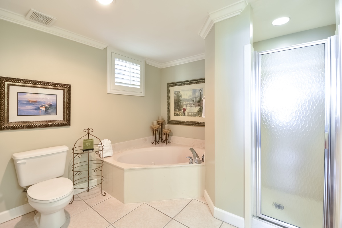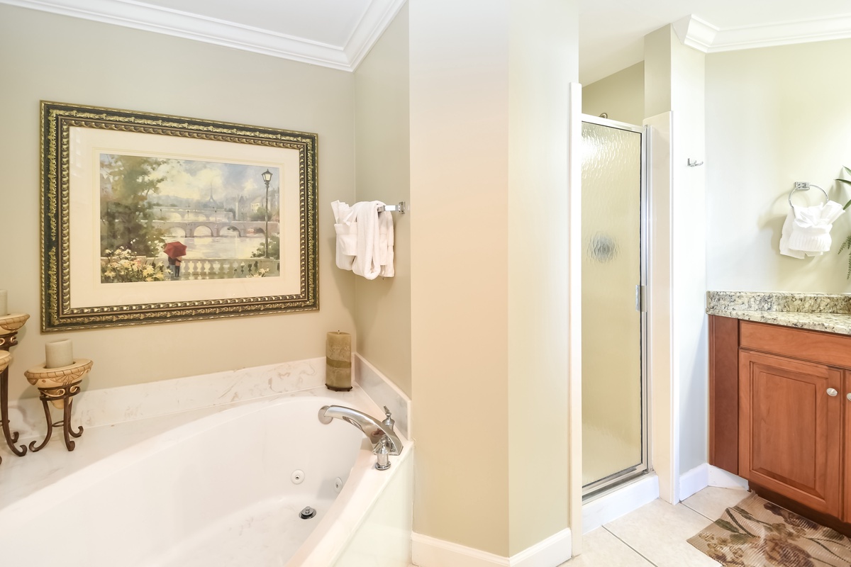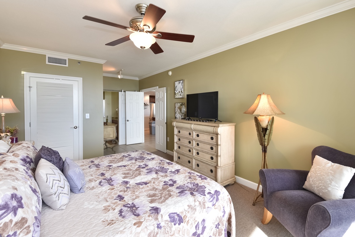 French doors open up to the master bedroom with a king-sized bed, a large walk-in closet, flat-screen TV, private access to the furnished balcony, and a private ensuite bathroom. The master bathroom features a vanity, a large jetted soaker tub, and a walk-in shower.