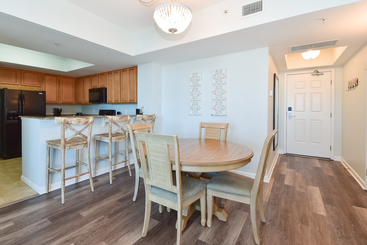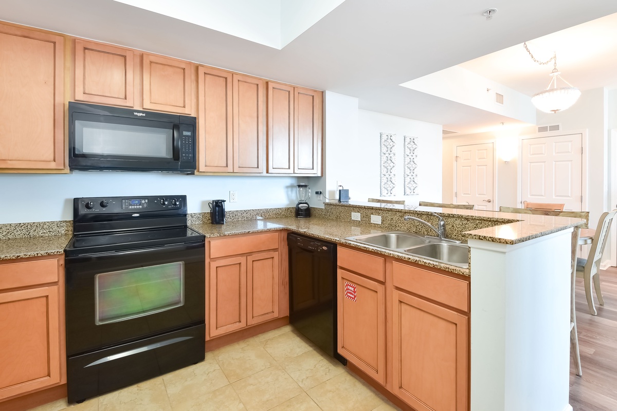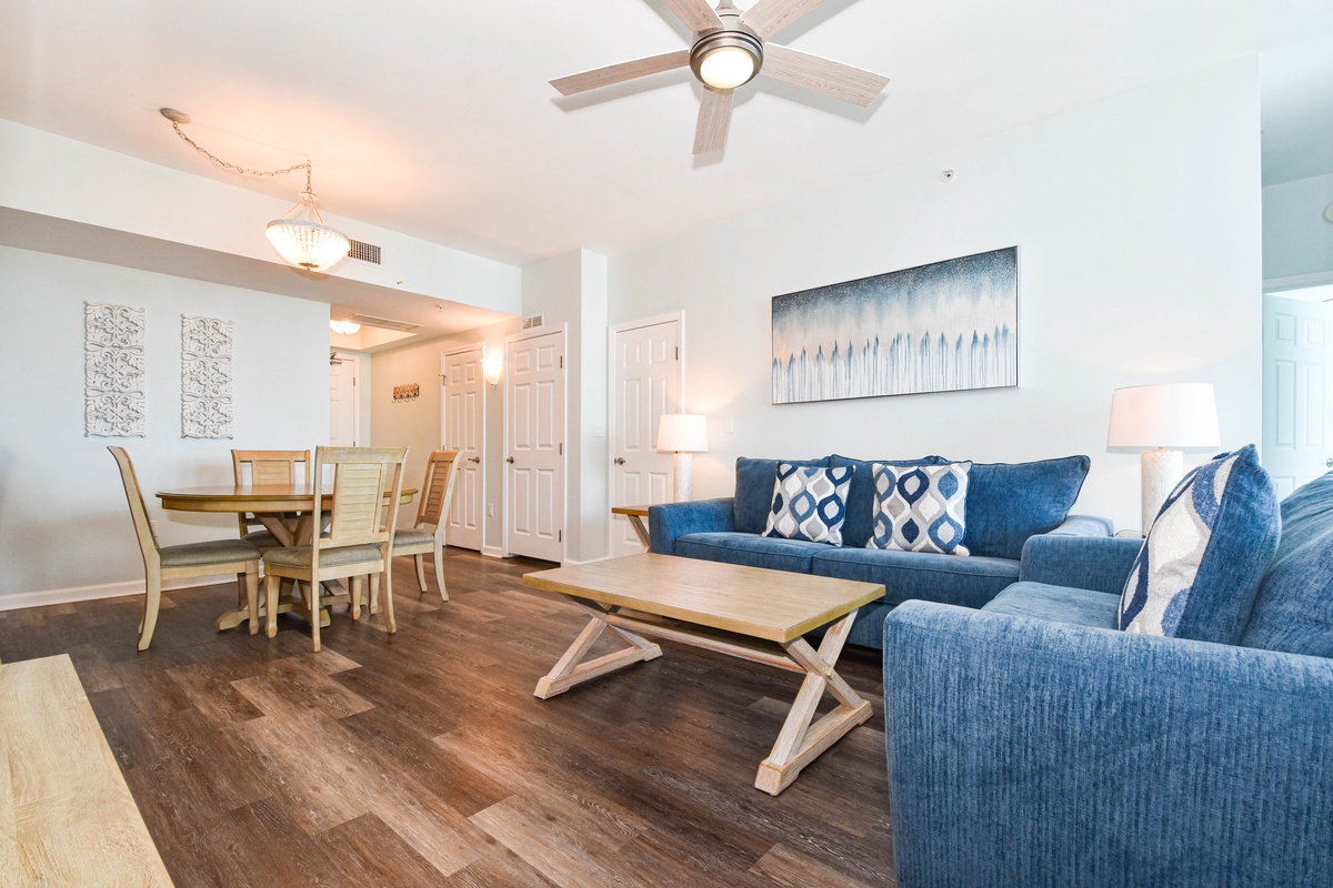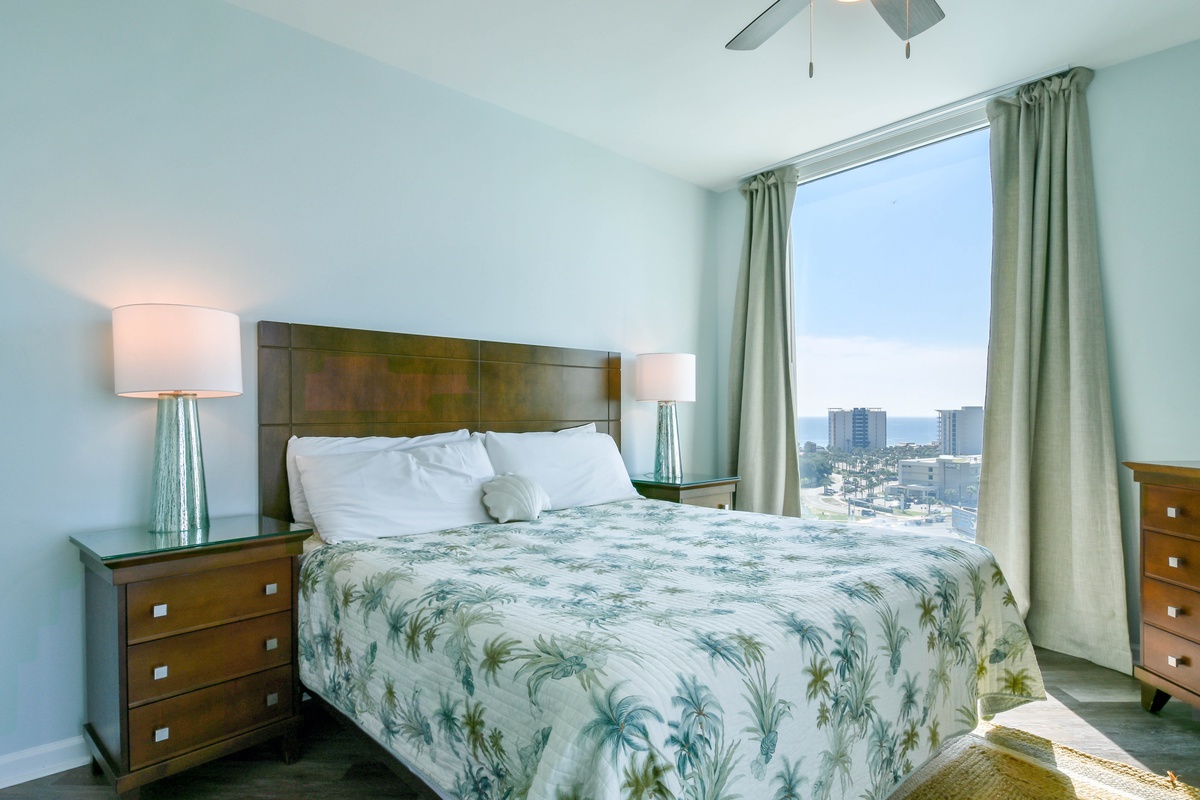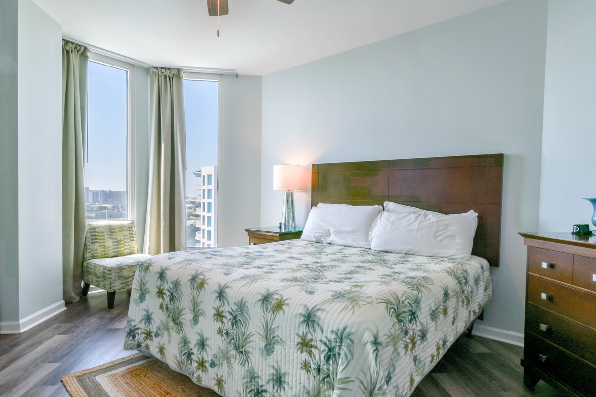 Welcome to The Palms of Destin 11115! Located on the eleventh floor, this updated two-bedroom, two-bathroom condo offers a stylish and comfortable retreat in the heart of Destin, Florida. Whether you’re lounging poolside or heading to the beach, this centrally located vacation rental has everything you need for a memorable getaway. The open-concept living and dining area is bright and inviting, featuring a flat-screen TV, queen sleeper sofa, and access to a private balcony overlooking Destin’s largest lagoon pool, perfect for morning coffee or evening relaxation. The fully equipped kitchen includes modern appliances, granite countertops, and a breakfast bar, with an adjacent dining area that’s ideal for gathering with family and friends. The spacious primary bedroom features a king bed, large closet, and a private en-suite bathroom with a walk-in shower. The guest bedroom also offers a king bed and has convenient access to the second full bathroom, making this condo a great choice for couples or families traveling together. A washer and dryer, secure Wi-Fi, and all the comforts of home are included for added convenience.