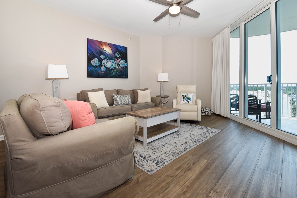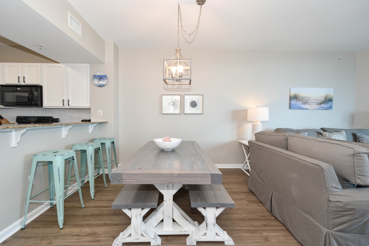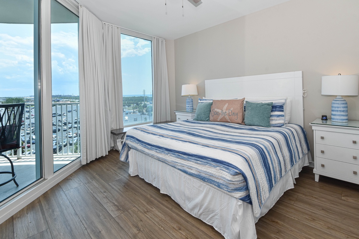 Welcome to The Palms of Destin 1610 Junior! Slip into vacation mode at this serene sixth-floor retreat, where relaxed coastal style and modern comfort set the tone for your perfect beach escape. With two bedrooms, two bathrooms, and plenty of space to accommodate up to six guests, this stylish condo has everything you need for an unforgettable Destin getaway. Floor-to-ceiling sliding glass doors lead out to your private balcony and offer glimpses of the sparkling Gulf, a perfect spot to sip your morning coffee or unwind at sunset with the warm sea breeze in the air. Inside, a fully equipped kitchen makes it easy to prepare everything from beach day snacks to fresh seafood dinners. The dining area seats four comfortably, with three additional barstools at the counter for casual bites or late-night treats. After a day of soaking up the sun at the beach or lounging by the resort’s iconic lagoon pool, relax in the spacious living room and watch a favorite movie on the flat-screen TV. Unwind in the primary bedroom featuring a plush king bed, flat-screen TV, balcony access, and an attached bathroom with a tub/shower combo. The guest bedroom offers a twin-over-full bunk bed, a TV, and is just steps away from a second bathroom with a walk-in shower. For added conveniences there is also a sleeper sofa in the living area, a washer and dryer, complimentary WiFi, and full access to The Palms of Destin’s resort-style amenities, everything designed to make your vacation seamless and stress-free. Soak up the sun, embrace the serene coastal vibes, and unwind in style—your dream Destin vacation starts here at The Palms of Destin 1610.