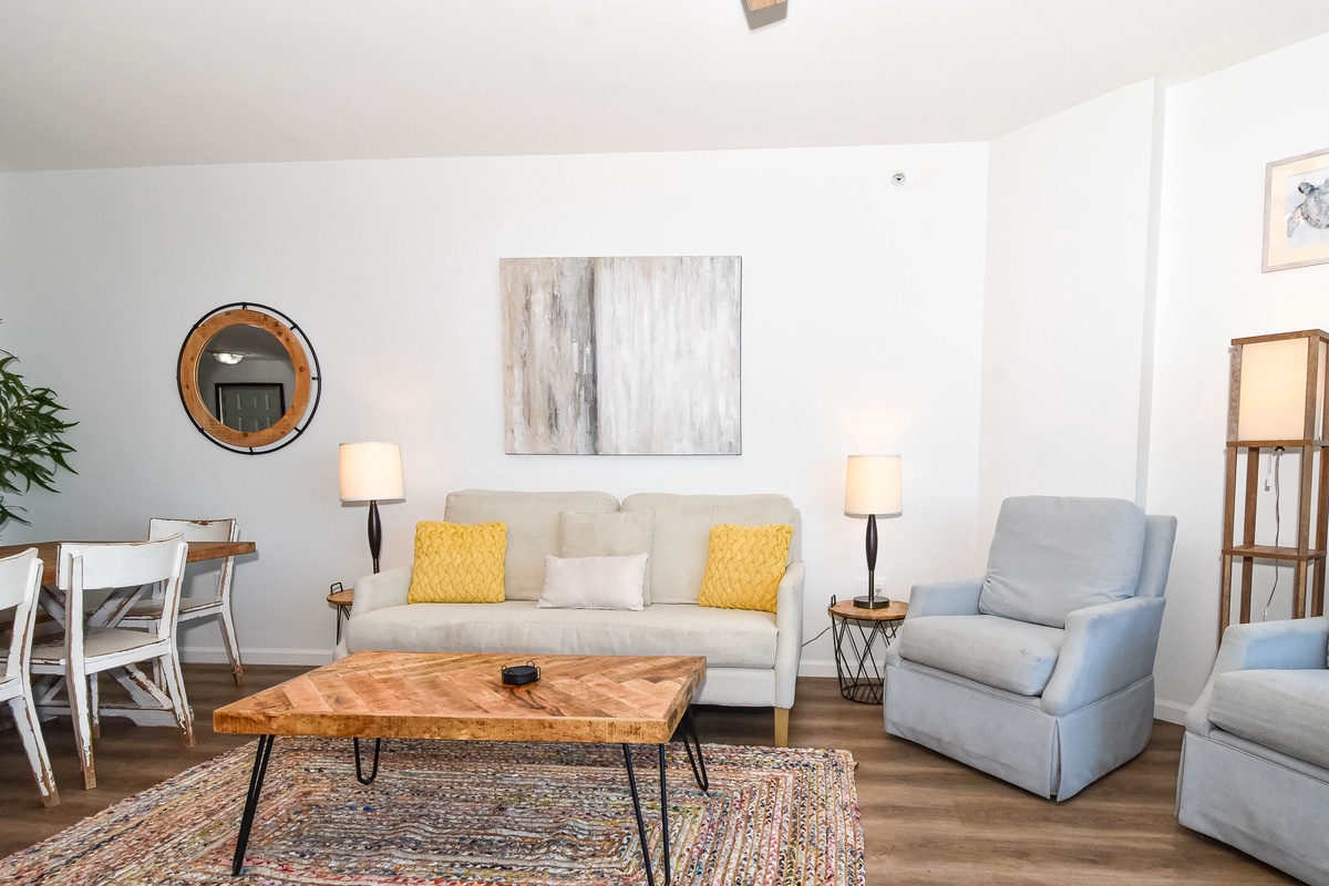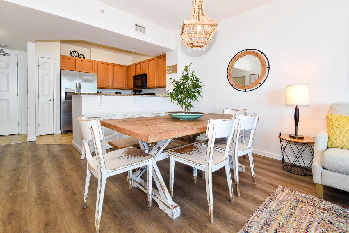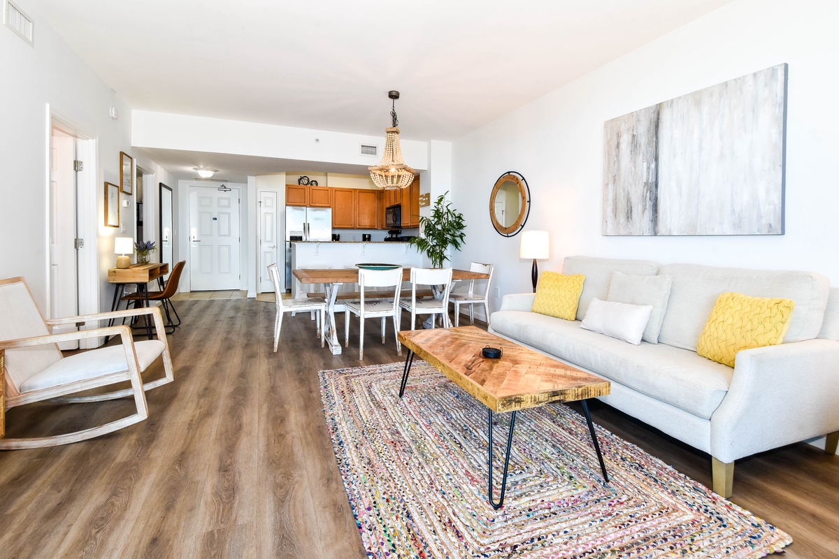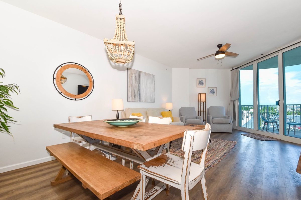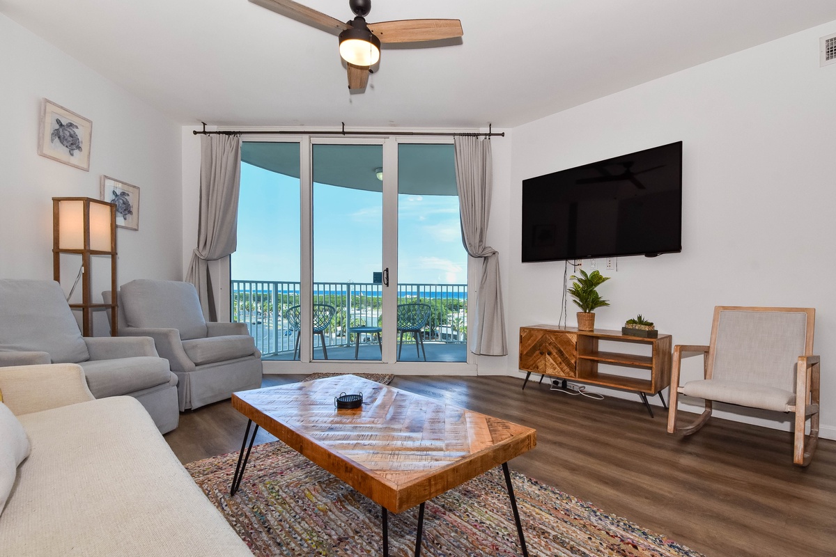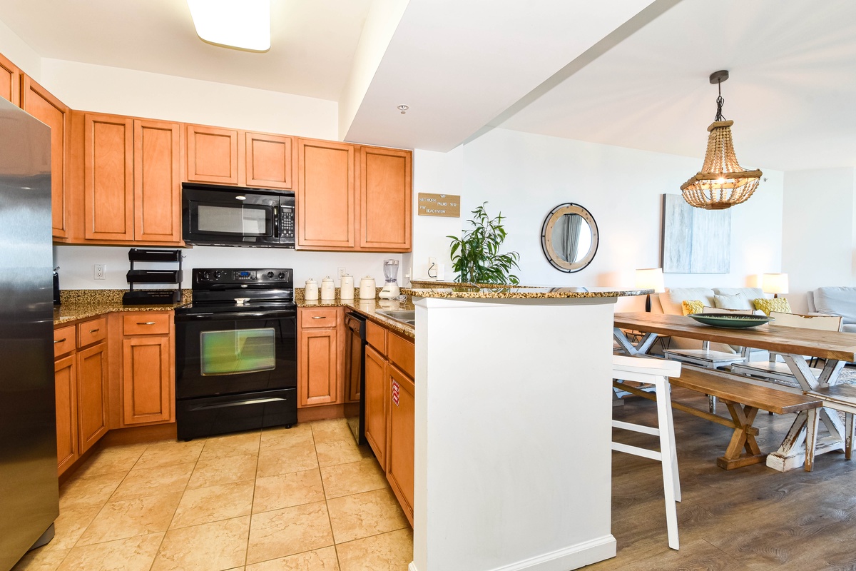 Welcome to The Palms of Destin 1612 Junior! Step into your dream beach retreat in this stylish sixth-floor condo with breezy boho coastal decor, two bedrooms, two bathrooms, and plenty of space to comfortably accommodate up to six guests. Floor-to-ceiling sliding glass doors lead out to your private balcony and catch glimpses of the sparkling Gulf, an ideal setting for your morning coffee or evening unwind. Inside, the fully equipped kitchen boasts all the essentials to whip up a delicious meal. The dining area seats six comfortably, with three additional barstools at the counter for casual bites and late-night snacks. After a sun-soaked day at the beach or lounging by the resort pool, kick back in the spacious living room and enjoy a favorite movie on the flat-screen TV. Unwind in the primary bedroom featuring a plush king bed, flat-screen TV, balcony access, and an attached bathroom with a tub/shower combo. The guest bedroom offers a full-over-full bunk bed and is just steps away from a second bathroom with a walk-in shower. For added conveniences there is also a washer and dryer, complimentary WiFi, and full access to The Palms of Destin’s resort-style amenities, everything designed to make your vacation seamless and stress-free. Soak up the sun, embrace the boho beach vibes, and unwind in style—your dream Destin vacation starts here at The Palms of Destin 1612.