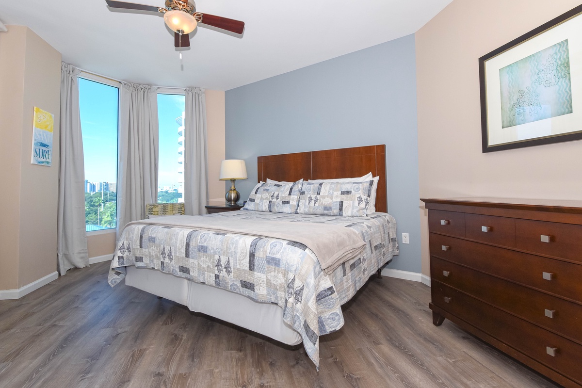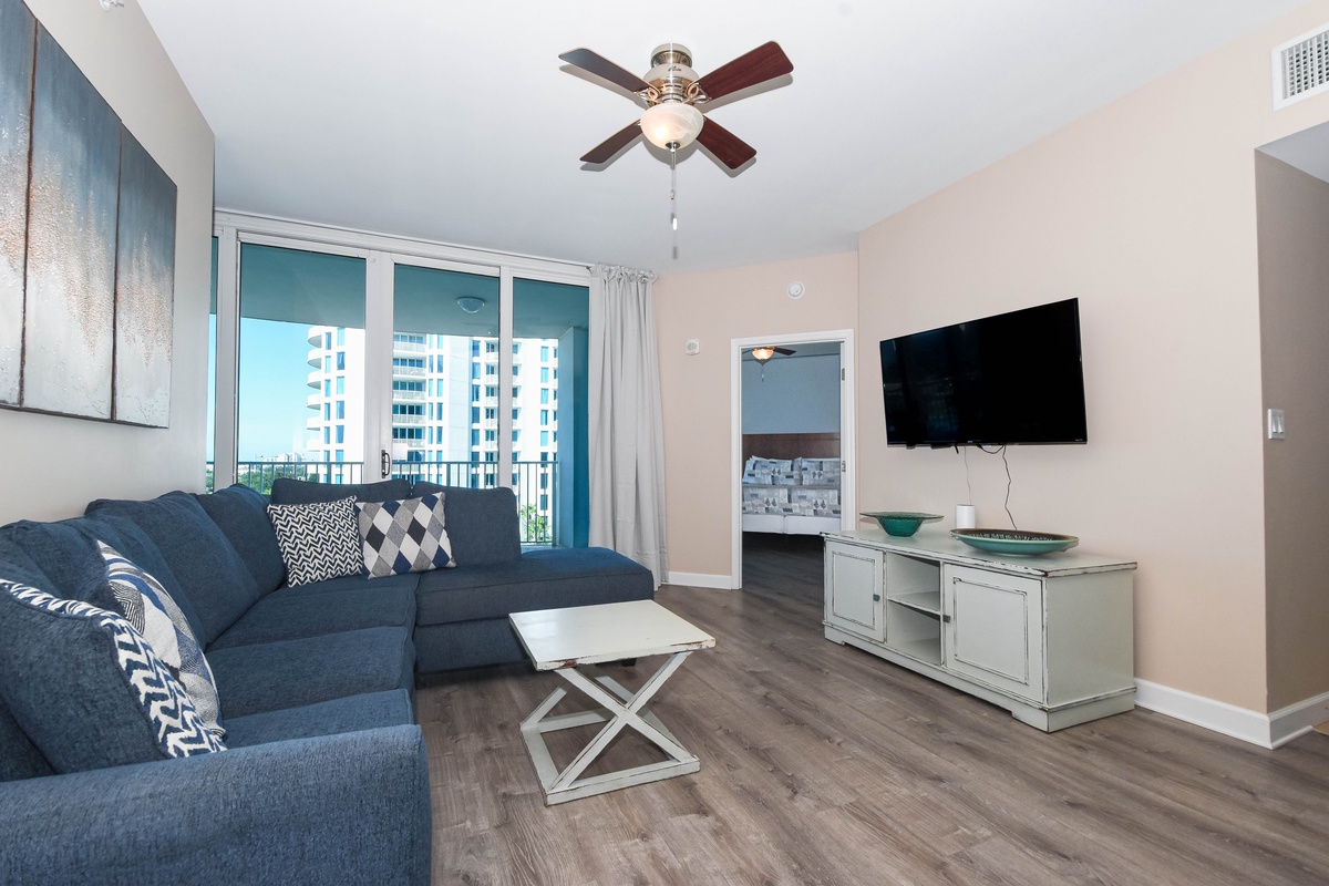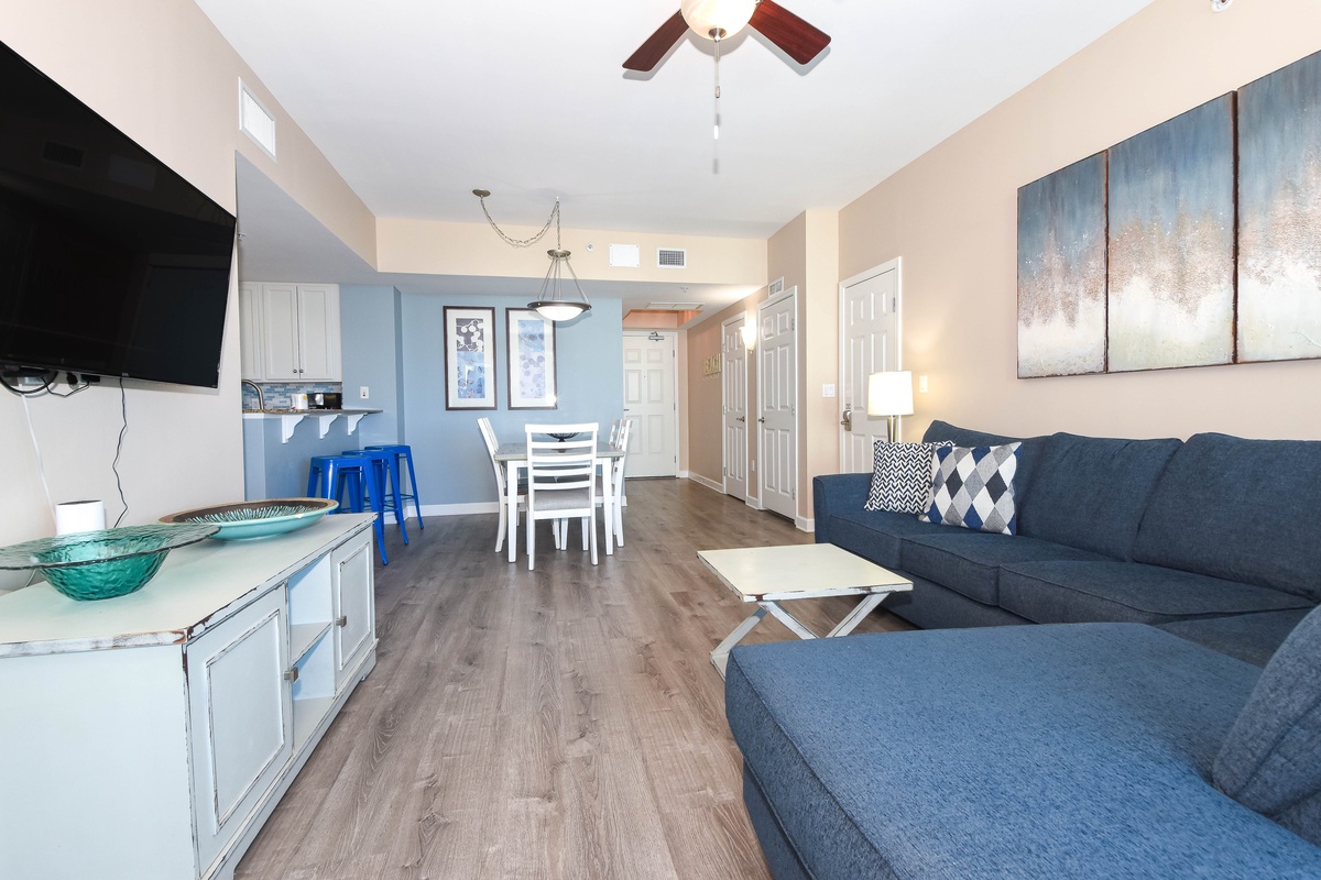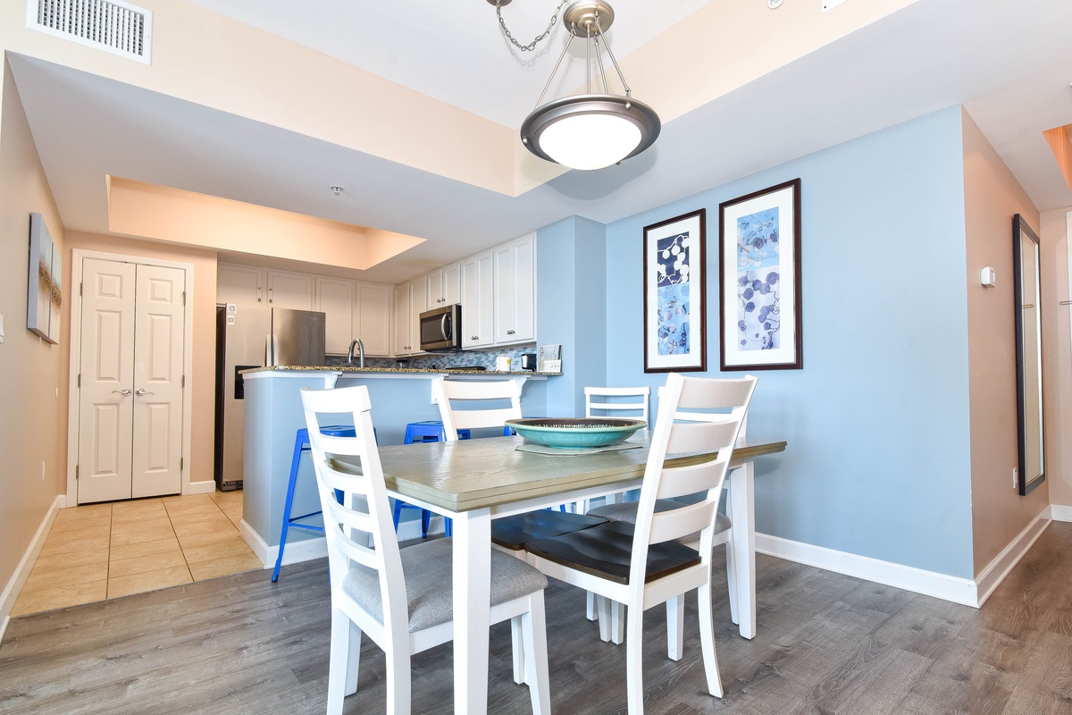 Welcome to The Palms of Destin 1615, your perfect escape in the heart of Destin. This beautifully updated two-bedroom, two-bath vacation rental condo in Destin is located on the sixth floor and features stunning views of the resort’s signature lagoon pool. Whether you're sipping your morning coffee on the private balcony or unwinding after a day on the beach, this condo offers the ideal setting for a relaxing and memorable Emerald Coast vacation. Step inside and enjoy the light-filled open floor plan, designed for coastal comfort and convenience. The fully equipped kitchen includes stainless steel appliances and all the essentials to whip up quick beach snacks or a home-cooked meal after a fun-filled day. Share meals at the dining table that seats four, with additional seating for three at the breakfast bar, perfect for family dinners or casual bites. The airy living area is made for laid-back beach vibes, complete with cozy seating, a large flat-screen TV, and direct balcony access. The primary suite is a true retreat with a king bed, private balcony access, flat-screen TV, and an en-suite bathroom with a walk-in shower. The guest bedroom features a king bed, a TV, easy access to the second full bathroom with tub/shower combo, plus balcony access. For added convenience there is a sleeper sofa in the living area, in-house laundry, and secure WIFI, perfect for longer stays or remote work while vacationing. During your stay, enjoy full access to all the amazing amenities at The Palms of Destin Resort, including the lagoon-style pool, hot tub, fitness center, playground, on-site restaurant and bar, and a seasonal beach shuttle that takes you straight to the sugar-white sands Destin is famous for. You're just minutes away from Destin’s most popular restaurants, shopping at Destin Commons, and family attractions like Big Kahuna’s Water Park and HarborWalk Village. The Palms of Destin 1615 offers the perfect mix of comfort, location, and resort-style amenities, making it the ideal choice for your next Destin beach getaway.