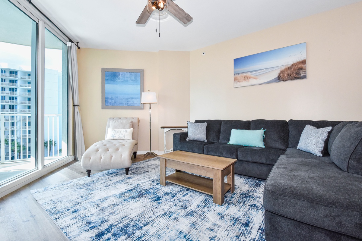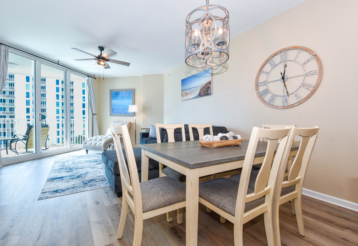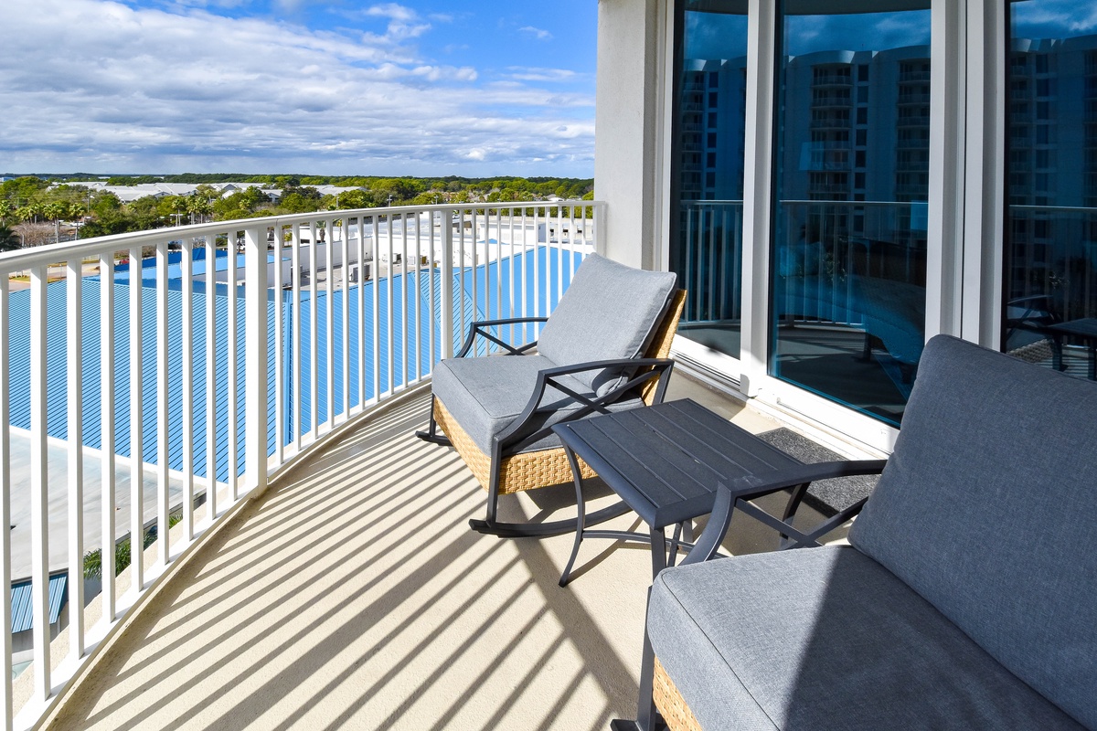 Welcome to The Palms of Destin 1705 Junior, your perfect home away from home for a relaxing Destin beach vacation. This two-bedroom two-bath condo sits on the seventh floor, offering fantastic views of the resort-style lagoon pool and peekaboo views of the gulf from your private balcony. Start your morning with coffee in hand, soaking in the coastal vibes from above. Inside you will find an open floor plan, designed for comfort and connection. A fully equipped kitchen is perfect for a quick snack or whipping up a delicious home cooked meal. Enjoy meals together at the dining table for six, with extra seating for four at the breakfast bar. The open floor plan flows into the spacious living area featuring a large flat screen TV and balcony access. The primary bedroom features a king bed, tv, balcony access, and attached bathroom with a tub/shower combo. The guest bedroom offers a full-over-full bunk bed with TVs and is steps away from the guest bathroom with a walk-in shower. For added convenience there is sleeper sofa in the living area, in-house laundry, and secure WIFI. Whether you're lounging by the lagoon pool, spending the day at the nearby sugar-white sands of the Destin beaches, or exploring local dining and attractions, The Palms of Destin 1705 is the perfect place to call your home away from home.