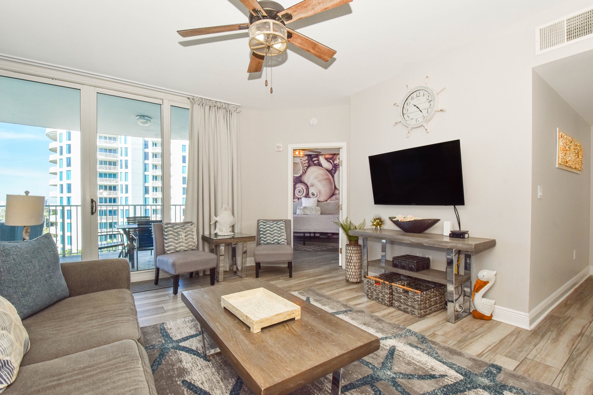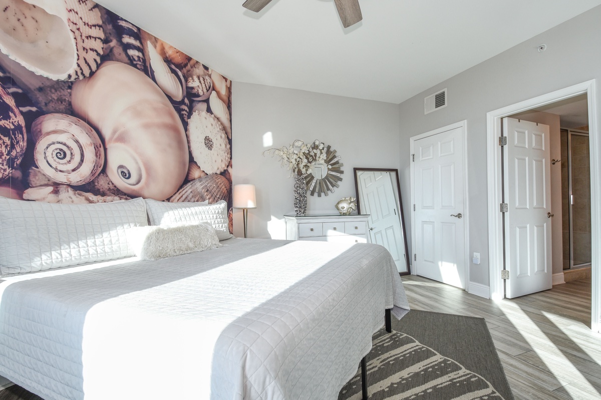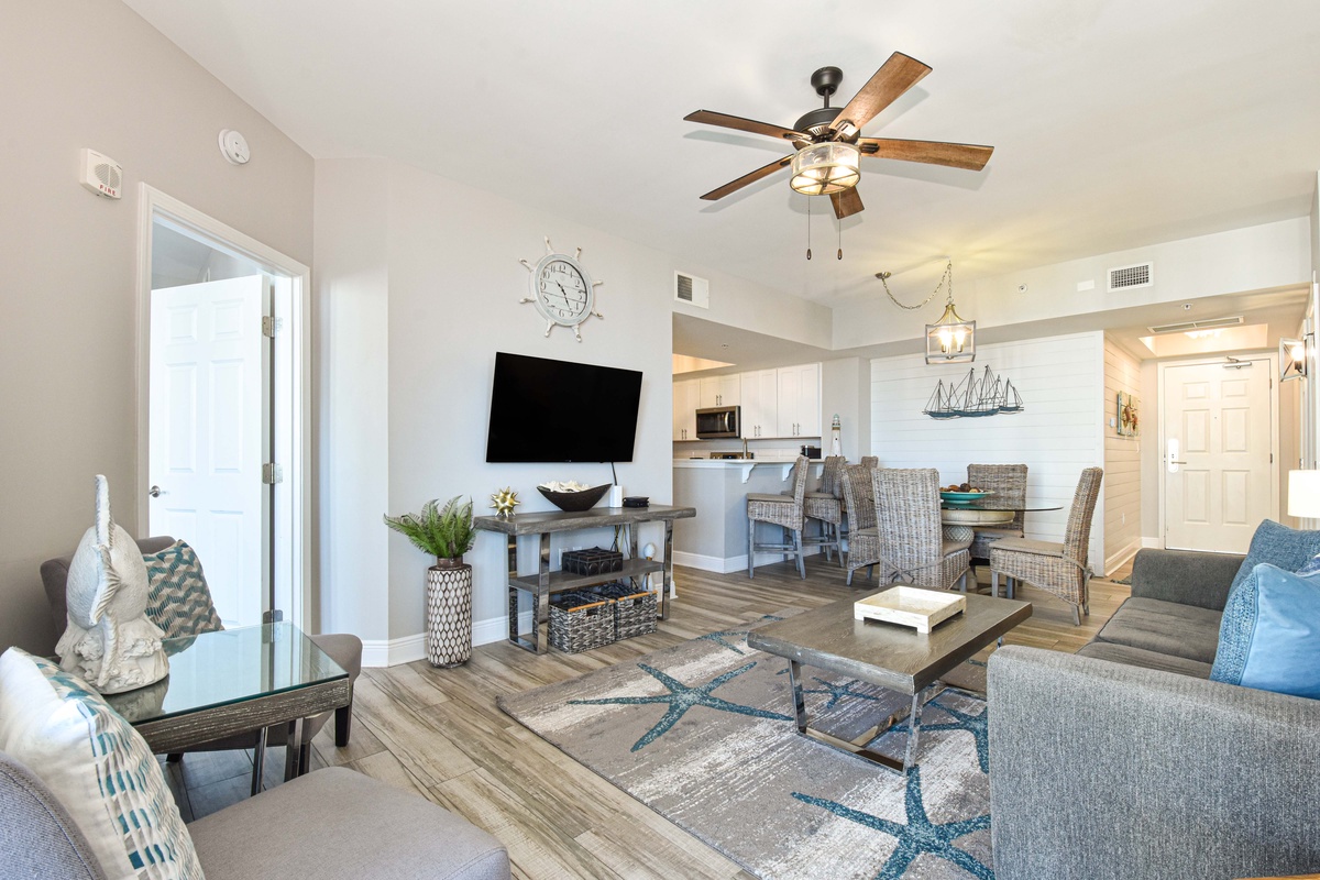 Welcome to The Palms of Destin 1715, your modern coastal escape in the heart of paradise. Perched on the seventh floor, this beautifully styled two-bedroom, two-bathroom condo comfortably sleeps up to six guests and delivers stunning views of the resort’s iconic lagoon-style pool. Step through the floor-to-ceiling sliding glass doors onto your private balcony and soak in the sunshine, swaying palms, and the vibrant energy that defines Destin. Inside, you’ll find a breezy, open-concept layout designed with coastal-modern flair. The living area invites you to kick back in comfort, with plush seating, a large flat-screen TV, and calming tones that set the scene for ultimate relaxation. The fully equipped kitchen features sleek quartz countertops, stainless steel appliances, and all the essentials for preparing anything from beach-day snacks to a full family dinner. Share meals and memories around the dining table for four, with extra seating for three at the breakfast bar. Retreat to the primary bedroom, where stylish tropical wallpaper adds a playful pop of personality. A king bed, flat-screen TV, private balcony access, and an attached bath with a walk-in shower completes this dreamy sanctuary. The guest bedroom also boasts a king bed, TV, balcony access, and is conveniently located next to the second bathroom, which features a tub/shower combo. For added conveniences there is also a sleeper sofa in the living room, a washer and dryer, complimentary WiFi, and full access to The Palms of Destin’s resort-style amenities, everything designed to make your vacation seamless and stress-free. Come soothe your soul at The Palms of Destin 1715!