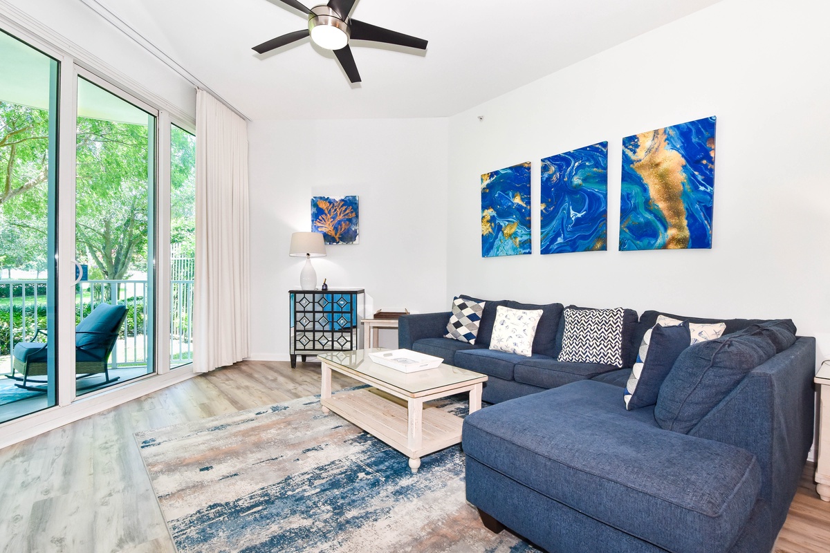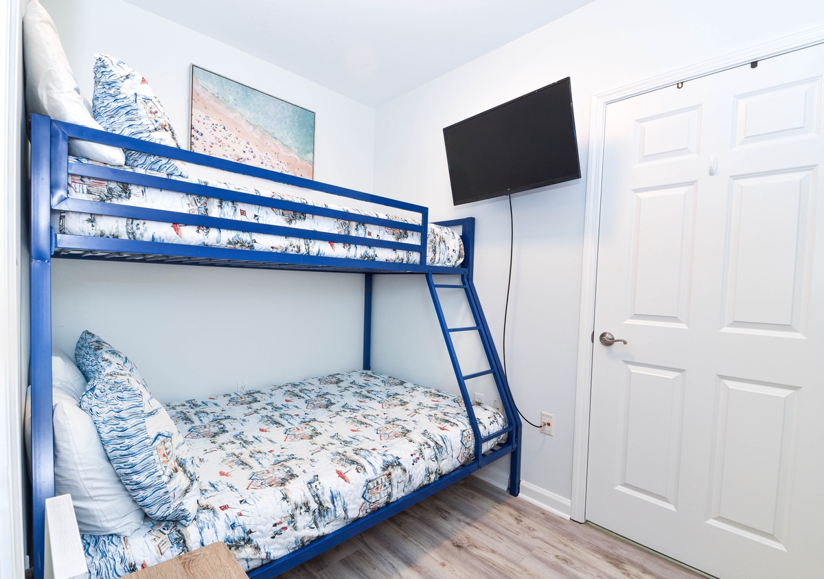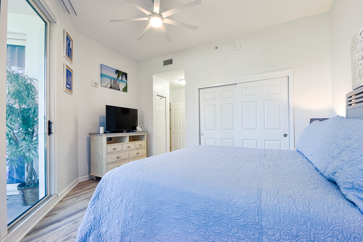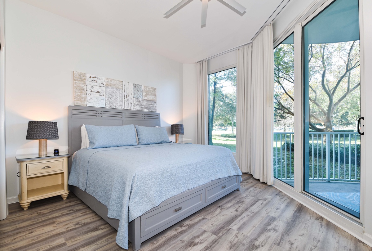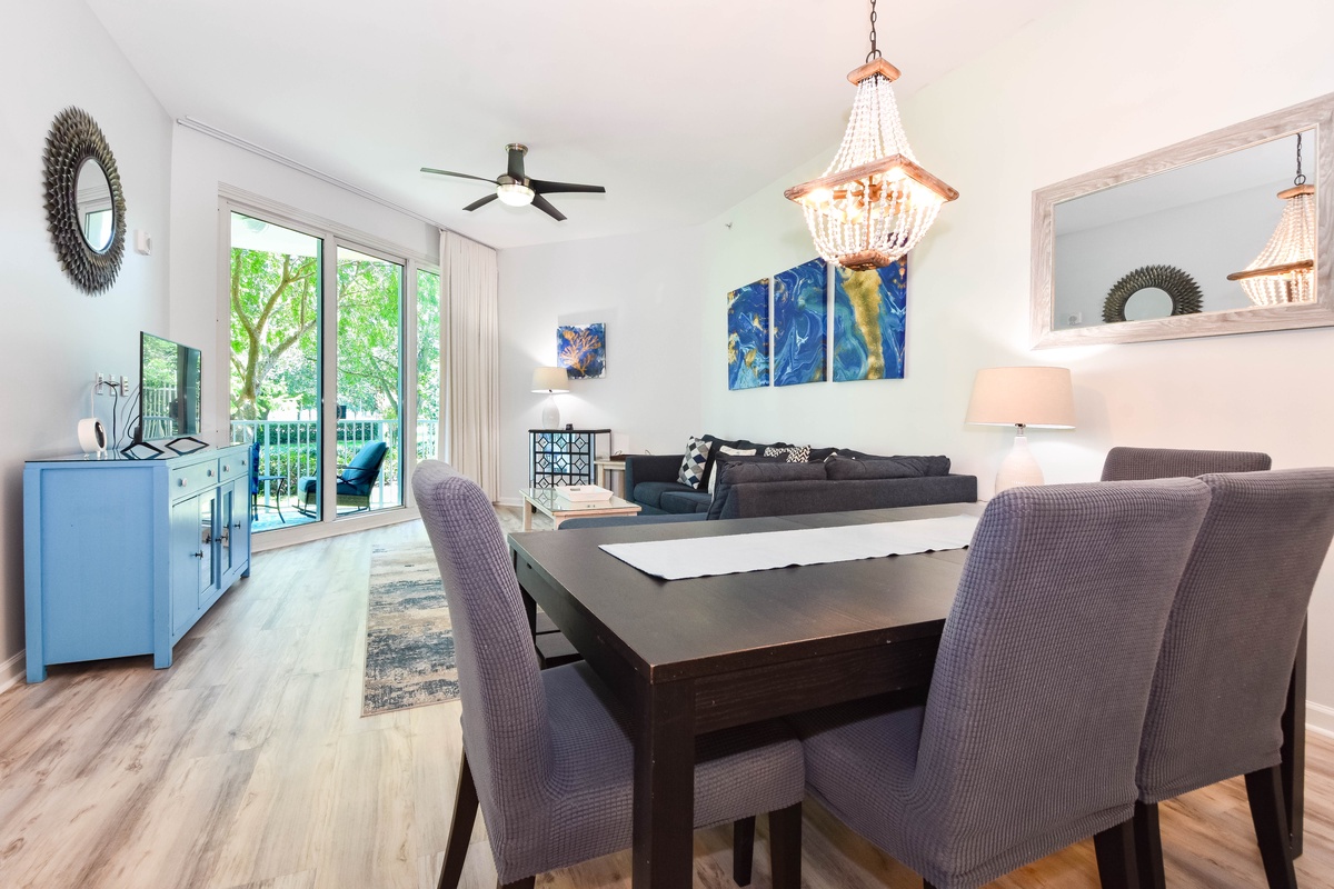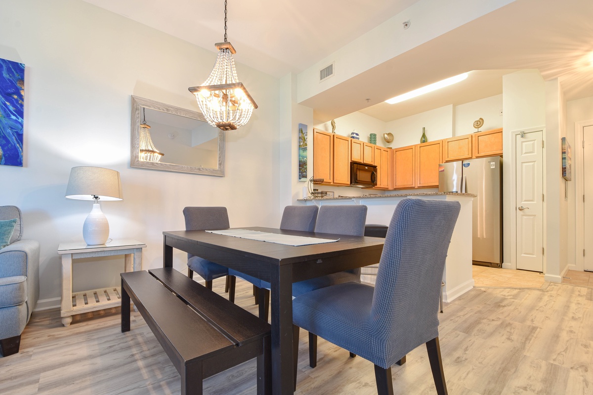 Welcome to The Palms of Destin 2104 Junior. Enjoying the conveniences of staying on the ground floor while being a short stroll away from the pool, families with young children will find ease in not having to use the elevator. This coastal inspired two-bedroom, two-bathroom condo features an open concept living and dining space, flat screen TVs, and private patio. The spacious kitchen offers plenty of counter space with a breakfast bar, perfect for whipping up a delicious meal. Relax in the spacious primary suite with a king bed, patio access, and attached bathroom with a tub/shower combo. The guest bedroom offers a twin over full bunk bed plus an attached bath with a walk-in shower. With a sleeper sofa in the living room, this serene condo can sleep up to six guests comfortably. For added convenience there is a washer and dryer plus a welcoming starter kit. Come make lasting memories at The Palms of Destin 2104.