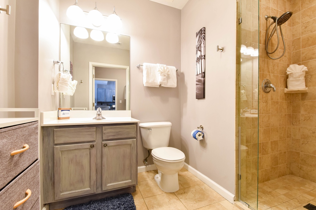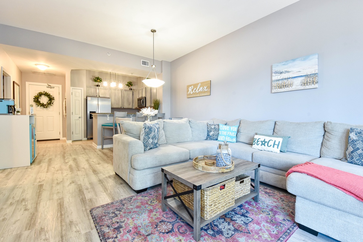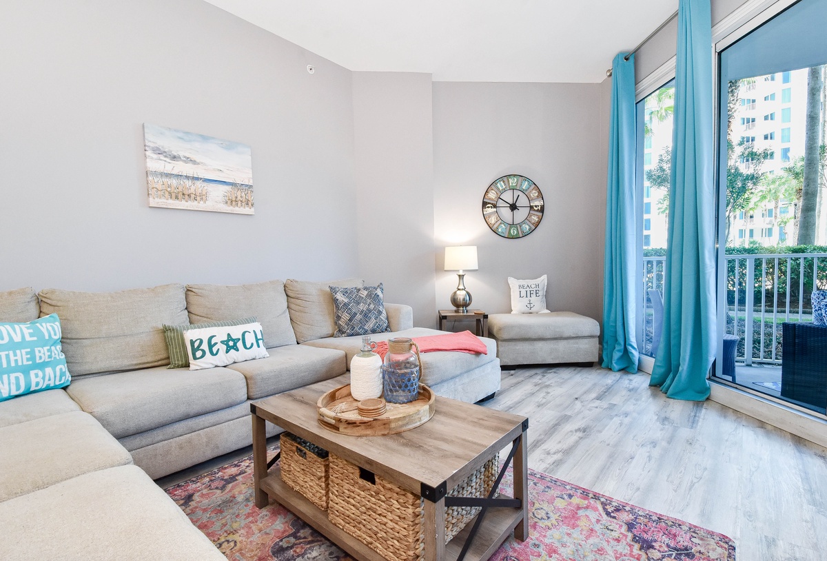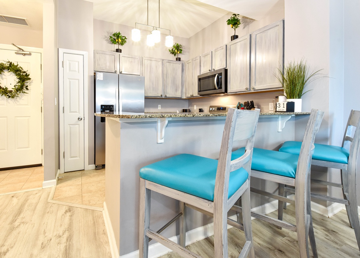 Welcome to The Palms of Destin 2107 Junior, your coastal retreat in the heart of Destin, Florida. This charming ground-floor condo offers the ultimate convenience for families, especially those with little ones, thanks to easy access without the need for an elevator. Just a short stroll from the resort’s famous lagoon pool and tropical grounds, you’ll love the blend of comfort, style, and location. Step inside this beautifully decorated two-bedroom, two-bathroom Destin vacation rental, where coastal charm meets modern amenities. The open-concept living and dining area is perfect for gathering after a day at the beach, with flat-screen TVs and a private patio for relaxing in the fresh salt air. The fully equipped kitchen features ample counter space and a breakfast bar, ideal for preparing home-cooked meals or quick snacks before heading out to the Emerald Coast's sugar-white beaches. Start your day right with the convenient coffee bar just off the kitchen, complete with a mini fridge, so your favorite creamer and cold brews are always within reach. Unwind in the spacious primary suite, complete with a king bed, private patio access, and an attached bathroom with a tub/shower combo. The guest bedroom offers a full-over-full bunk bed and is conveniently located next to the second bathroom with a walk-in shower. Additional perks include an in-unit washer and dryer, high-speed Wi-Fi, and full access to The Palms of Destin Resort’s premier amenities. Whether you're planning a family beach trip or a laid-back getaway, The Palms of Destin 2107 Junior is your perfect home away from home.