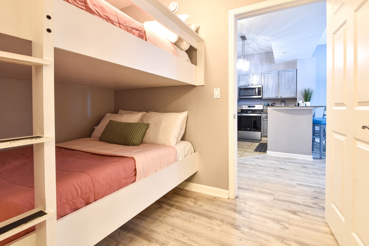 We had an amazing stay at this condo! The ground floor location was perfect..private, quiet, and close enough to enjoy views of the beautiful lagoon pool, all without needing to wait for an elevator (which can be a long wait!). The condo was spotless, nicely updated with comfortable and functional furniture, stocked with every amenity we could think of, from both a Keurig and drip coffee maker to a pack ’n play, vacuum, broom/dustpan (for those sandy feet!), plenty of board games, flat screen TV’s in both rooms, 2 Alexa’s, box fan, and even a portable high chair! The kids loved the full size bunk-over-bunk beds with the TV on the top bunk, and the private patio access from the master bedroom was such a bonus for those late nights when we wanted to sit out on the patio to take in the quiet. The mattresses and bedding were incredibly comfortable, we slept like babies! The walk to the beach was short, safe and easy (8 minutes), and we loved being so close to one of our favorite spots, The Back Porch. The Palms offers fantastic amenities, and check-in was a breeze. We will definitely be back to #2107!