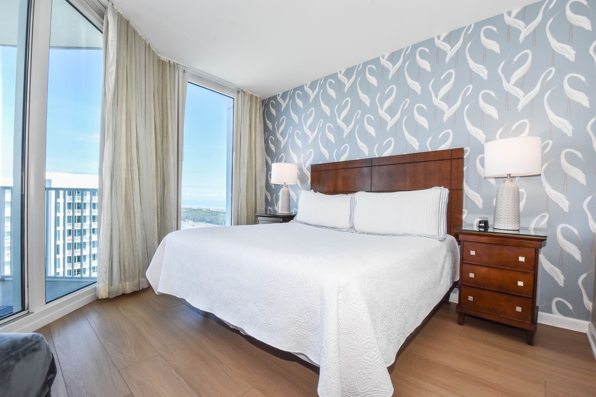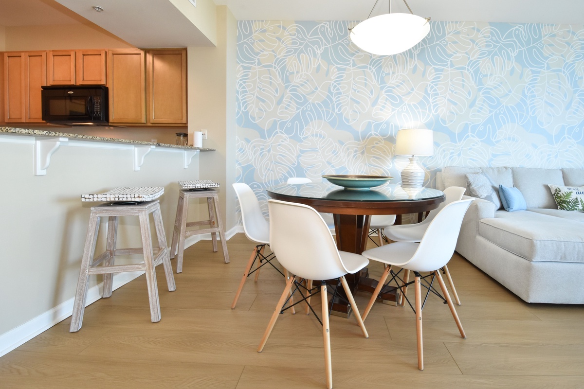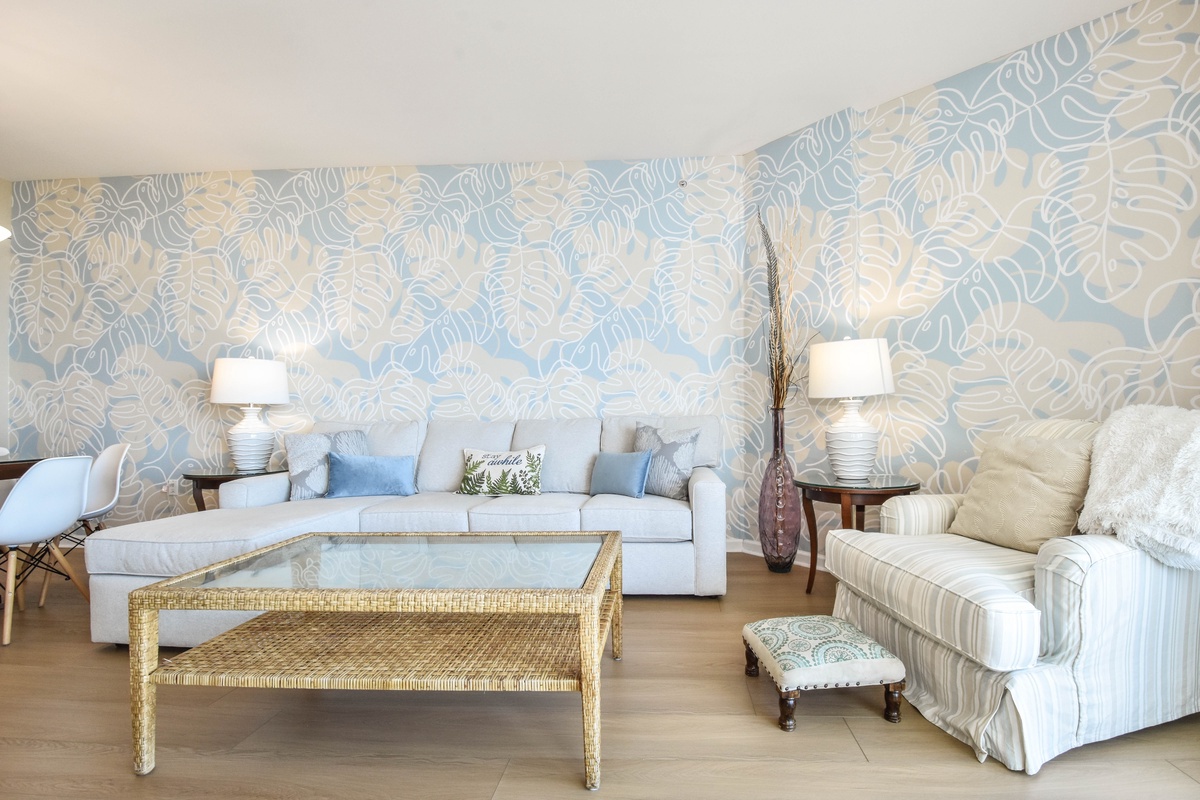 Escape to The Palms of Destin 21213 Junior for your next Destin vacation! This gorgeous 12th floor two-bedroom, two-bathroom condo comfortably sleeps up to six guests and offers the perfect setting for a fun and relaxing getaway. A fully equipped kitchen has everything needed to prepare a delicious meal and to enjoy around the dining table for six with additional seating for two at the bar. Slide open the glass doors and step out onto your private balcony, where you can unwind with views of the gulf and the large lagoon pool, a fabulous spot to sip your morning coffee or wind down in the evening. After a day of soaking up the sun, step into the living area where fun wallpapered walls make for a perfect background. Kick back on cozy furniture and enjoy a movie on the flat-screen TV or gather the group for a cozy game night. Unwind in the primary bedroom which features unique wallpaper, a king bed, flat-screen TV, direct balcony access, and a private bathroom with a tub/shower combo. The guest bedroom includes a full bed and is just steps away from a second bathroom with a spa-like walk-in shower. For added conveniences there is also a sleeper sofa in the living room, a washer and dryer, complimentary WiFi, and full access to The Palms of Destin’s resort-style amenities, everything designed to make your vacation seamless and stress-free. Make everlasting memories at the ultimate Destin beach vacation experience at The Palms of Destin 21213!