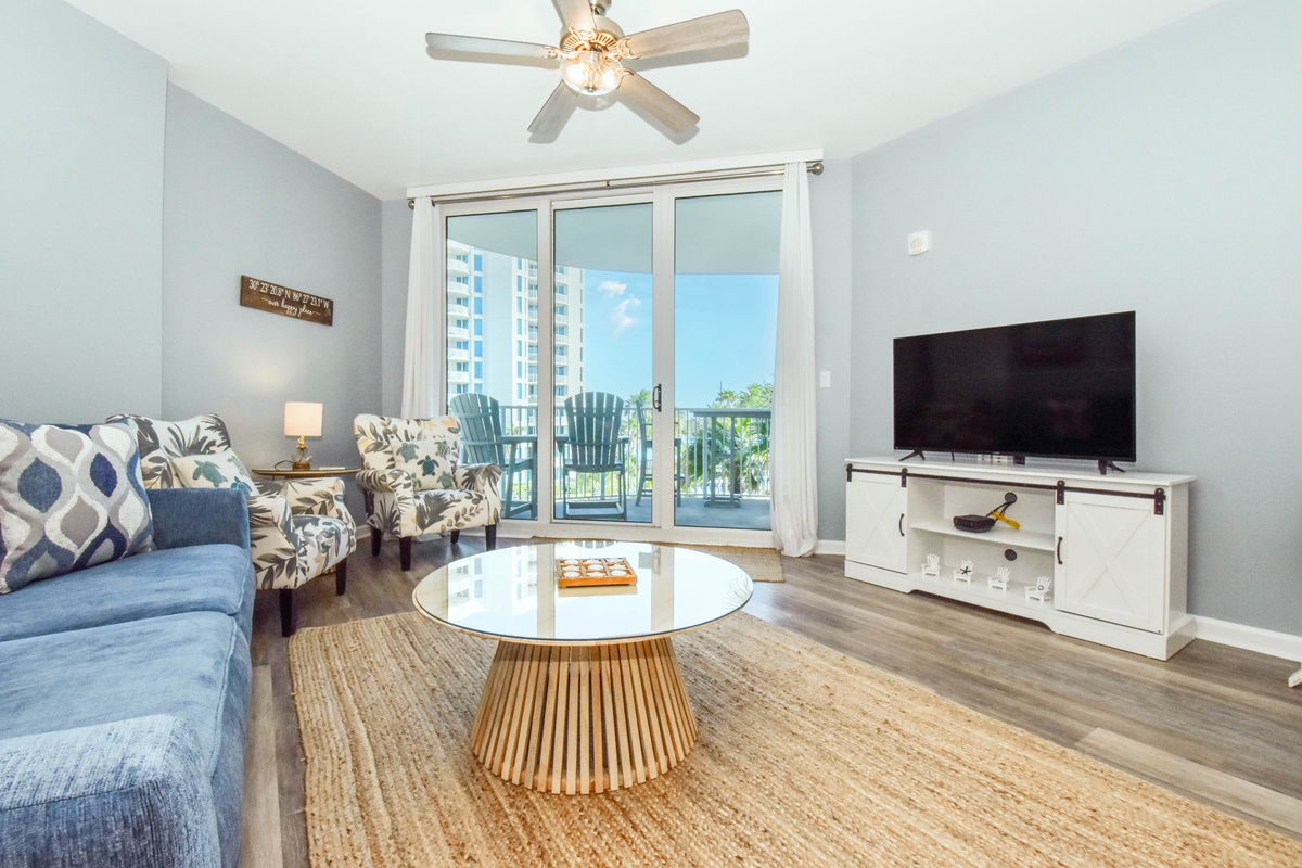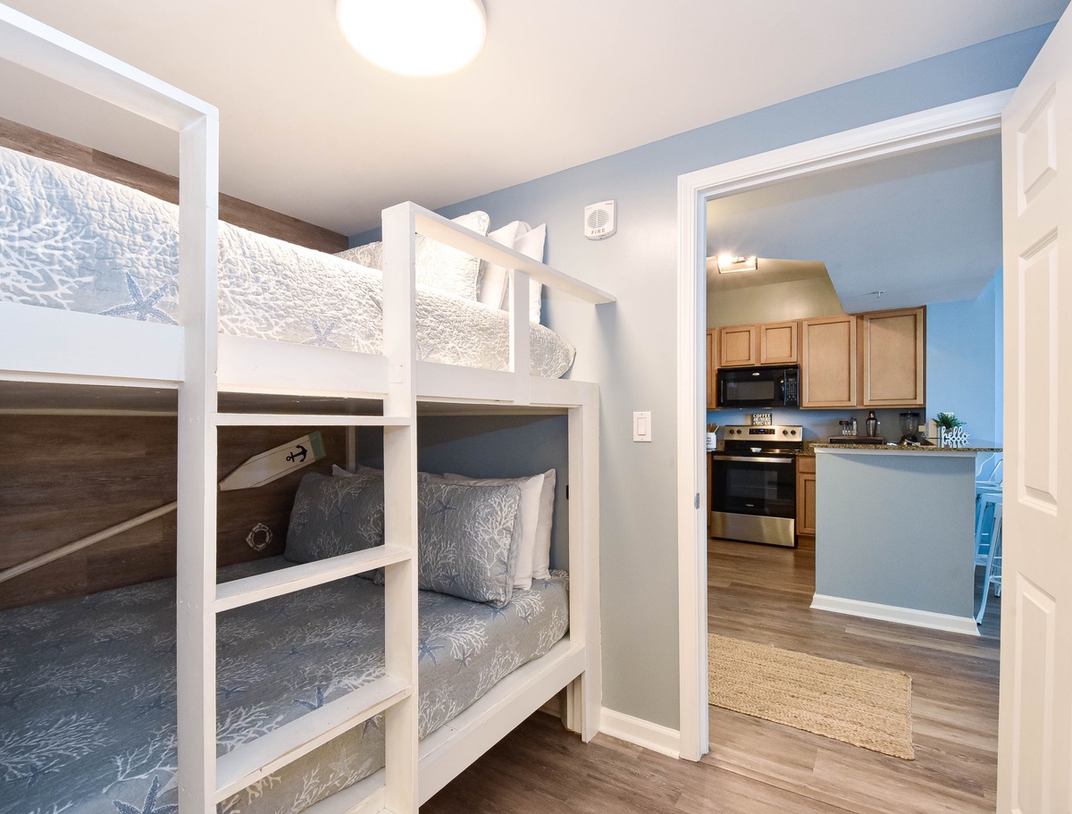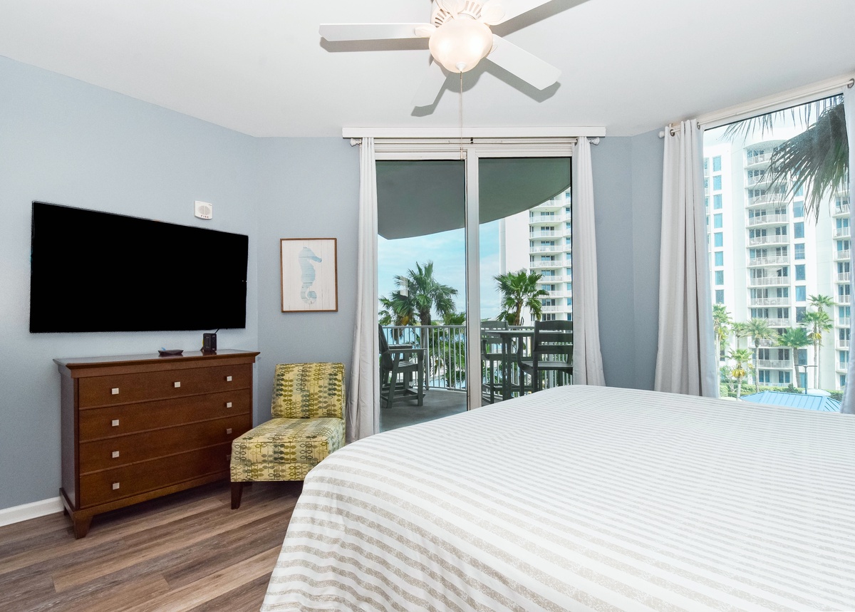 Welcome to The Palms of Destin 2409 Junior, your coastal retreat on the fourth floor in the heart of Destin! This stylish and comfortable two-bedroom, two-bathroom condo sleeps up to six guests and is the perfect home base for your next beachside getaway. Start your morning in the fully equipped kitchen, stocked with everything you need to whip up anything from quick beach snacks to hearty family dinners. Enjoy meals at the dining table for four or gather around the breakfast bar with seating for four ideal for casual bites or your morning coffee. After a fun-filled day in the sun, kick back in the cozy living area and catch your favorite show on the flat-screen TV, or step out onto the private balcony and soak in serene views of the resort’s sparkling lagoon pools. The spacious primary suite offers a king bed, balcony access, a flat-screen TV, and a private bathroom with a convenient tub/shower combo. The guest bedroom features a full-over-full bunk bed and is just steps from a second bathroom with a walk-in shower, plus an additional sleeper sofa in the living room for added guests. With added conveniences like a washer and dryer, free WiFi, and access to all of The Palms of Destin’s resort-style amenities, all designed to make your vacation easy and enjoyable. Make lasting memories at The Palms of Destin 2409 where coastal comfort meets carefree vacation living!