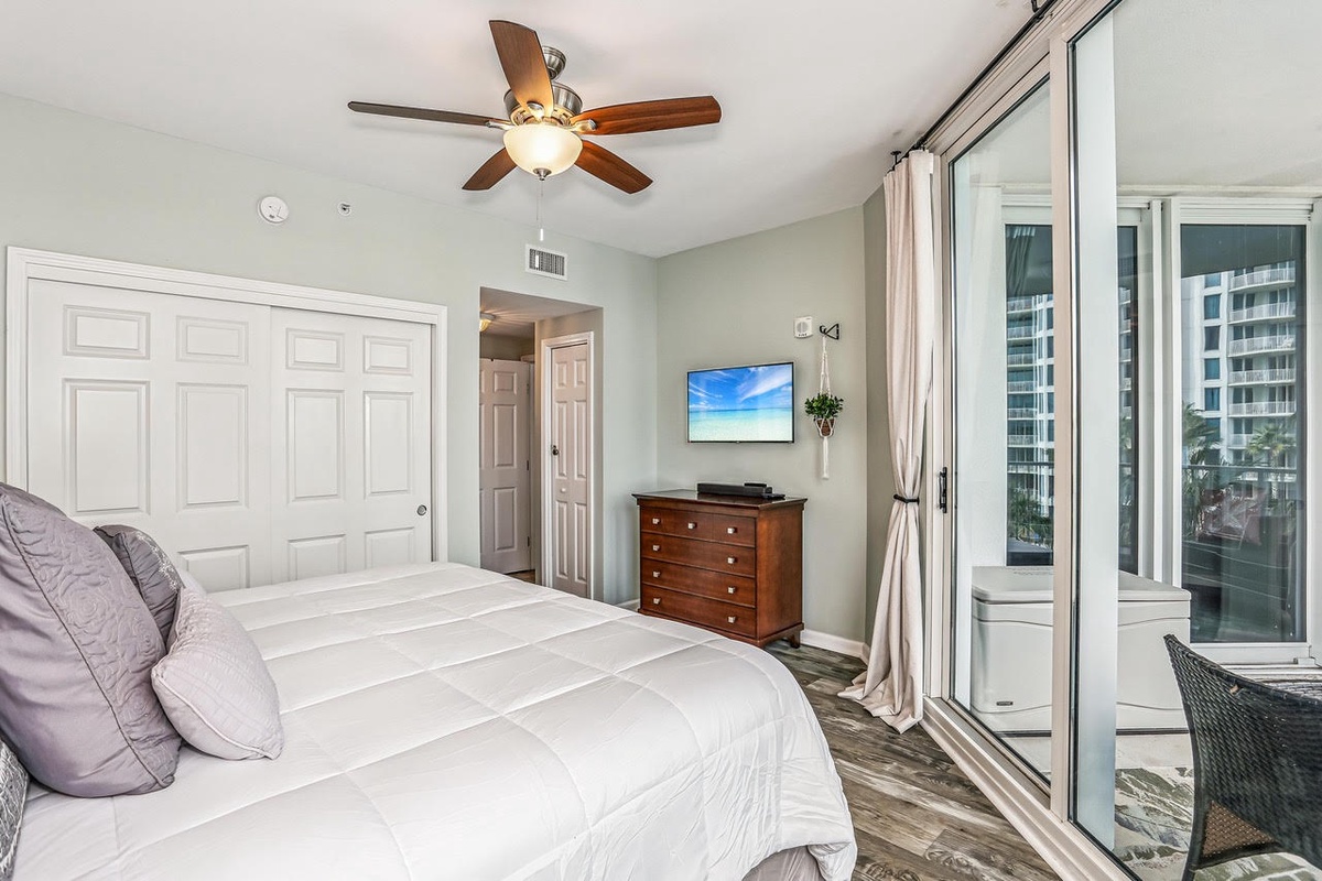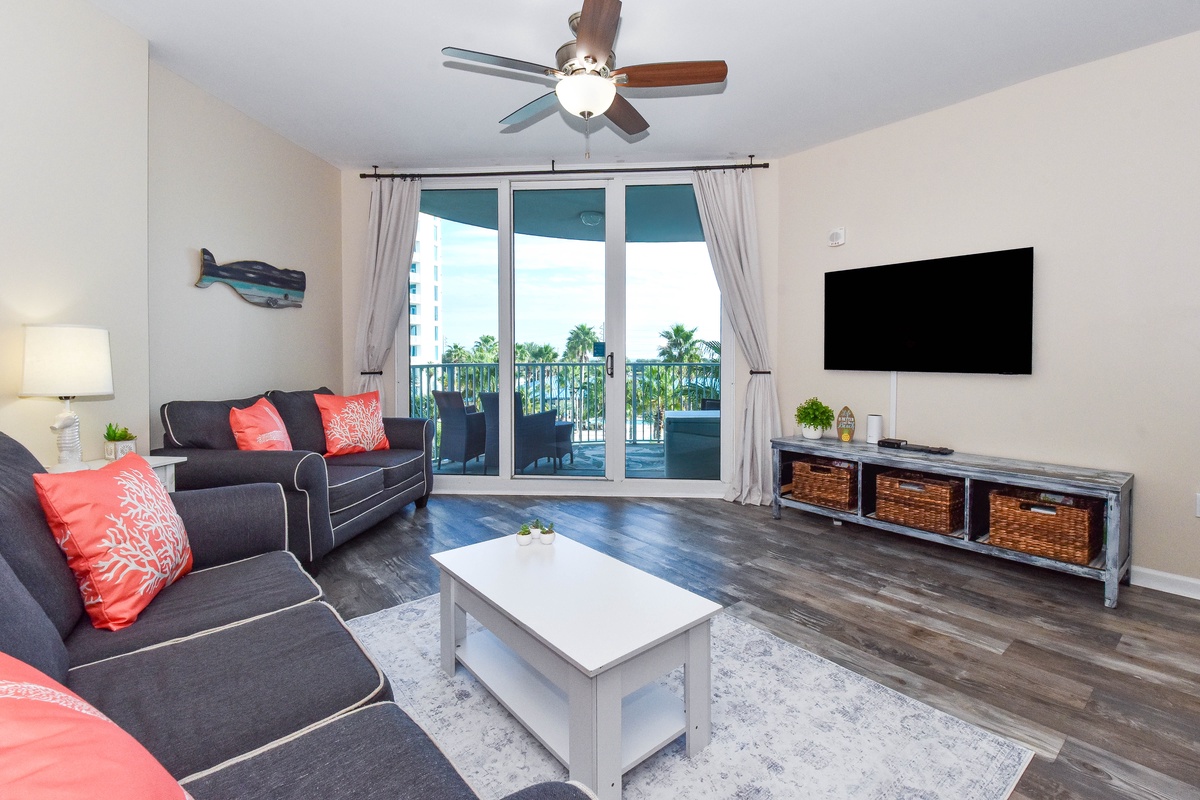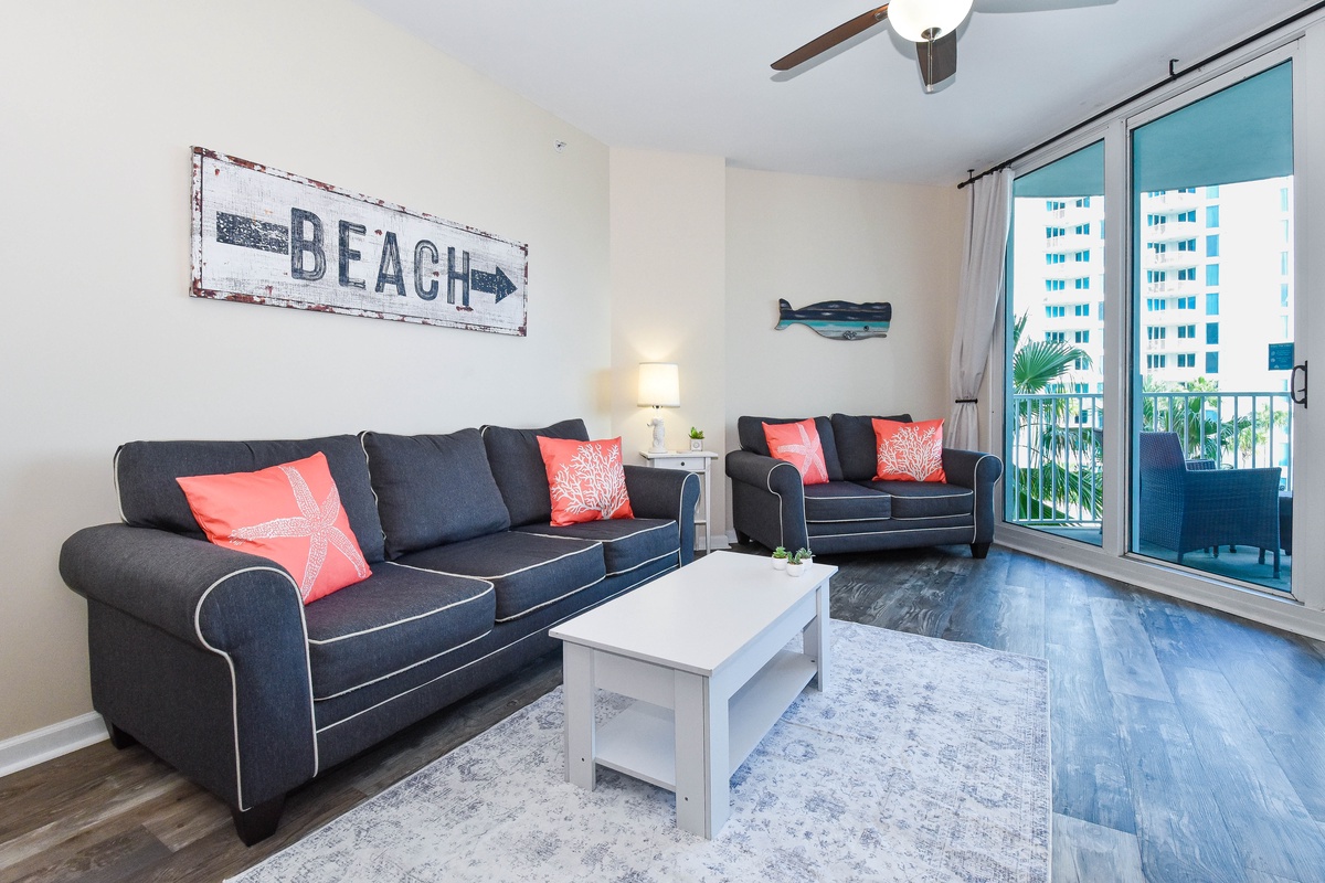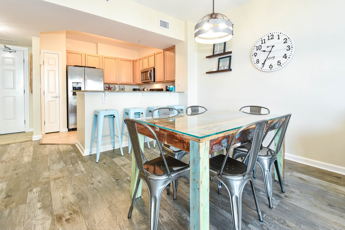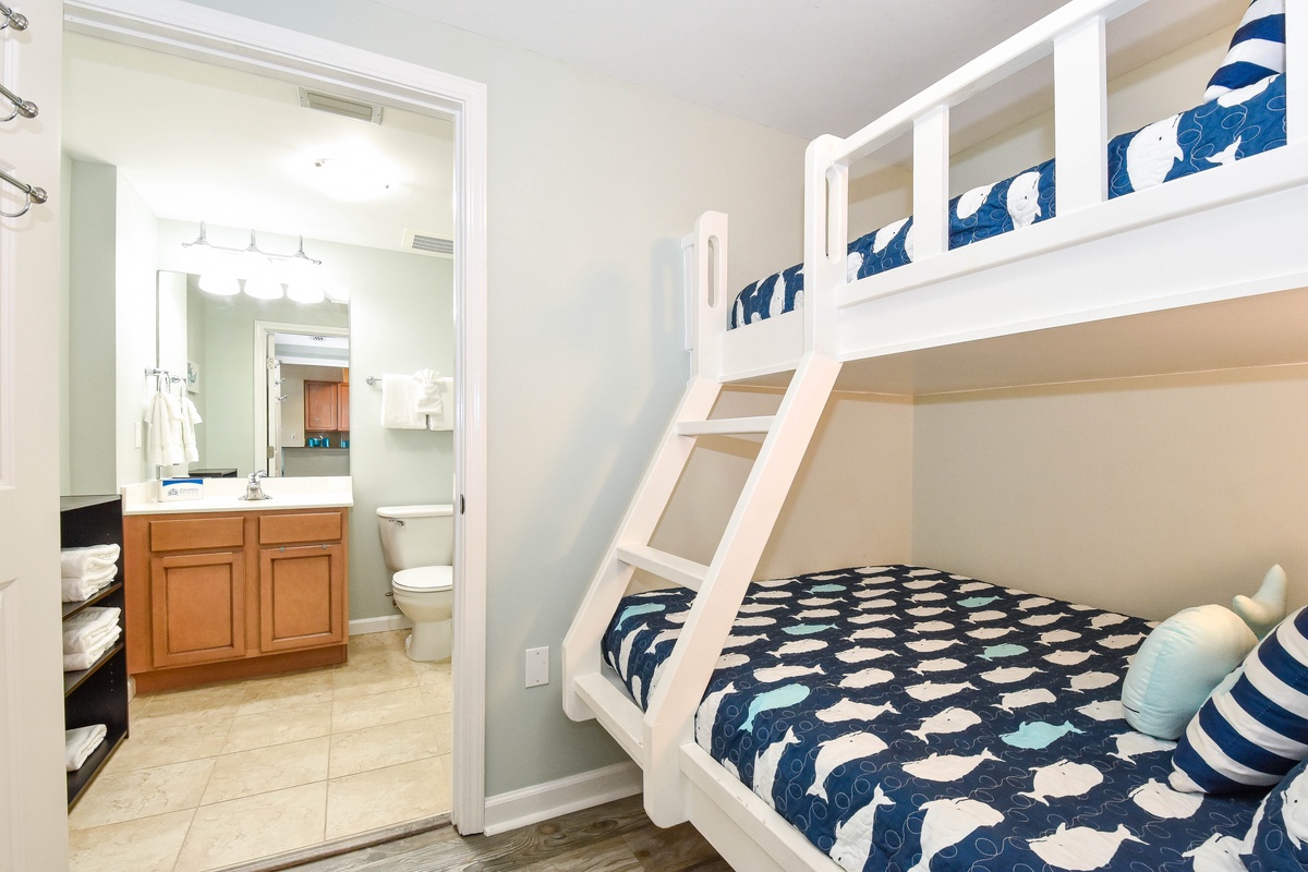 Welcome to The Palms of Destin 2411 Junior, your stylish and serene coastal getaway in the heart of Destin! This fourth-floor contemporary two-bedroom, two-bathroom condo comfortably sleeps up to six guests and offers everything you need for the perfect beach escape. After a sun-soaked day, kick back and relax in the cozy living area catching your favorite show on the flat-screen TV or step out onto the balcony to enjoy peaceful views of the sparkling lagoon pool area. The fully equipped kitchen has everything you need to whip up a quick bite or a family meal, with a dining table, that seats six with additional seating at the bar for four, nearby for gathering and reconnecting. The spacious primary suite features a king bed, private balcony access, a flat-screen TV, and an attached bathroom with a convenient tub/shower combo. The guest bedroom is perfect for kids or additional guests, with a twin-over-full bunk bed and access to a nearby bathroom with a walk-in shower. Enjoy all the comforts of home with a washer and dryer, free WiFi, and resort-style amenities just steps away. Make unforgettable memories at The Palms of Destin 2411 on your next Destin beach vacation!