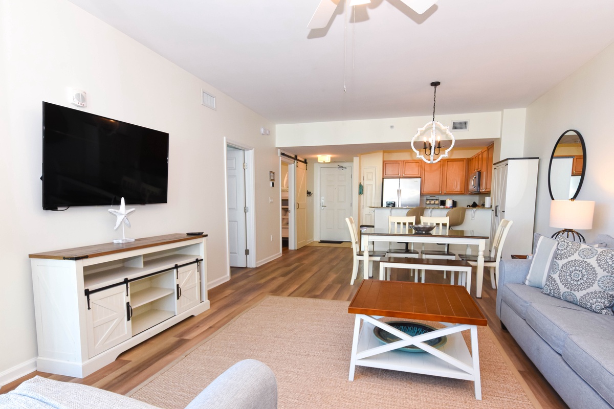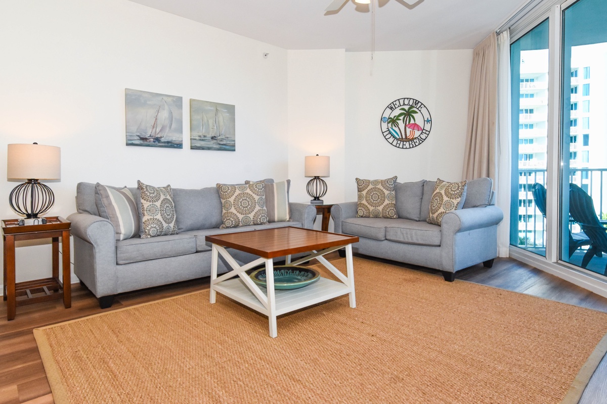 Welcome to The Palms of Destin 2607 Junior, a beautiful two-bedroom, two-bath coastal getaway that comfortably sleeps up to six guests. Relax on the sixth-floor balcony, where plenty of seating lets you take in views of Destin’s largest lagoon pool, along with a glimpse of the gulf. Whether you’re whipping up quick snacks for the beach or preparing a full meal, the fully equipped kitchen with stainless steel appliances has everything the chef in the group will need. The charming dining table seats six with a bench seat offering a cozy spot for meals. After a day in the sun, relax in the cozy living area and gather for a game or sink into the sofa and watch your favorite movie. An inviting primary bedroom includes a king bed, balcony access, flat-screen TV, and an attached bathroom with a tub/shower combo. The second bedroom offers a cozy full-over-full bunk bed and a flat-screen TV, while extra sleeping space on the sleeper sofa in the living area is perfect for laid-back beach nights. For added convenience, there is an additional bathroom off the guest bedroom with a walk-in shower, in-unit laundry, and secure WIFI. Book your stay at The Palms of Destin 2607 today and enjoy a relaxed coastal getaway in Destin, just minutes from the beach.