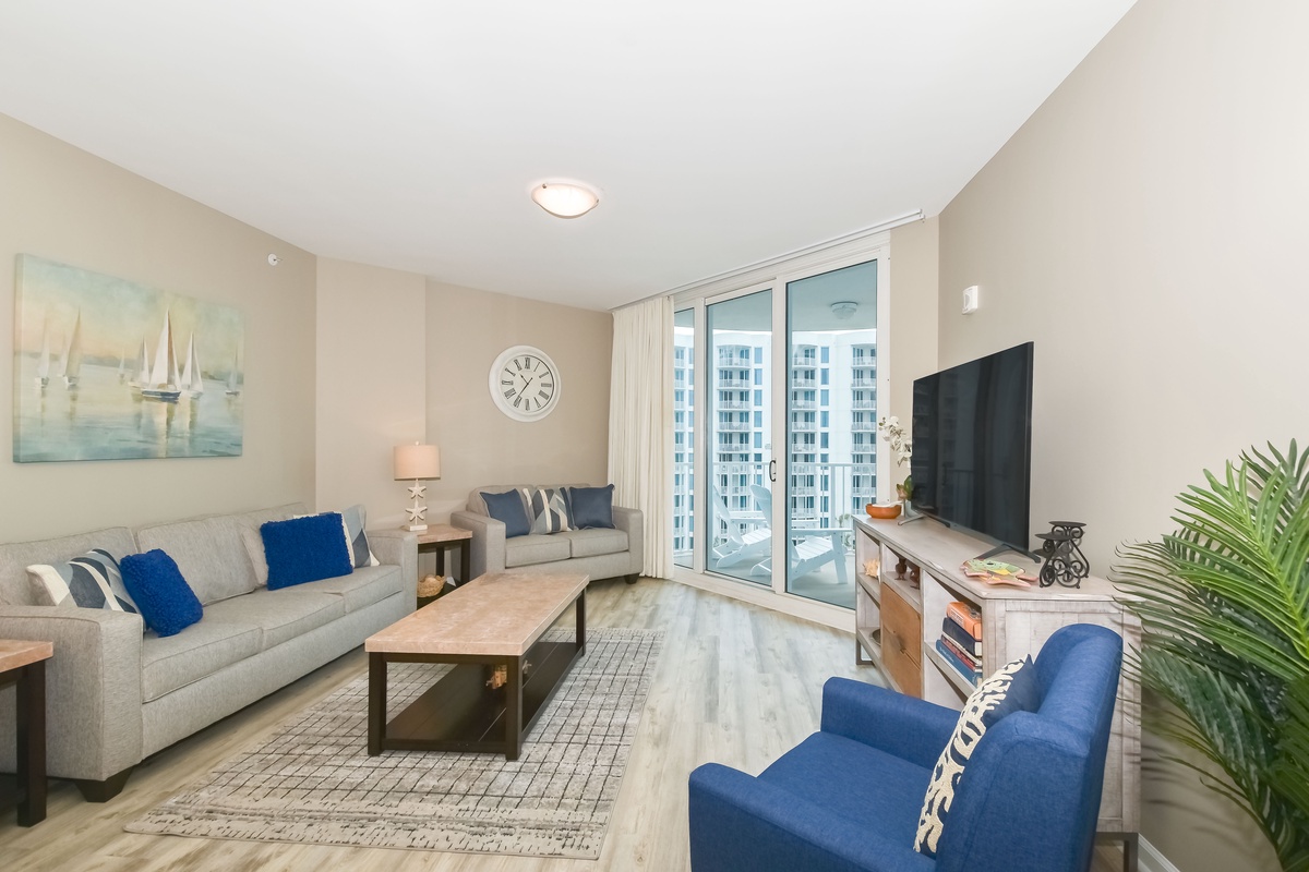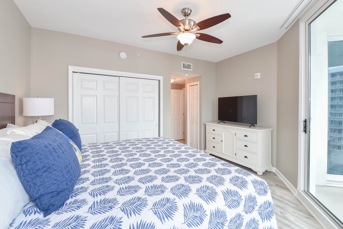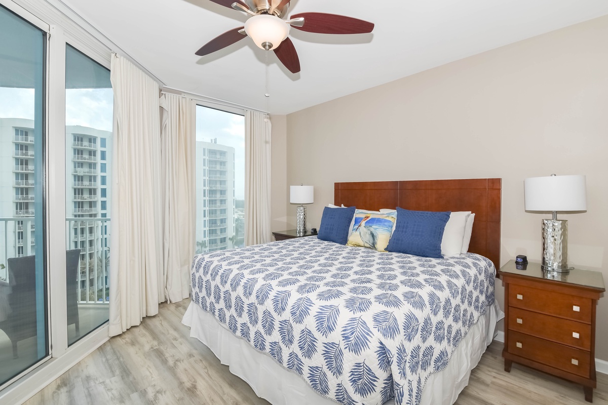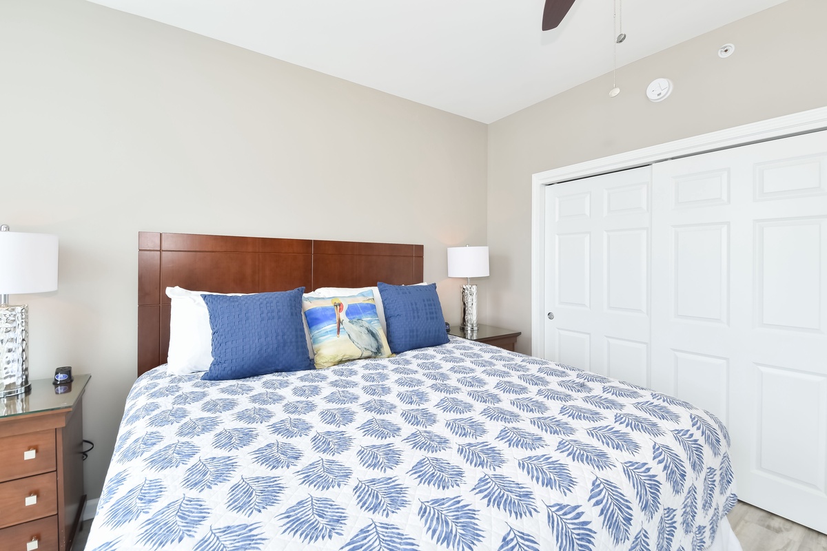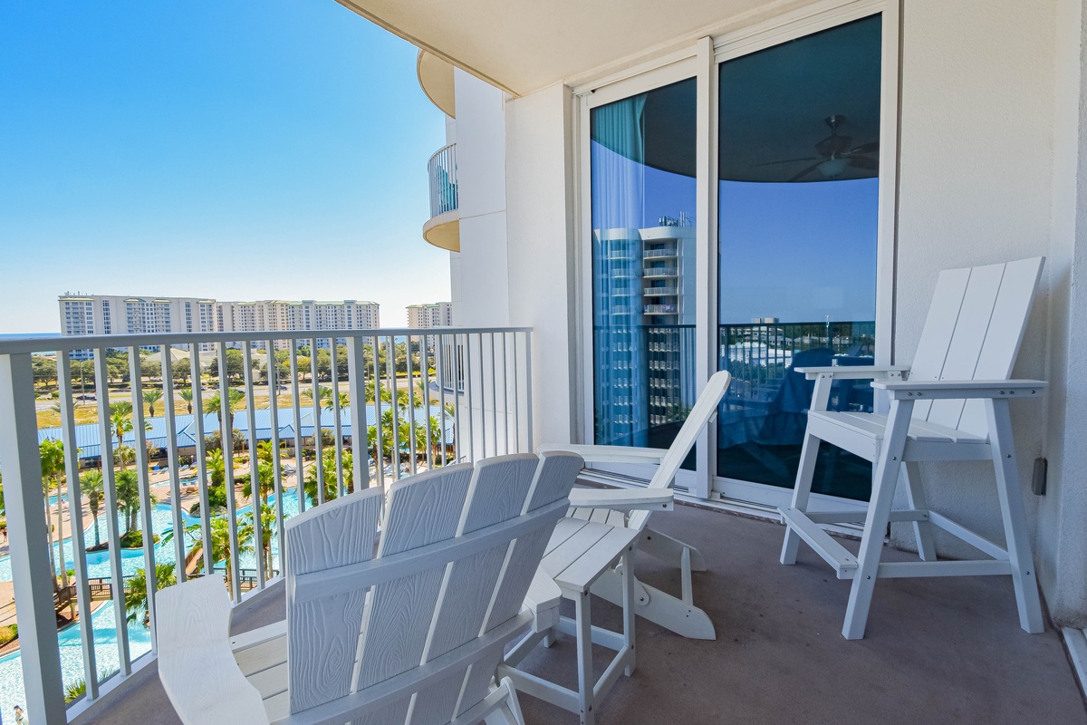 Welcome to The Palms of Destin 2807 Junior. This two-bedroom two bath sleeps up to six guests comfortably. Take in views of the lagoon pool and the gulf from this eighth floor balcony. A fully equipped kitchen makes meal prep easy whether you are packing a cooler for the beach or whipping up a delectable meal to be shared around the table. The dining table seats four guests with additional seating for three at the breakfast bar. Unwind in the living area with a movie on the flat-screen TV with popcorn and your favorite candies. Relax in the primary bedroom featuring a king bed, balcony access, flat screen TV, plus an attached bathroom with a tub/shower combo. The second bedroom offers a full bed with an additional sleeper sofa in the living area. For added convenience this condo features an additional bathroom with a walk-in shower, in unit laundry, and secure WIFI. Make your lasting beach memories at The Palms of Destin 2807.