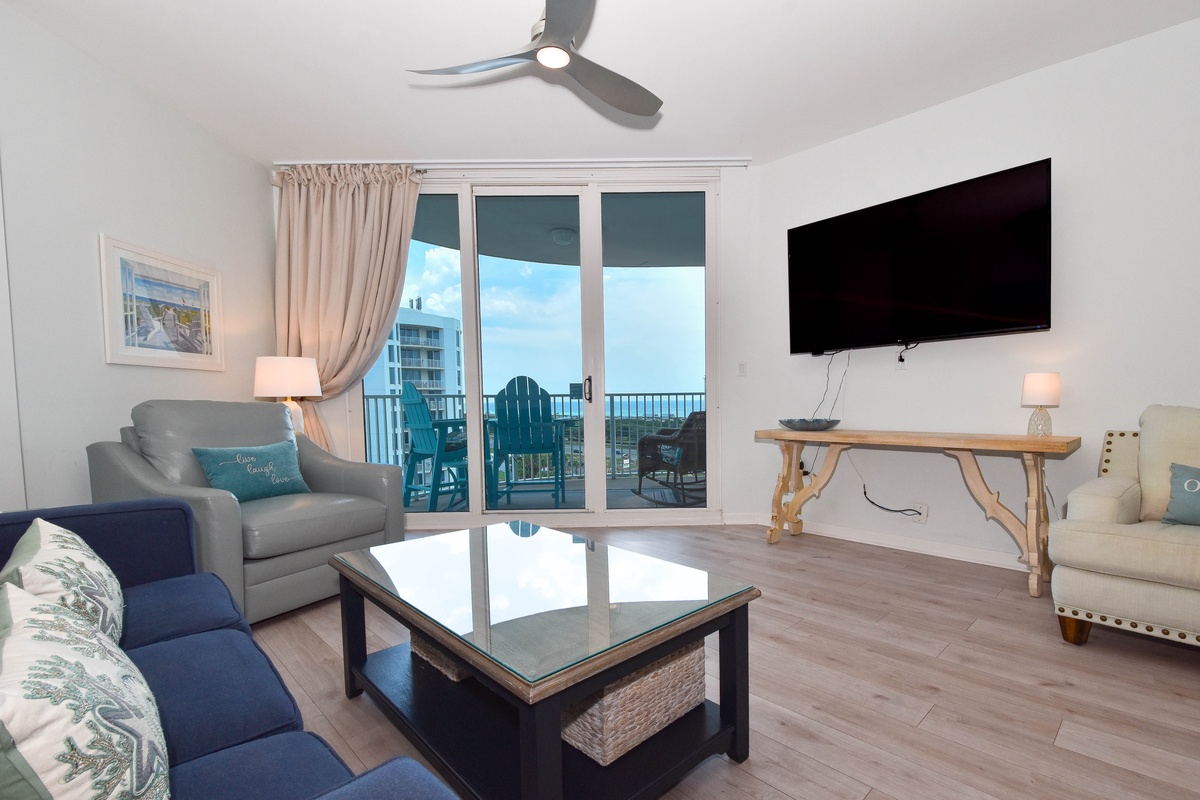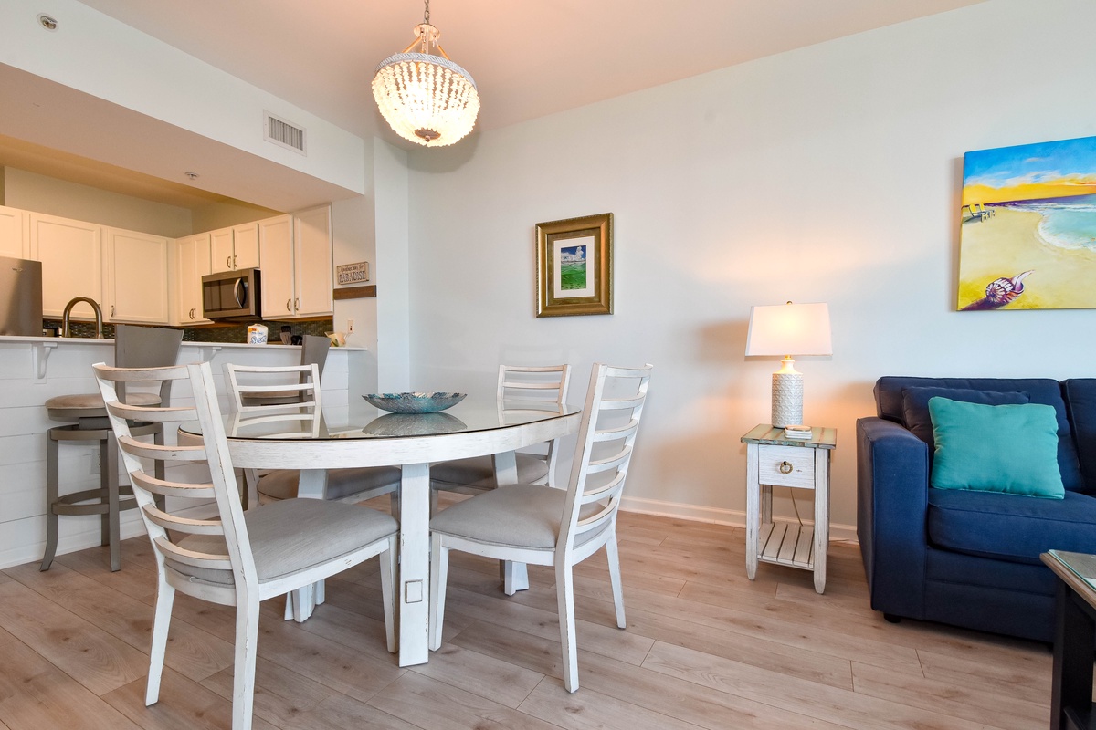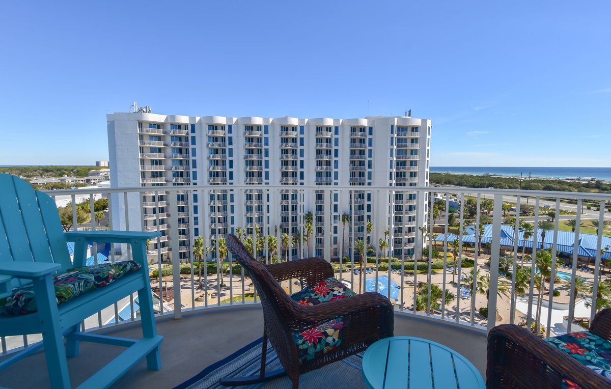 Welcome to The Palms of Destin 2909 Junior, your charming coastal retreat perched on the ninth floor, offering serene views of the sparkling lagoon pool and a glimpse of the Gulf beyond. This delightful condo blends the comforts of home with the relaxed elegance of a beach escape, perfect for creating unforgettable memories with family or friends. Step into a fully equipped kitchen, where stainless steel appliances and thoughtful touches invite the chef in your group to whip up everything from quick beach-day bites to hearty family dinners. Gather around the dining table for four to share meals and laughter or enjoy laid-back breakfasts and snacks at the bar with seating for two. The cozy living area is ideal for movie nights, board games, or simply unwinding after a day of fun at the beach. The serene primary suite includes a king bed, flat-screen TV, private balcony access, and an attached bath featuring a tub/shower combo. A guest bedroom offers a twin-over-full bunk bed, and the living room includes a sleeper sofa, allowing the space to comfortably sleep up to six guests. Additional features include a second full bathroom with a walk-in shower, an in-unit washer and dryer for your convenience, and secure WiFi to keep you connected when you want to be. Whether you're sipping morning coffee on the balcony, lounging by the resort-style pool, or exploring the sugar-white sands of Destin, The Palms of Destin 2909 is your home base for coastal comfort and sunshine-filled memories.